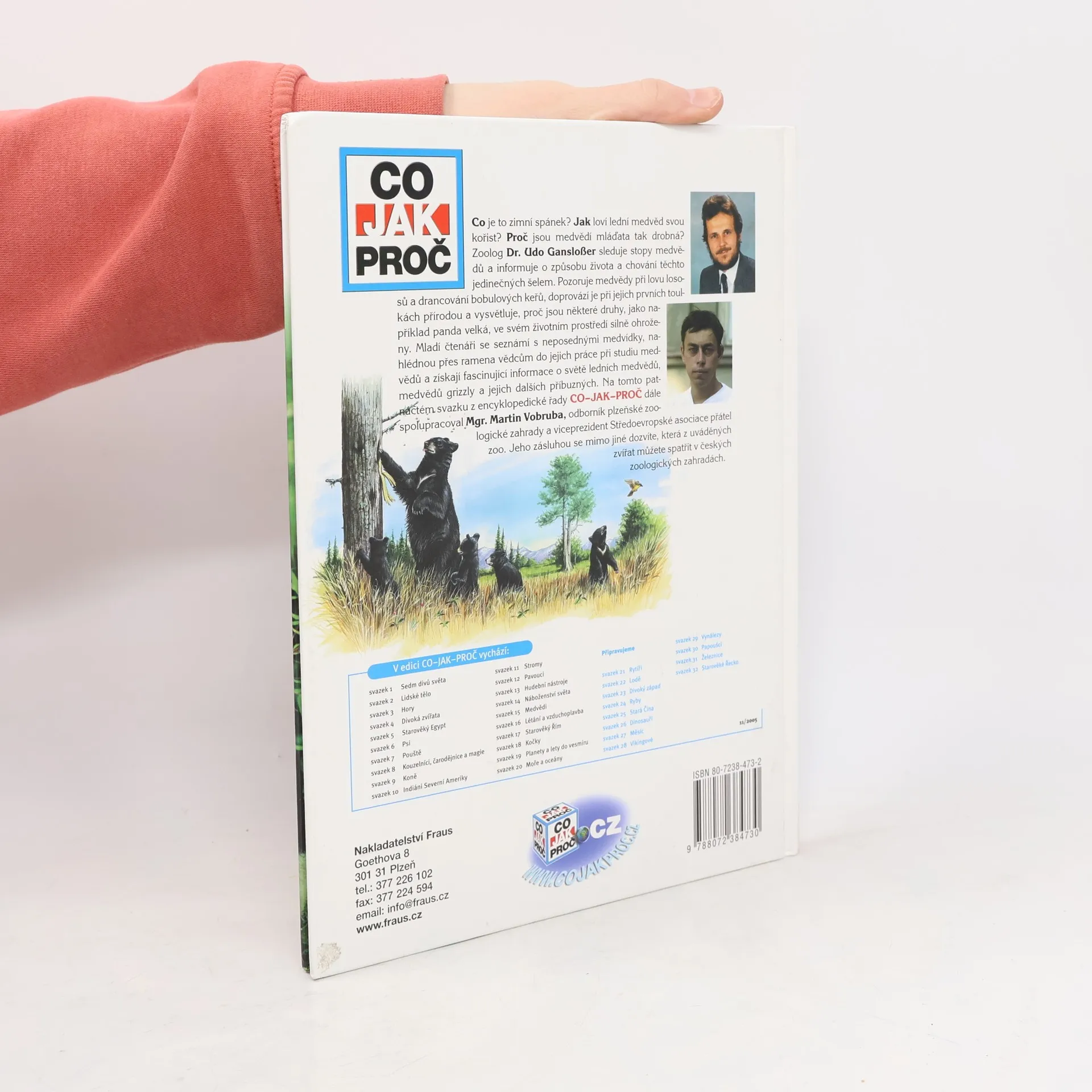 Co je to zimní spánek? Jak loví lední medvěd svoji kořist? Proč jsou medvědí mláďata tak drobná? Zoolog Dr. Udo Gansloßer sleduje stopy medvědů a informuje o způsobu života a chování těchto jedinečných šelem. Pozoruje medvědy při lovu lososů a drancování bobulových keřů, doprovází medvědy při jejich prvních toulkách přírodou a vysvětluje, proč jsou některé druhy, jako například panda velká, ve svém životním prostředí silně ohroženy. Mladí čtenáři se seznámí s neposednými medvídky, nahlédnou přes ramena vědcům do jejich práce při studiu medvědů a získají fascinující informace o světě ledních medvědů, medvědů grizzly a jejich příbuzných. Dalším spoluautorem je odborník z plzeňské zoologické zahrady a viceprezident Středoevropské asociace přátel ZOO, Mgr. Martin Vobruba. Jeho zásluhou se mladí čtenáři mimo jiné dozvědí, která z uváděných zvířat lze nalézt a spatřit v českých zoologických zahradách.