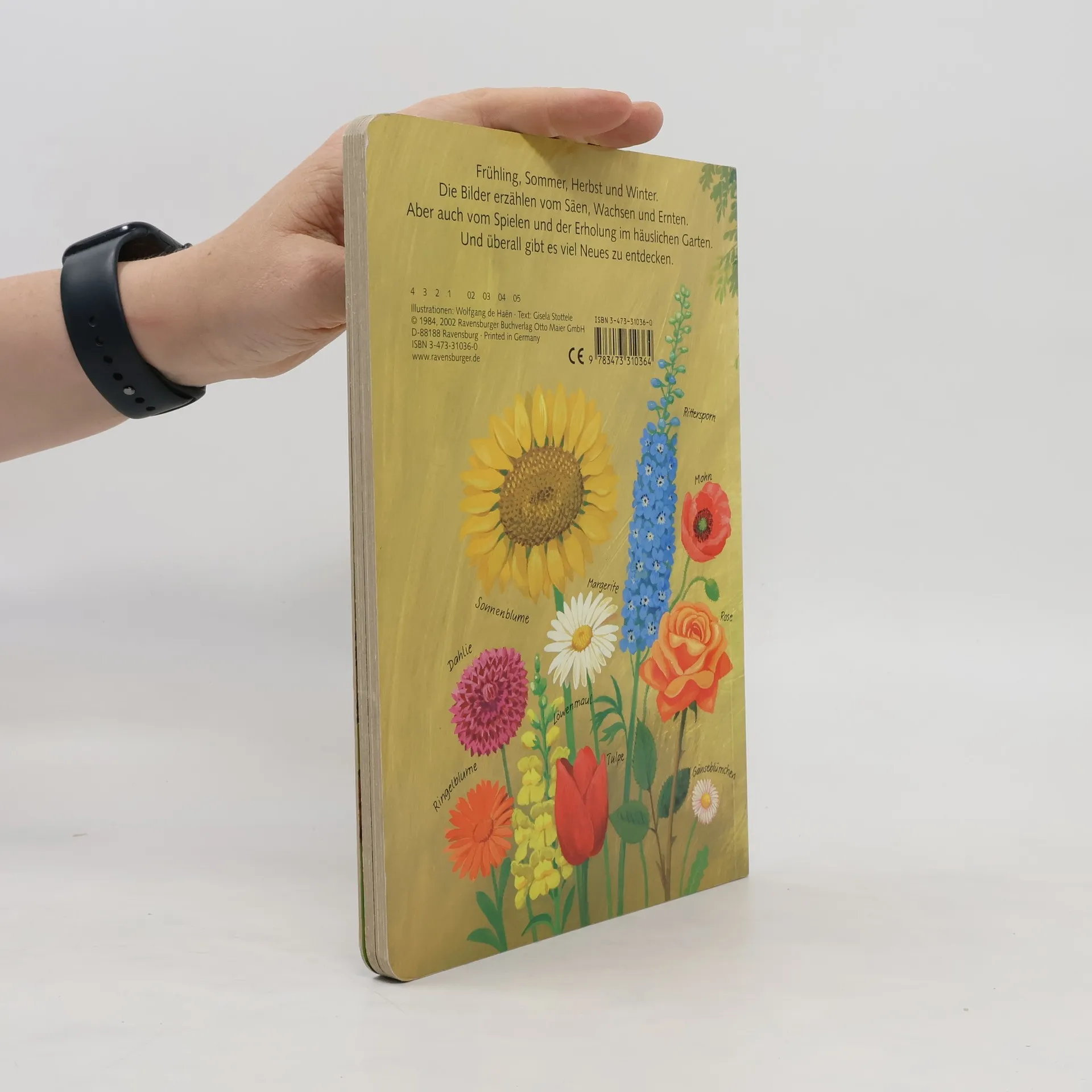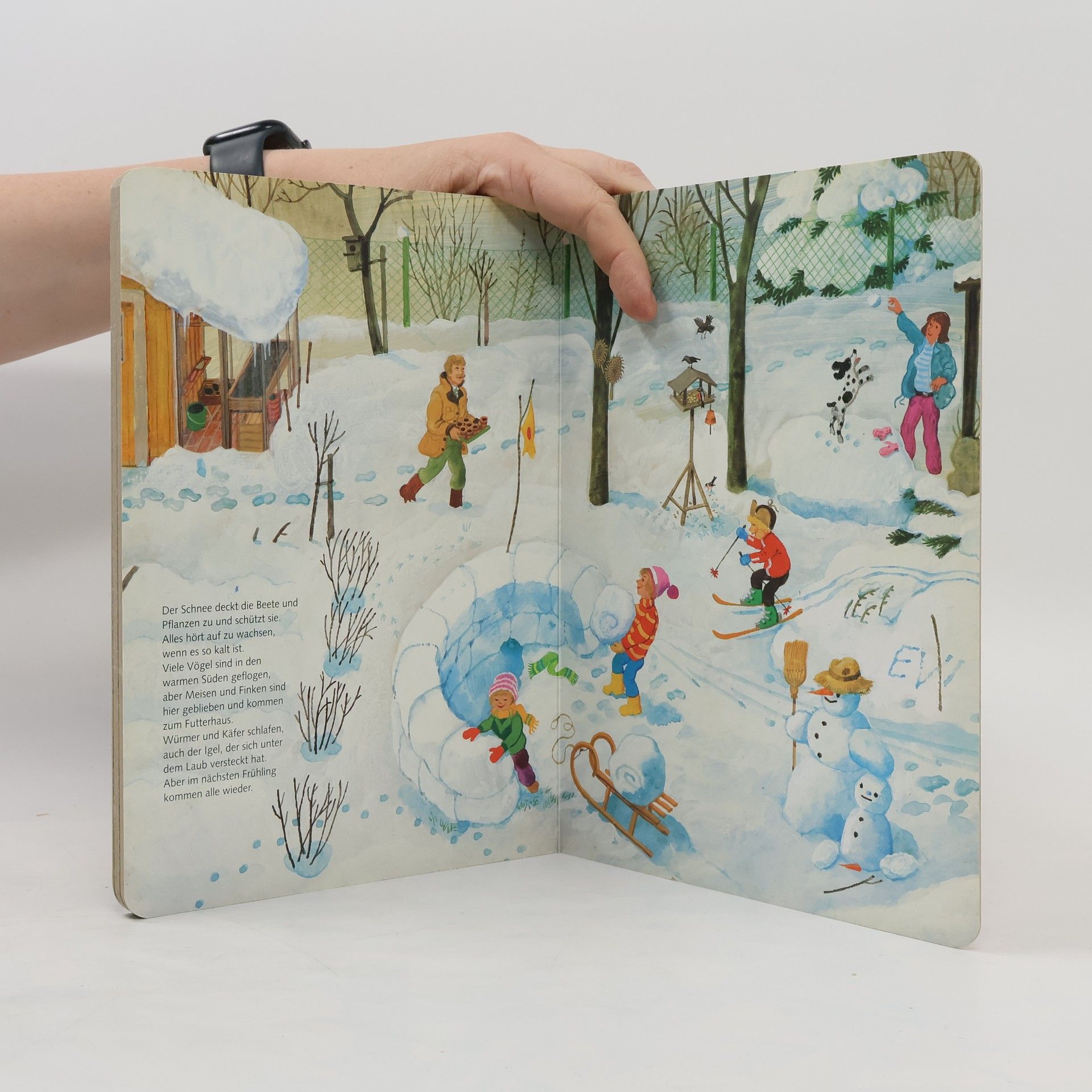 Den Garten rund ums Jahr erleben: pflanzen, ernten, spielen, Feste feiern, Vögel füttern und Schneemann bauen. Auf großformatigen Schaubildern sind Beete, Blumen und Bäumen im Jahreslauf zu sehen. Am Bildrand werden einzelne Gartengeräte, Früchte und Gemüse dargestellt und benannt.