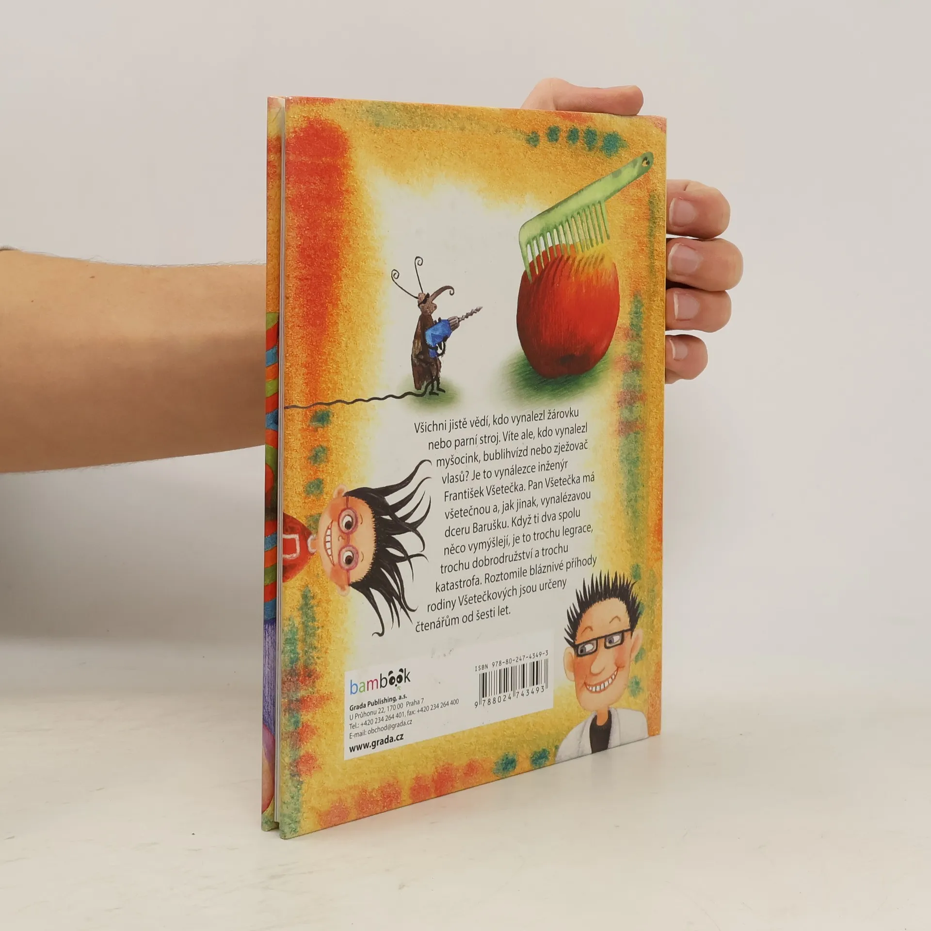 Všichni jistě vědí, kdo vynalezl žárovku nebo parní stroj. Víte ale, kdo vynalezl myšocink, bublihvízd nebo zježovač vlasů? Je to vynálezce inženýr František Všetečka. Pan Všetečka má všetečnou a, jak jinak, vynalézavou dceru Barušku. Když ti dva spolu něco vymýšlejí, je to trochu legrace, trochu dobrodružství a trochu katastrofa. Roztomile bláznivé příhody rodiny Všetečkových jsou určeny čtenářům od šesti let.