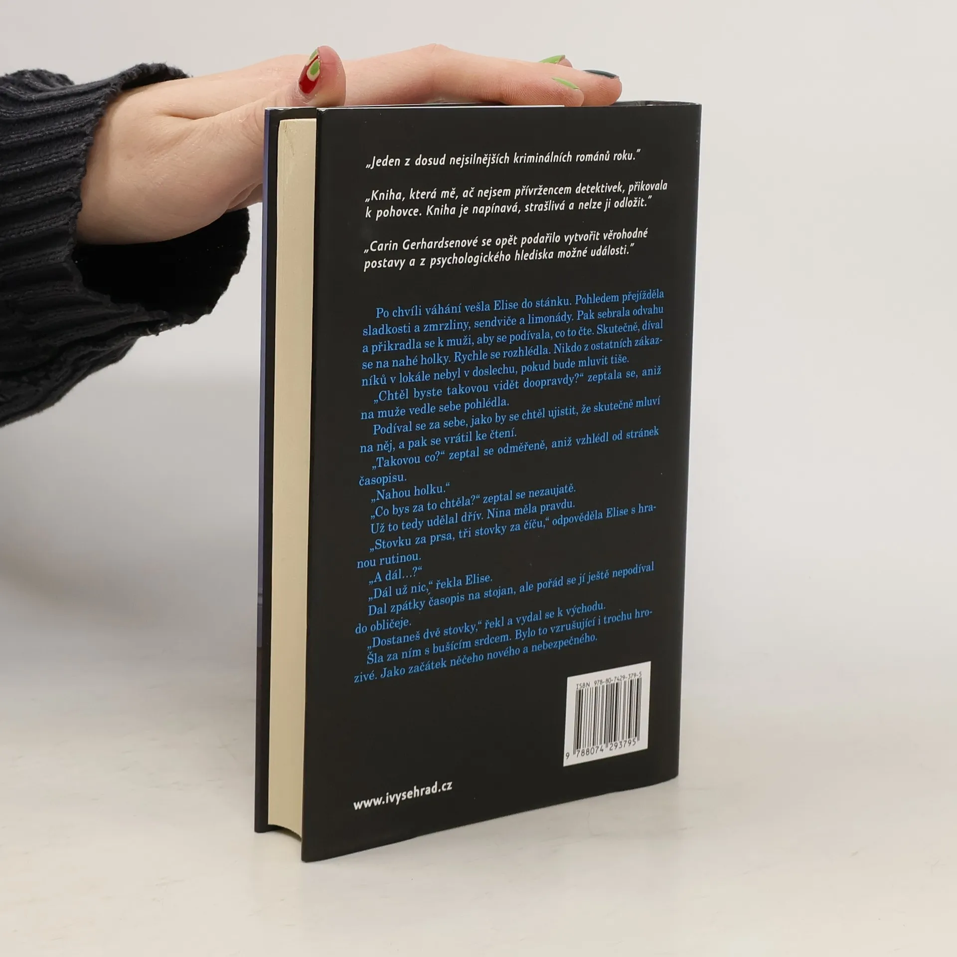 Hammarbyjská série 2 – vražda dívky na trajektu. Hammarbyjská policie ve Stockholmu musí jednat rychle. V krátké době dojde k několika vraždám, které skončí na stole kriminálního komisaře Connyho Sjöberga. Šestnáctiletá dívka z problematické rodiny je nalezena uškrcena na toaletě obřího trajektu, který jezdí mezi Stockholmem a Helsinkami. Její mladší sestra se ocitne v situaci, kterou by žádné čtrnáctileté dítě nemělo zažít. Policistka Petra Westmanová si jde zaběhat a v křoví v parku najde podchlazené nemluvně a nedaleko od něj mrtvou ženu bez dokladů. Nikdo je nepostrádá. Zároveň se jednoho rána vzbudí tříletá holčička a zjistí, že je v bytě úplně sama. Tatínek je v zahraničí a vše nasvědčuje tomu, že maminka vzala malého bratříčka a odstěhovala se. Hanna zůstala sama, zamčená v bytě. A čas běží. Vyprávění Carin Gerhardsen plyne kupředu s rychlými střihy a vysokým tempem, a ani na okamžik čtenáře nepustí ze sevření. Carin Gerhardsen se narodila v roce 1962 v Katrineholmu. Vystudovala matematiku a vždy měla ráda řešení matematických úloh, rébusů a sudoku. Od toho byl jen krok k napsání detektivky, logické a propracované, s věrohodnými postavami. Její romány jí získaly čtenářskou oblibu a v současné době se věnuje pouze psaní. Je vdaná a má dvě děti.