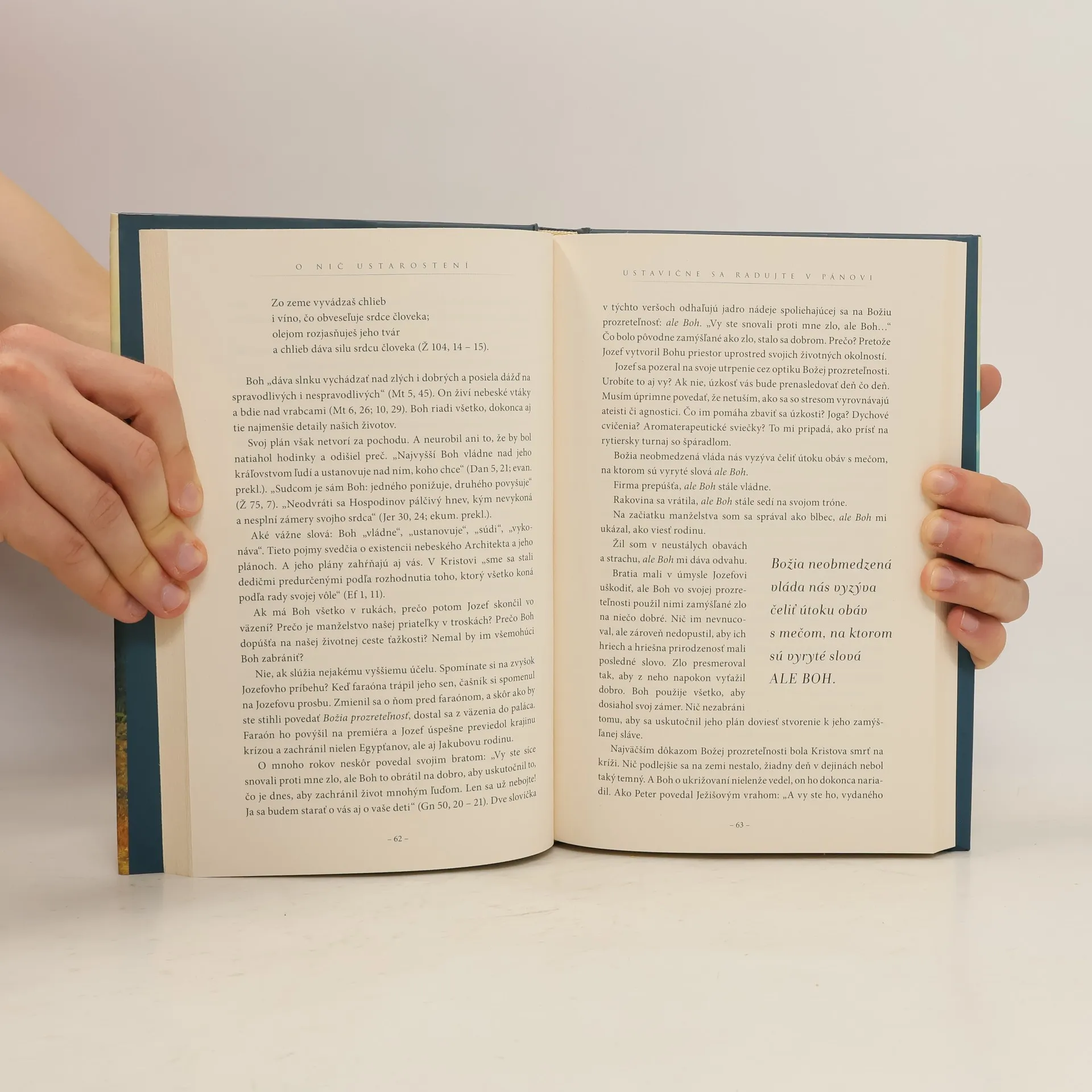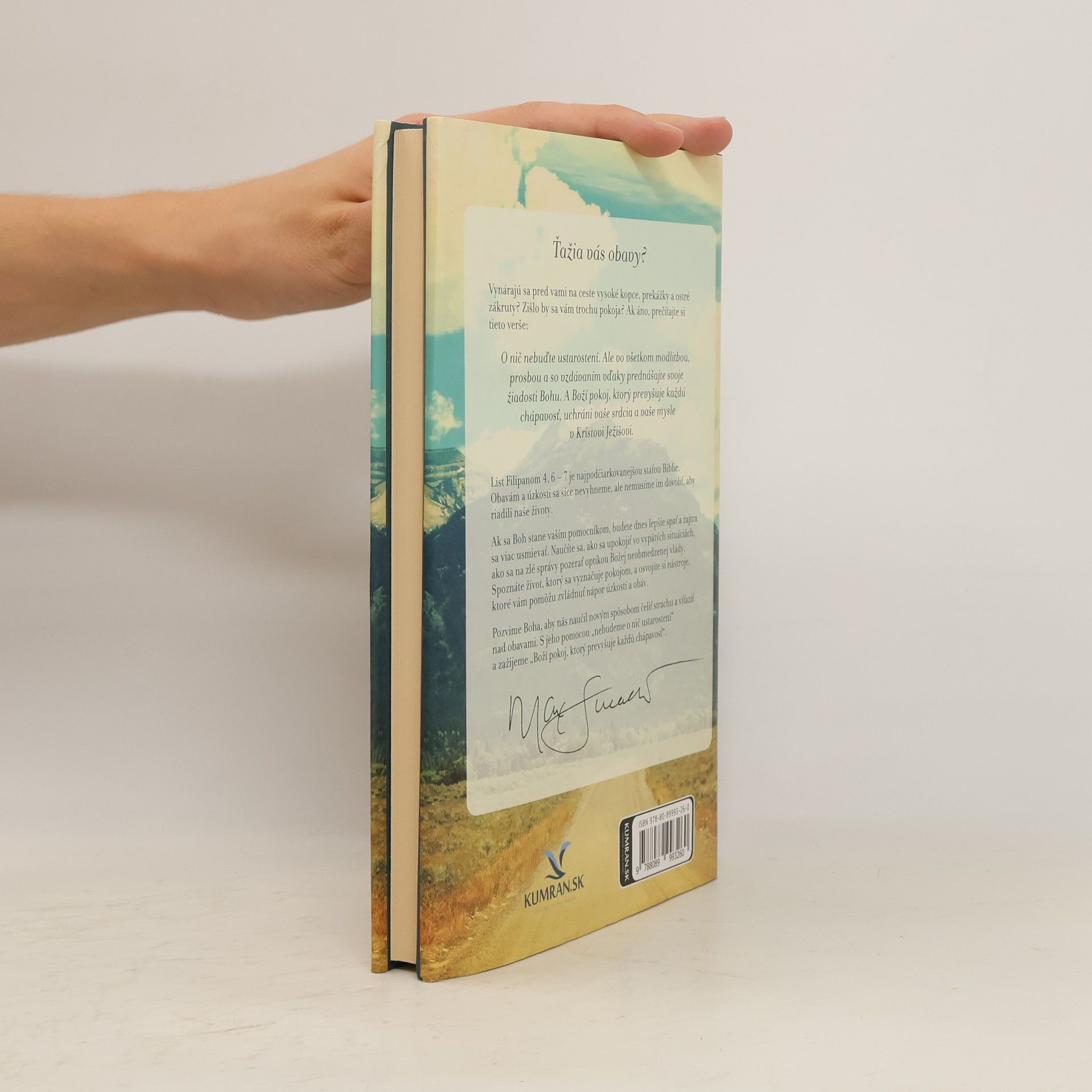 Ťažia vás obavy? Vynárajú sa pred vami prekážky a ostré zákruty? Ak hľadáte pokoj, prečítajte si tieto verše: „O nič nebuďte ustarostení. Ale vo všetkom modlitbou, prosbou a so vzdávaním vďaky prednášajte svoje žiadosti Bohu. A Boží pokoj, ktorý prevyšuje každú chápavosť, uchráni vaše srdcia a vaše mysle v Kristovi Ježišovi.“ Tento úryvok z Listu Filipanom 4, 6 – 7 je najčastejšie podčiarkovanou časťou Biblie. Obavám a úzkosti sa síce nevyhneme, ale nemusia riadiť naše životy. S Božou pomocou sa naučíte lepšie spať a viac sa usmievať. Spoznáte, ako sa upokojiť vo vypätých situáciách a pozerať na zlé správy optikou Božej neobmedzenej vlády. Pozvime Boha, aby nás naučil čeliť strachu a víťaziť nad obavami. Úzkosť má svoje príčiny, a tak sa často cítime napätí a bezradní. Ale nemusíme sa jej poddať. Z údolia obáv vedie chodník, ktorého mapa je v Liste Filipanom 4, 4 – 8. Cestu k pokoju lemujú míľniky: Oslavujte Božiu dobrotu, proste Boha o pomoc, nechajte svoje starosti naňho a rozjímajte o dobrých veciach. Má Boh neobmedzenú vládu nad okolnosťami vašich životov? Podľa Písma je odpoveď áno! Dôverujte mu a nemusíte byť o nič ustarostení.