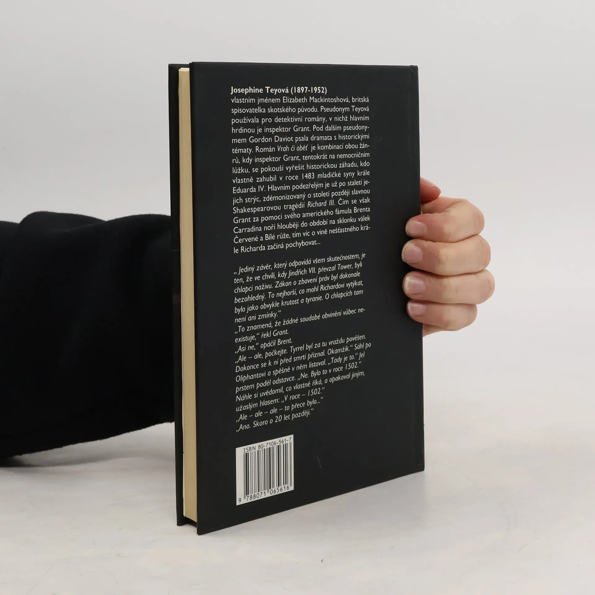 Nové vydání vtipné a přemýšlivé detektivky známé autorky kriminálních a psychologických románů, v níž s prostřednictvím svého hrdiny, inspektora londýnské policie, upoutaného dočasně na lůžku a tudíž se velice nudícího, snaží vyřešit historickou hádanku. Byl protagonista jedné z nejznámější Shakespearovy tragédie Richard III. opravdu vrah, krutovládce a mravní netvor, nebo nešťastný král, proti němuž se snad všechno spiklo? Vyústění je nejen překvapivé, ale přináší nejedno zamýšlení nad otázkou pravdy v dějinách a nad rolí mýtů a stereotypů v nich. Doplněno studiemi Václava Dršky (o dějinách Anglie v době válek růží) a Jiřího Raka (o mýtech a stereotypech v dějinách).