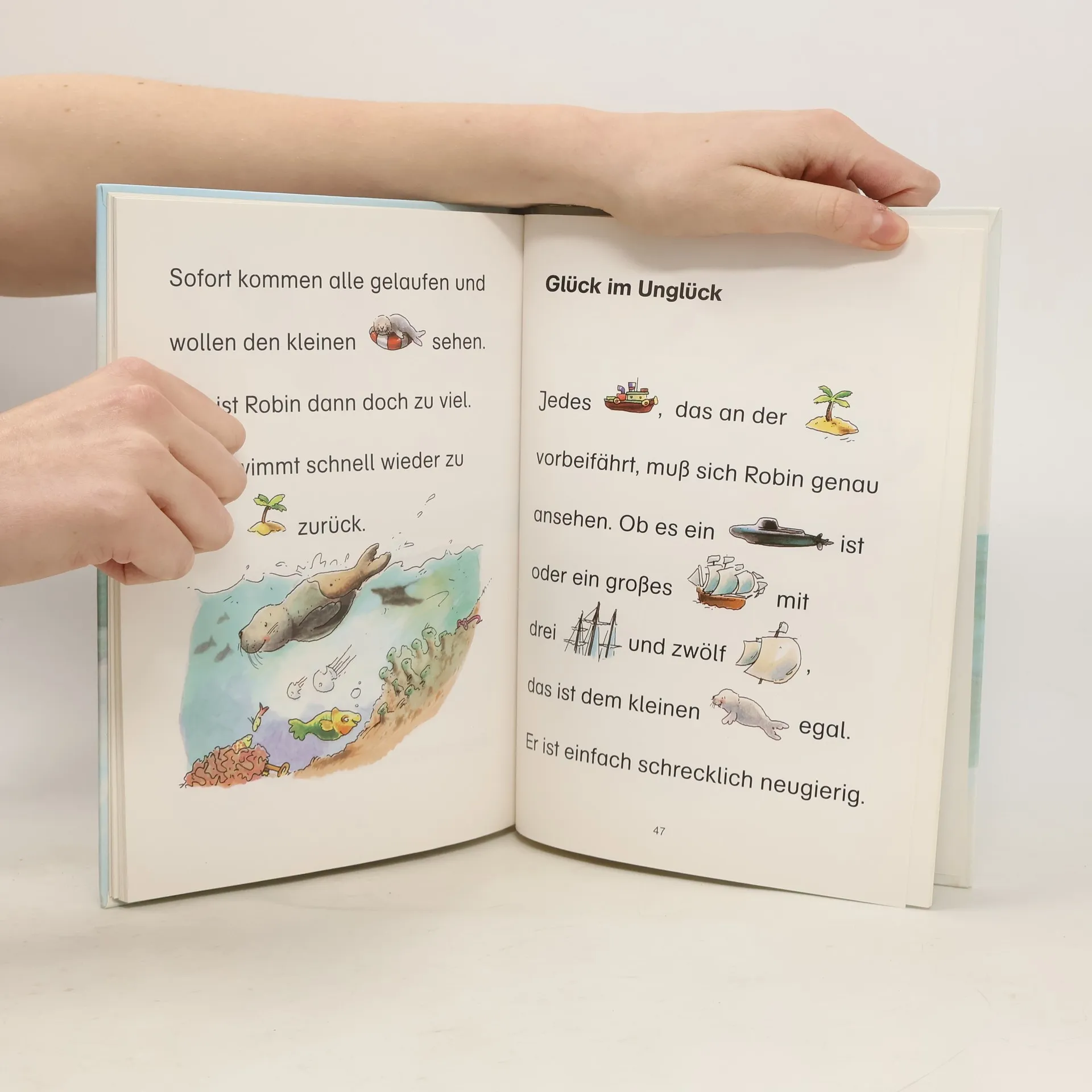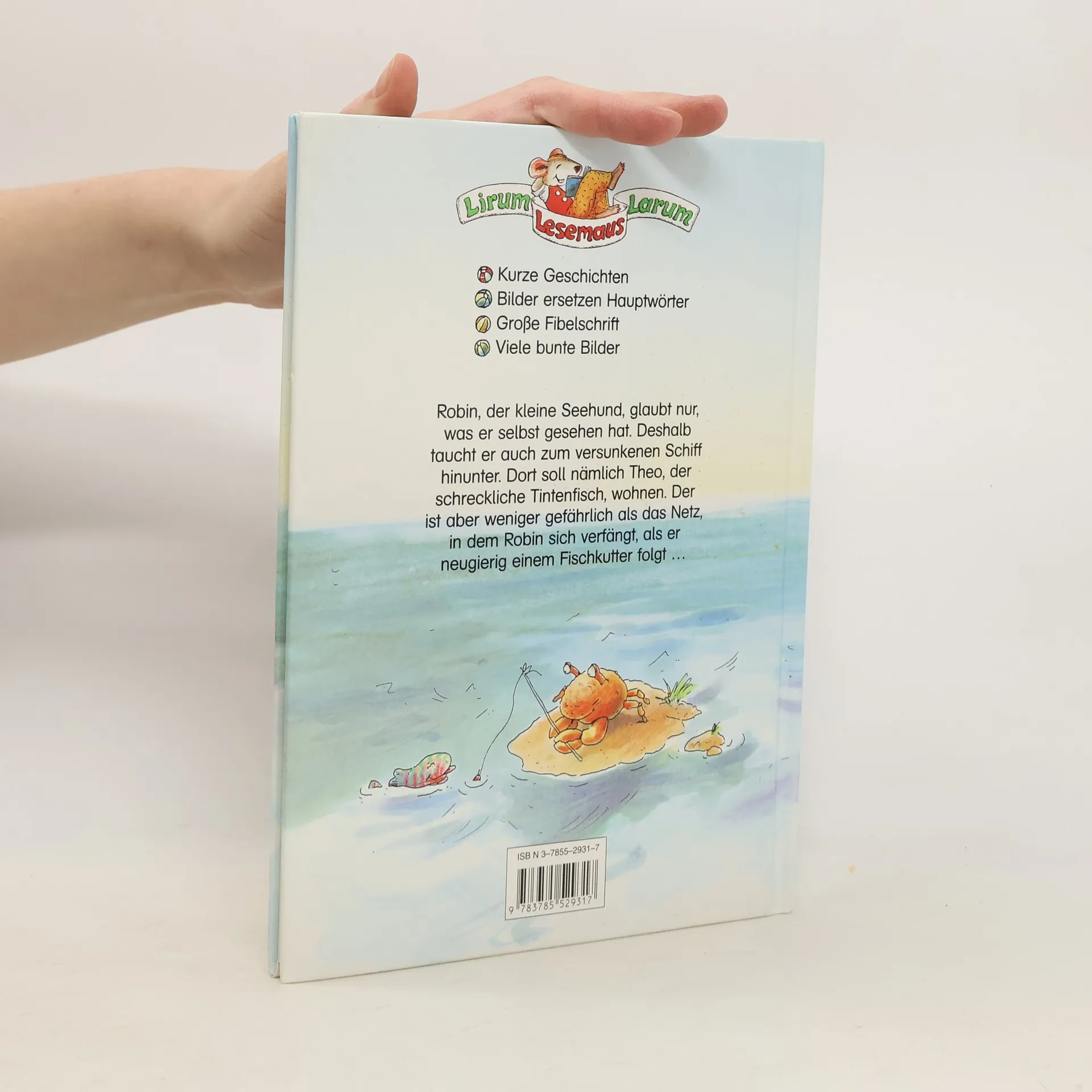 Lesealter ab 5 1. Stufe der Loewe-Leseleiter Kurze Geschichten Bilder ersetzen Hauptwörter Große Fibelschrift Es ist gar nicht so einfach, fischen zu lernen. Das jedenfalls findet der kleine Seehund Robin. Vor allem, wenn die freche Möwe ihn dabei ärgert! Aber dann müssen die Tiere zusammenhalten, denn ständig wird Müll an den Strand geschwemmt! Ob Robin und seine Freunde alles wieder sauber bekommen?