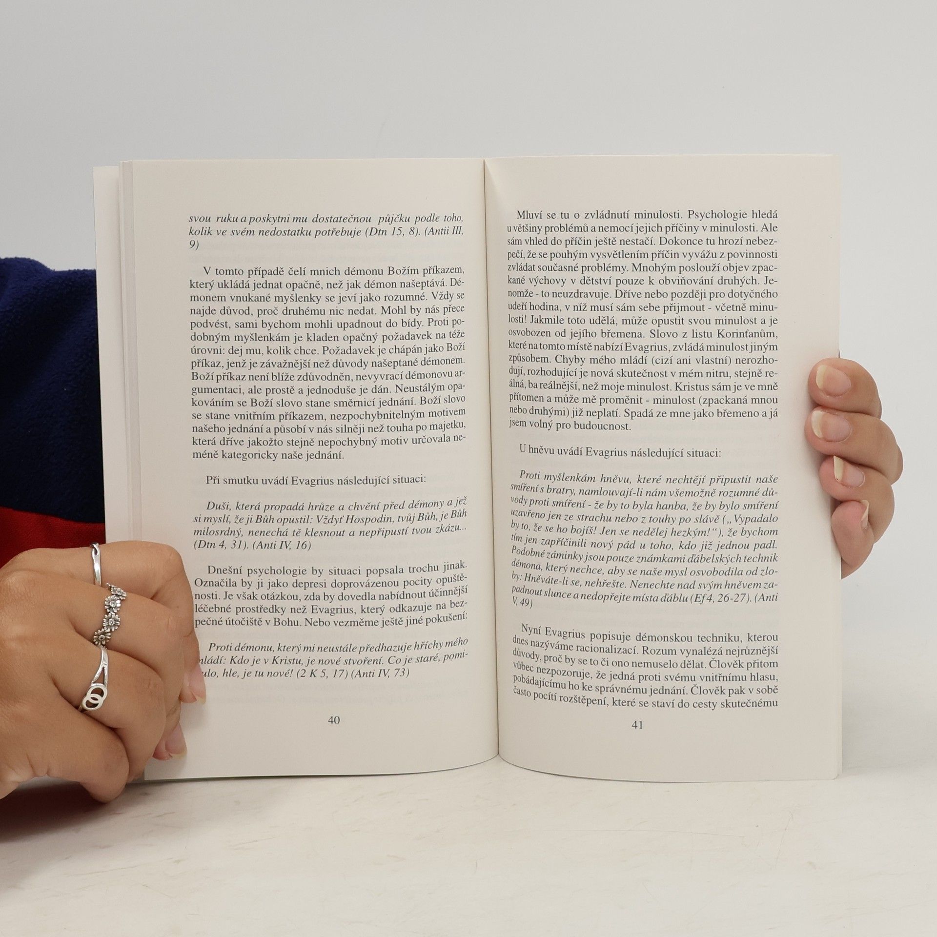Podtitul: Boj s démony ve starém mnišství. Zprávy o prvních mniších nám neustále zmiňují jejich zápas s démony. Stačí letmý pohled do Atanášova životopisu svatého Antonína a okamžitě vidíme, že byl Antonín na každém svém kroku obtěžován a napadán démony. A když se dokonce rozhodl odejít na poušť, považovanou přímo za říši démonů, ti se ho s veškerou mocí snažili od jeho úmyslu odradit a z pouště vyhnat: „Jdi pryč z naší říše! Co tu pohledáváš?“ (Ant 13). Antonín odešel na poušť, aby tu žil výlučně pro Boha a otevřel se mu. Jenomže cesta do samoty ho nevede pouze do Boží blízkosti, nýbrž právě tak do blízkosti Zlého. Zlo nyní k němu přistupuje otevřeně. A ze samoty se vyklube nepříjemné sousedství se Zlým. Antonín pak musí přijmout zápas se Zlým, aby se mu jeho cesta na poušť nestala osudnou, nýbrž vedla ho k Bohu. Antonínova zkušenost je pro rané mnišství (3.-6. stol.) typická. Mniši zakoušeli, že je cesta k Bohu provádí nejprve bojem s mocnostmi temnot. Prožívají rozervanost mezi Bohem na jedné a jinými mocnostmi na druhé straně — mocnostmi, jež je chtějí od Boha zdržet. Tyto síly, jejichž působení odhalují ve svých přáních, pudech, motivacích a emocích, nazývají démony. Obšírně též popisují různé druhy démonů, jejich techniky a metody, jak dostat člověka pod svou vládu. Otcové tu poskytují četné rady, jak proti démonům bojovat.