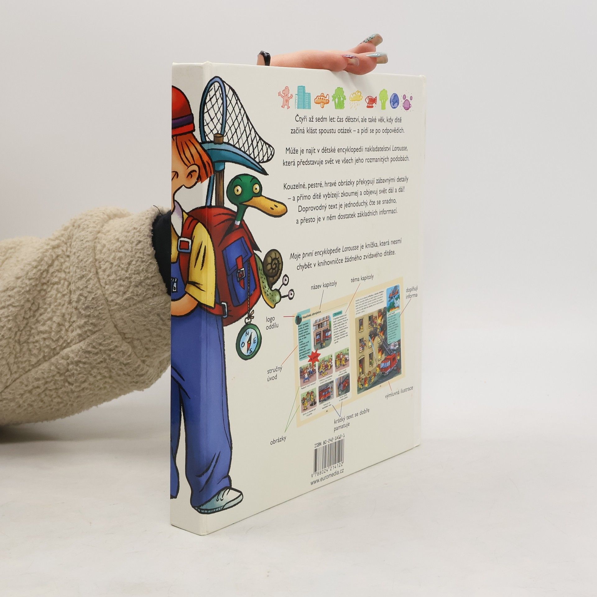 Čtyři až sedm let: čas dětství, ale také věk, kdy dítě začíná klást spoustu otázek - a pídí se po odpovědích. Může je najít v dětské encyklopedii prestižního francouzského nakladatelství Larousse, která představuje svět ve všech jeho rozmanitých podobách. Kouzelné, pestré, hravé obrázky knihy překypují zábavnými detaily - a přímo dítě vybízejí: zkoumej a objevuj svět dál a dál! Doprovodný text je jednoduchý, čte se snadno, a přesto je v něm dostatek základních informací rozdělených do několika tématických okruhů: Tělo, Město, Doprava, Příroda, Čas, Zvířata, Rostliny, Naše planeta a Vesmír.