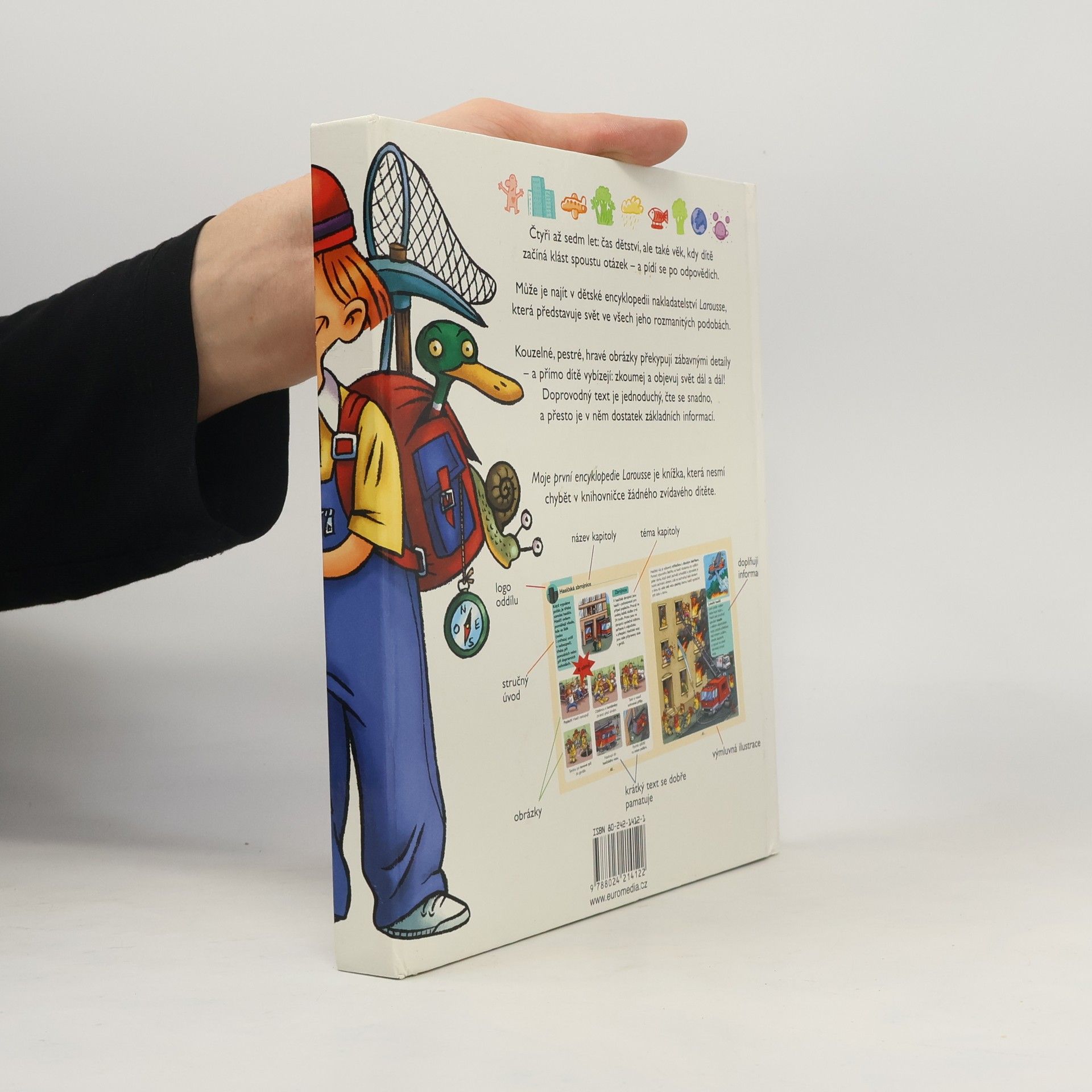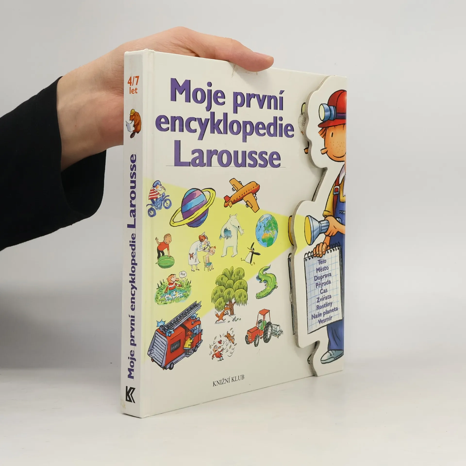 Čtyři až sedm let: čas dětství, ale také věk, kdy dítě začíná klást spoustu otázek - a pídí se po odpovědích. Může je najít v dětské encyklopedii prestižního francouzského nakladatelství Larousse, která představuje svět ve všech jeho rozmanitých podobách. Kouzelné, pestré, hravé obrázky knihy překypují zábavnými detaily - a přímo dítě vybízejí: zkoumej a objevuj svět dál a dál! Doprovodný text je jednoduchý, čte se snadno, a přesto je v něm dostatek základních informací rozdělených do několika tématických okruhů: Tělo, Město, Doprava, Příroda, Čas, Zvířata, Rostliny, Naše planeta a Vesmír.