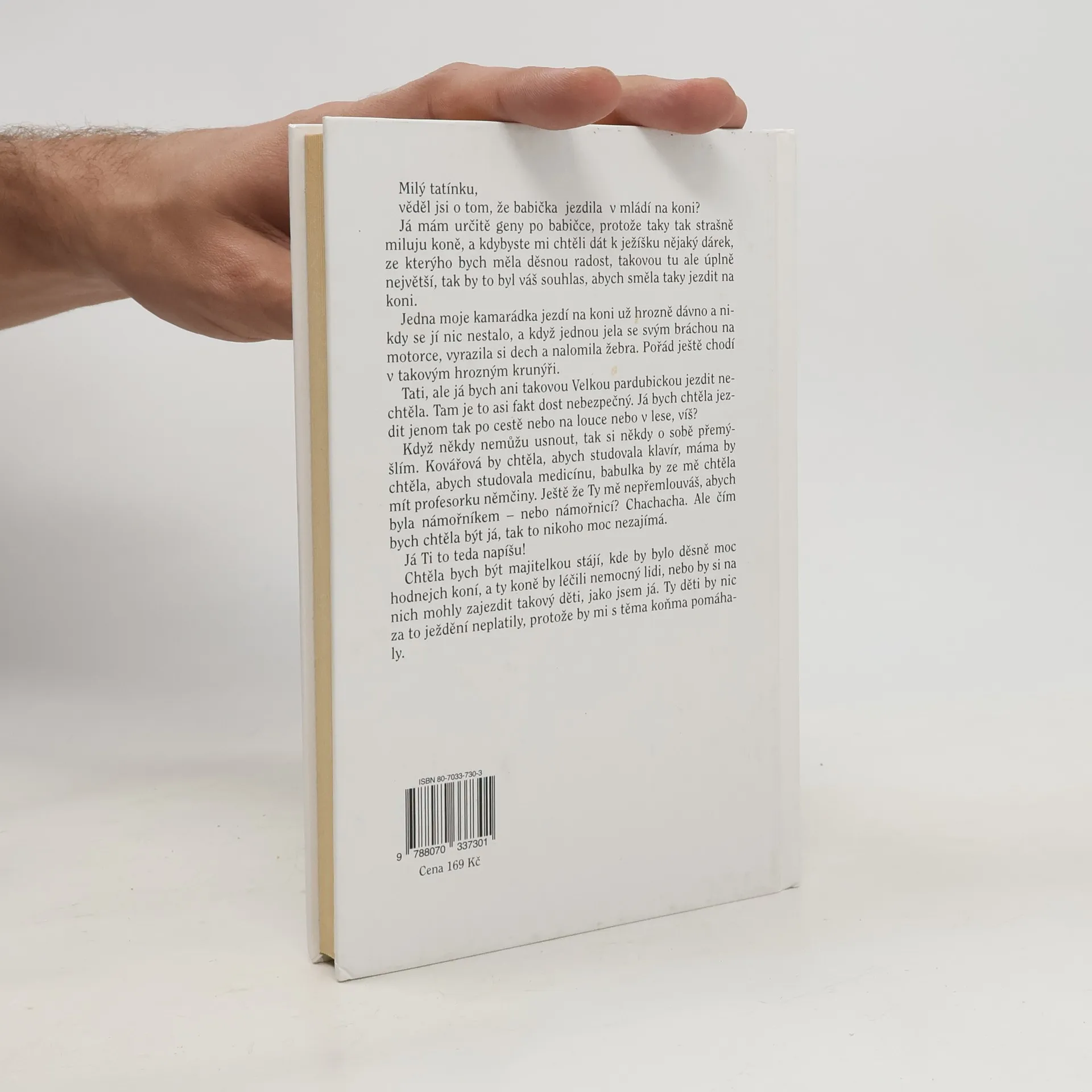 Milý tatínku, věděl jsi, že babička jezdila v mládí na koni? Já mám určité geny po babičce, protože taky tak strašně miluju koně a kdybyste mi chtěli dát k ježíšku nějaký dárek ze kterýho bych měla děsnou radost, takovou tu ale úplně největší, tak by to byl váš souhlas abych taky směla jezdit na koni. Jedna moje kamarádka jezdí na koni už hrozně dávno a nikdy se jí nic nestalo, a když jela jednou se svým bráchou na motorce, vyrazila si dech a nalomila žebra. Pořád ještě chodí v takovým hrozným krunýři. Tati, ale já bych takovou Velkou pardubickou jezdit nechtěla. Tam je to asi fakt dost nebezpečný. Já bych chtěla jezdit jenom tak po cestě nebo po louce nebo v lese víš? Když někdy nemůžu usnout, tak si tak o sobě přemýšlím. Kovářová by chtěla abych studovala klavír, máma by chtěla abych studovala medicínu a babulka by ze mě chtěla mít profesorku němčiny. Ještě, že ty mě nepřemlouváš, abych byla námořníkem nebo námořnicí? Chachacha. Ale čím bych chtěla být já, tak to nikoho moc nezajímá. Já ti to teda napíšu! Chtěla bych být majitelkou stájí, kde by bylo děsně moc hodnejch koní, a ty koně by léčili nemocný lidi, nebo by si na nich mohly zajezdit takový děti jako jsem já. Ty děti by za to ježdění nic neplatily, protože by mi s těma koňma pomáhaly. Zdroj kniha.