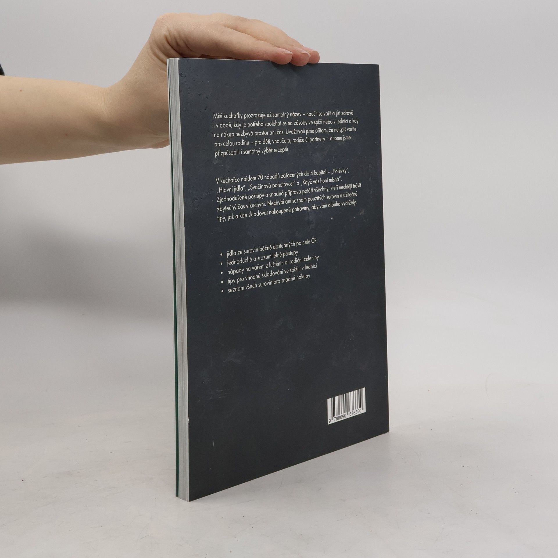 Přišli jste domů z práce a nechce se vám na nákup? Právě vám volal někdo z rodiny, že se neplánovaně staví na sobotní oběd a vy byste jim rádi uvařili domácí stravu? Mise této kuchařky je jasná – naučit se vařit a jíst zdravě i v době, kdy je potřeba spoléhat se na zásoby ve spíži nebo lednici a na nákup prostě není prostor ani čas. Dali jsme dohromady 70 nápadů na opravdová jídla, která v kuchyni připravíte během chvíle a při vaření vám můžou pomáhat i děti. V kuchařce najdete 4 kategorie – polévky, hlavní jídla, svačinovou pohotovost a recepty pro chvíle, kdy vás honí mlsná. Tentokrát jsme si posvítili na luštěniny, zdravější varianty dětských jídel, ryby, maso a také lehčí bezmasé varianty tradičních receptů. Kromě toho vás naučíme upéct nehnětený špaldový chléb, bulky k snídani nebo vyrobit kakaovo-tvarohový dezert ze 4 surovin.