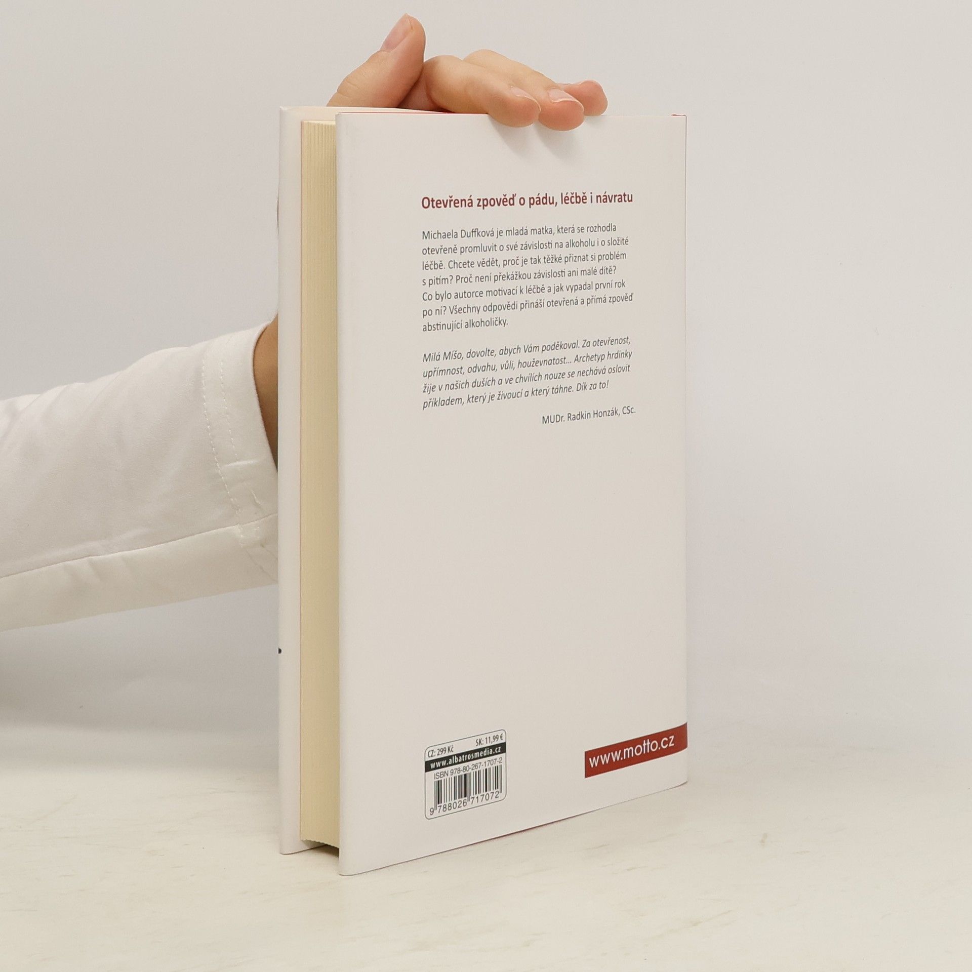 Poslední sklenička… dnes už popáté. Kniha podle blogu, který získal cenu Magnesia Litera. Michaela Duffková je mladá matka, která se rozhodla otevřeně promluvit o své závislosti na alkoholu i o složité léčbě. Chcete vědět, proč je tak těžké přiznat si problém s pitím? Proč není překážkou závislosti ani malé dítě? Co bylo autorce motivací k léčbě a jak vypadal první rok po ní? Všechny odpovědi přináší otevřená a přímá zpověď abstinující alkoholičky. Upřímně sdílená zkušenost o pádu doslova na dno vzbudila velký zájem veřejnosti, Michaela získala za svůj blog cenu Magnesia Litera a začala o závislosti veřejně přednášet. Dnes se věnuje svému vysněnému projektu – centru pro prevenci a léčbu závislosti na alkoholu. „Příběh Míši Duffkové je skvělým příspěvkem k destigmatizaci ženského alkoholismu a současně unikátní výpovědí o bolesti i naději.“ prof. PhDr. Michal Miovský, Ph.D. přednosta Kliniky adiktologie 1. LF UK a VFN