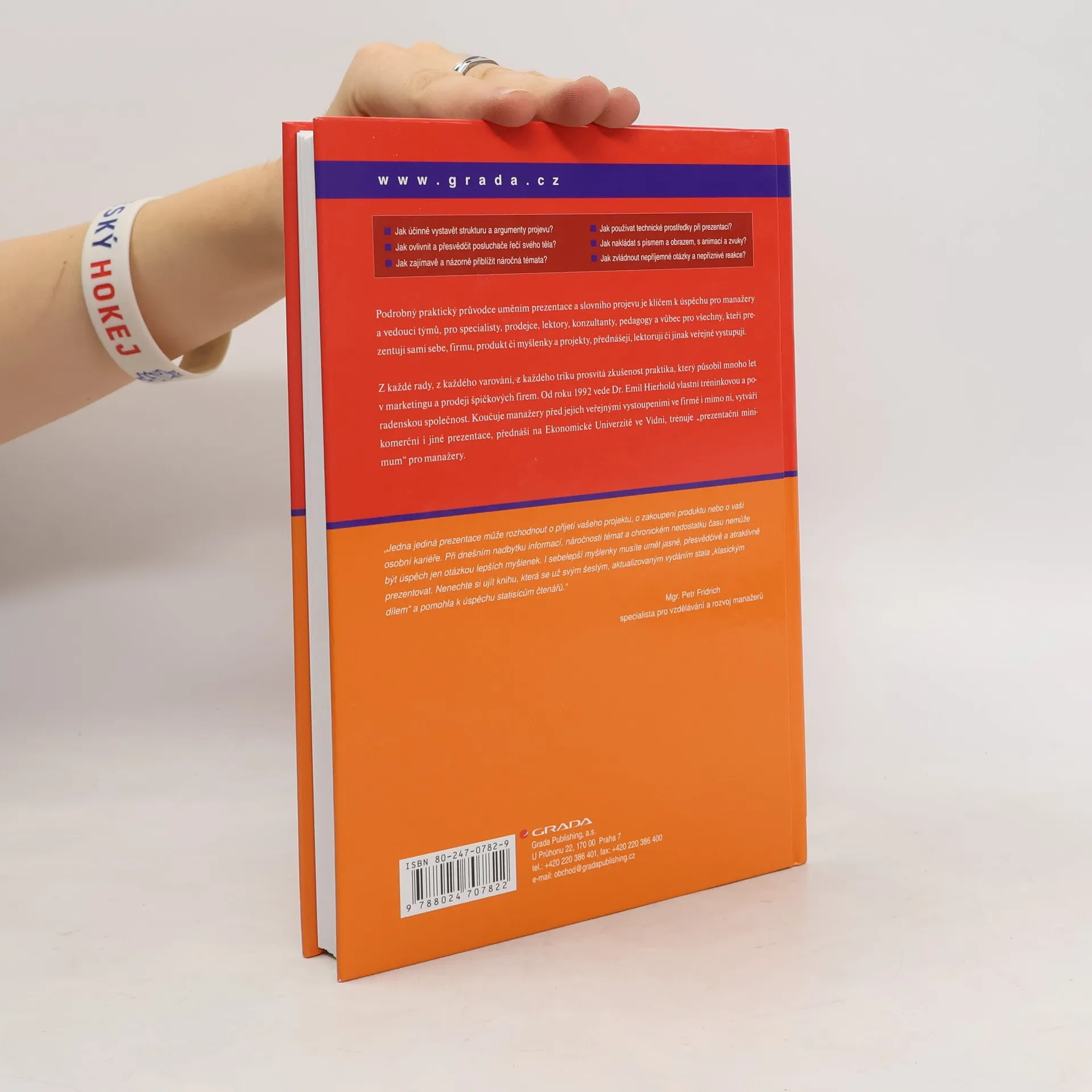 Sedmé, aktualizované vydání velmi úspěšné publikace o prezentaci a slovním projevu je určeno manažerům a vedoucím projektů, specialistům, prodejcům, lektorům, konzultantům a všem, kteří prezentují sami sebe, firmu, produkt či myšlenky, kteří přednášejí, lektorují či jinak veřejně vystupují. Kniha je výjimečná tím, že nabízí velké množství konkrétních ukázek, jak pracovat se slovy, písmem a obrazem. Poskytuje mnoho praktických rad, návodů a tipů, jak účinně vystavět strukturu a argumenty projevu, jak ovlivnit a přesvědčit posluchače řečí svého těla, jak zajímavě a názorně přiblížit náročná témata, jak používat technické prostředky při prezentaci, jak zvládnout nepříjemné otázky a nepříznivé reakce od publika a mnoho dalšího.