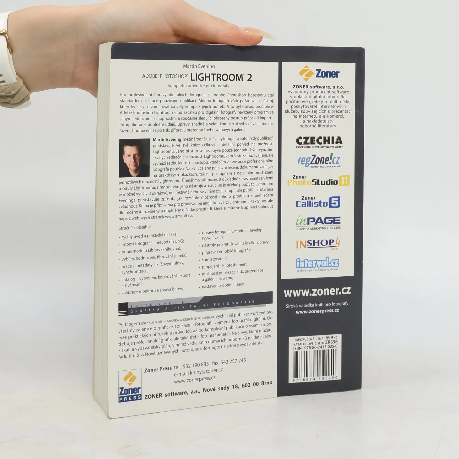 Digitální fotografie je dnes běžná nejen mezi profesionály, ale i amatéry. S vývojem digitálních fotoaparátů se zlepšují nástroje pro úpravu, správu a archivaci fotografií, včetně práce se raw soubory a možností tisku či publikace. Adobe Photoshop se stal standardem pro profesionální úpravy, ale mnozí fotografové hledali komplexnější nástroj, což vedlo k vzniku Adobe Photoshop Lightroom. Tento program je navržen speciálně pro digitální fotografy a nabízí silné editační schopnosti, které pokrývají celý proces od importu přes úpravy až po tisk a prezentace. Martin Evening, mezinárodně uznávaný fotograf, poskytuje v této knize detailní pohled na možnosti Lightroomu, vycházející z jeho vlastních zkušeností. Čtenář se seznámí se všemi moduly a nástroji Lightroomu a naučí se je efektivně používat. Kniha je určena pro anglickou verzi Lightroomu, přičemž texty jsou doplněny o české prostředí. Obsah zahrnuje úvod do aplikace, import fotografií, práci s knihovnou, úpravy obrazu, černobílou fotografii, propojení s Photoshopem, tisk a prezentaci. K dispozici jsou také dodatky a rejstřík pro snadnou orientaci.