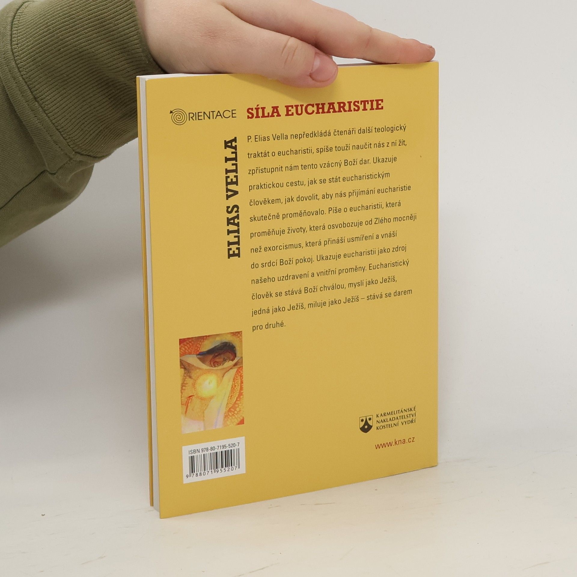 Elias Vella ve své knize mluví o eucharistii, která uzdravuje ducha, duši i tělo, osvobozuje, mění životy a vnáší do srdce klid. Ať se vám podaří sjednotit se s Ježíšem natolik, že začnete myslet tak, jak myslí Ježíš, a stejně i milovat. P. Elias Vella OFMConv. se narodil roku 1941 v St. Paul’s Bay na Maltě. Je členem Řádu menších bratří, františkánů. Roku 1965 absolvoval studium teologie a katechetiky na Lateránské univerzitě v Římě a poté na Maltě vyučoval dogmatiku. V letech 1974–1986 působil jako provinciál minoritů na Maltě, sedm let byl rovněž arcibiskupským delegátem pro řeholní život. Na základě biskupského pověření je už téměř dvacet let diecézním exorcistou a předsedou diecézní komise pro okultismus a satanismus. V současné době vede často v různých zemích světa exercicie pro kněze, řeholníky i laiky a pořádá semináře na téma vnitřního uzdravení a služby osvobozování.