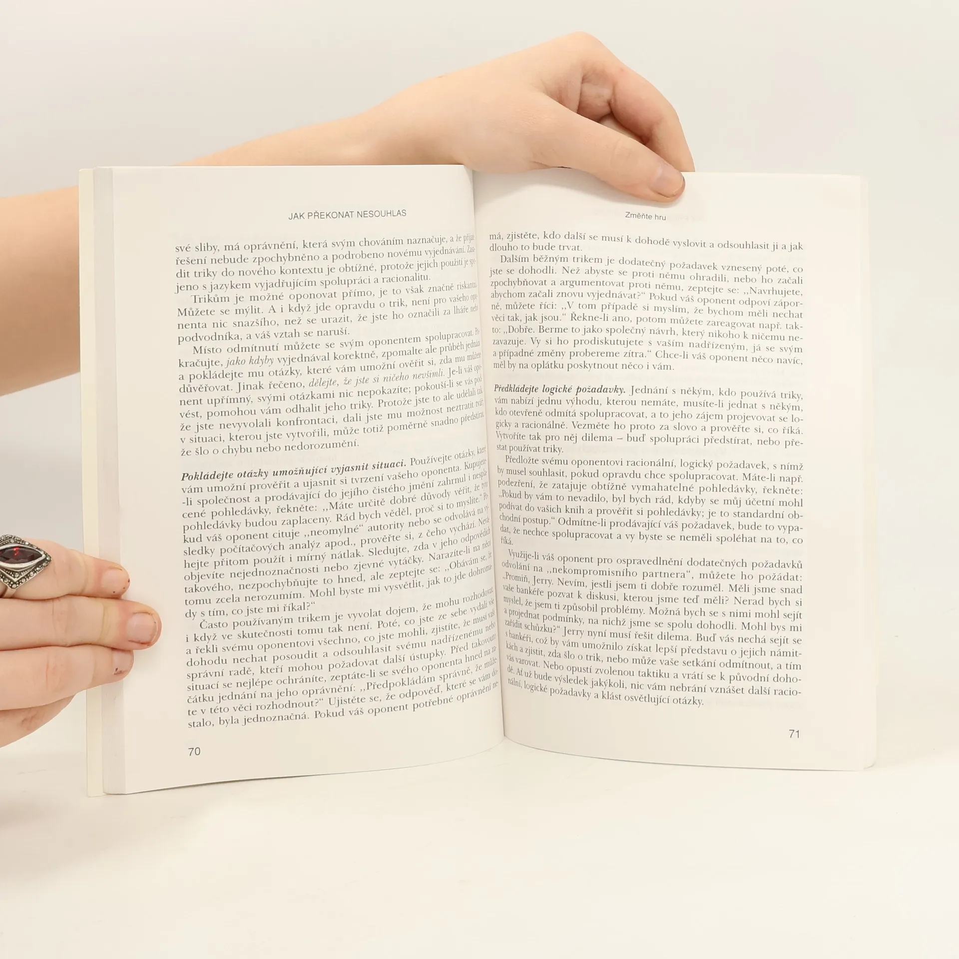 Každý z nás se občas ocitá v situaci, kdy musí vyjednávat, a to i s lidmi, kteří nechtějí ustoupit. Co dělat, když se setkáte s neústupným šéfem, zákazníkem s nepřijatelnými požadavky nebo kolegou, který vás nemá v oblibě? Autor ve své úspěšné knize představuje různé vyjednávací taktiky, které vám pomohou dosáhnout svých cílů bez zbytečných ústupků. Zaměřuje se na jednání s problematickými osobami, které neprojevují ochotu k dohodě nebo jsou ovládány negativními emocemi. Jeho pětikroková strategie ukazuje, jak odzbrojit neústupného oponenta a odvrátit jeho útoky: 1. Nereagujte, 2. Odzbrojte oponenta, 3. Změňte hru, 4. Usnadněte oponentovi souhlasit, 5. Znesnadněte oponentovi nesouhlasit. Kniha analyzuje metodu průlomového vyjednávání, která se zaměřuje na hledání vzájemně přijatelných řešení. Nabízí rady, jak přivést oponenta k realistickému pohledu, jak zabránit eskalaci konfliktu a jak vyjádřit vlastní názory bez provokace. Tato univerzální metoda je použitelná v různých situacích, od vyjednávání s teenagerem po neústupného úředníka, a pomůže vám konstruktivně využít svůj vyjednávací potenciál.