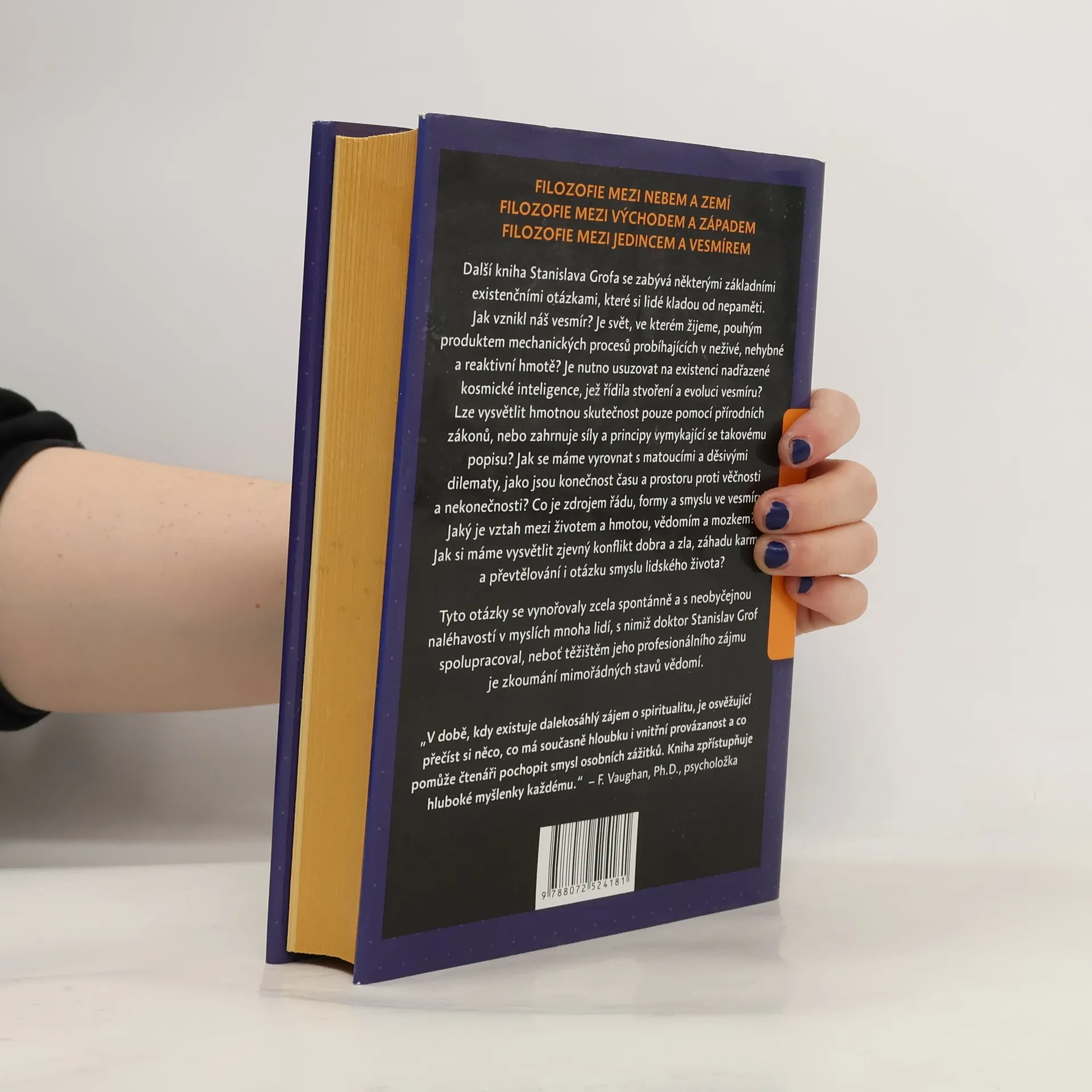 Filozofie mezi nebem a zemí Filozofie mezi východem a západem Filozofie mezi jedincem a vesmírem Otázky, které trápí každého přemýšlivého člověka Tato Grofova kniha se zabývá některými základními existenčními otázkami, které si lidé kladou od nepaměti. Jak vznikl náš vesmír? Je svět, ve kterém žijeme, pouhým produktem mechanických procesů probíhajících v neživé, nehybné a reaktivní hmotě? Je nutno usuzovat na existenci nadřazené kosmické inteligence, jež řídila stvoření a evoluci vesmíru? Lze vysvětlit hmotnou skutečnost pouze pomocí přírodních zákonů, nebo zahrnuje síly a principy vymykající se takovému popisu? Jak se máme vyrovnat s matoucími a děsivými dilematy, jako jsou konečnost času a prostoru proti věčnosti a nekonečnosti? Co je zdrojem řádu, formy a smyslu ve vesmíru? Jaký je vztah mezi životem a hmotou, vědomím a mozkem? Jak si máme vysvětlit zjevný konflikt dobra a zla, záhadu karmy a převtělování i otázku smyslu lidského života? Mnohé otázky, které autor v této knize zkoumá, mají velký význam pro běžný život. Tyto otázky se vynořovaly při autorově psychiatrické práci zcela spontánně a s neobyčejnou naléhavostí v myslích mnoha lidí, s nimiž spolupracoval. Příčinou je neobvyklá oblast studia, jež byla hlavním těžištěm Grofova zájmu po dobu čtyřiceti let jeho profesionálního života - totiž zkoumání mimořádných stavů vědomí.