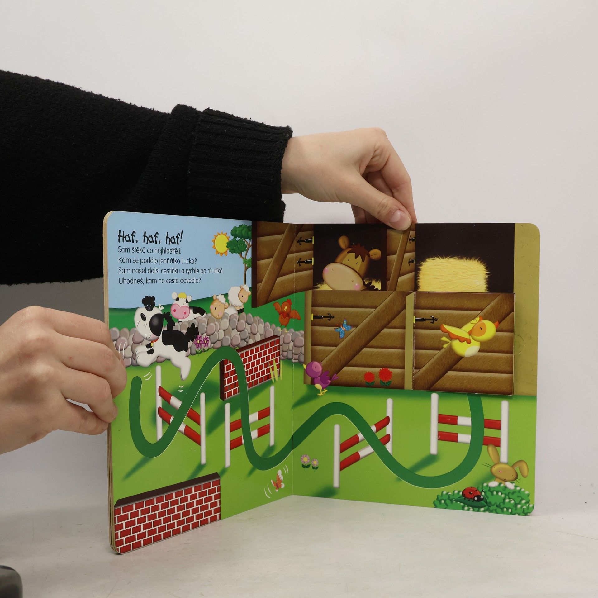 Pomoz pejskovi Samovi najít jehňátko Lucku! Putuj prstem po cestičce v knížce a otvírej okénka, pod kterými se ukrývají různá překvapení!