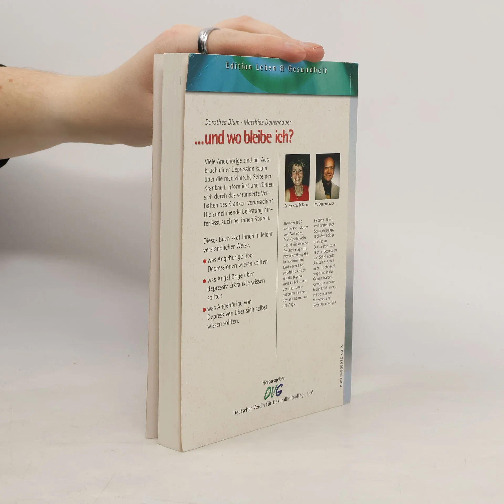 Die Autoren: Dorothea Blum und Matthias Dauenhauer sind als Diplompsychologen in der Erwachsenenbildung tätig und leiten Seminare für Angehörige von depressiv erkrankten Menschen. Das Buch: Jeder vierte Bundesbürger durchleidet irgendwann im Leben eine depressive Phase. Die Angehörigen empfinden dabei oft eine große Unsicherheit im Umgang mit dem Erkrankten. Wie soll man sich verhalten? Wie lassen sich Fehler vermeiden? Wie kann man zur Genesung beitragen? Aber es geht auch um die eigene Situation: Kann ich vielleicht „angesteckt“ werden? Was ist, wenn mir die Kräfte schwinden? Oder die Geduld ausgeht? Wenn einer von uns aus Verzweiflung an Selbstmord denkt? Wie kann ich einen Sinn in der Depression sehen? Dieses Buch möchte dazu Informationen, Hilfestellung und Gedankenanstöße geben. Gezeigt wird, wie man Überforderung vermeiden und seine persönliche Form des Umgangs mit Depression un den davon Betroffenen finden kann. Eine echte Hilfe für Menschen, die mit depressiv Erkrankten zusammenleben; für alle, die in der Seelsorge mit Depression konfrontiert werden; für jeden, der Depression besser verstehen möchte.