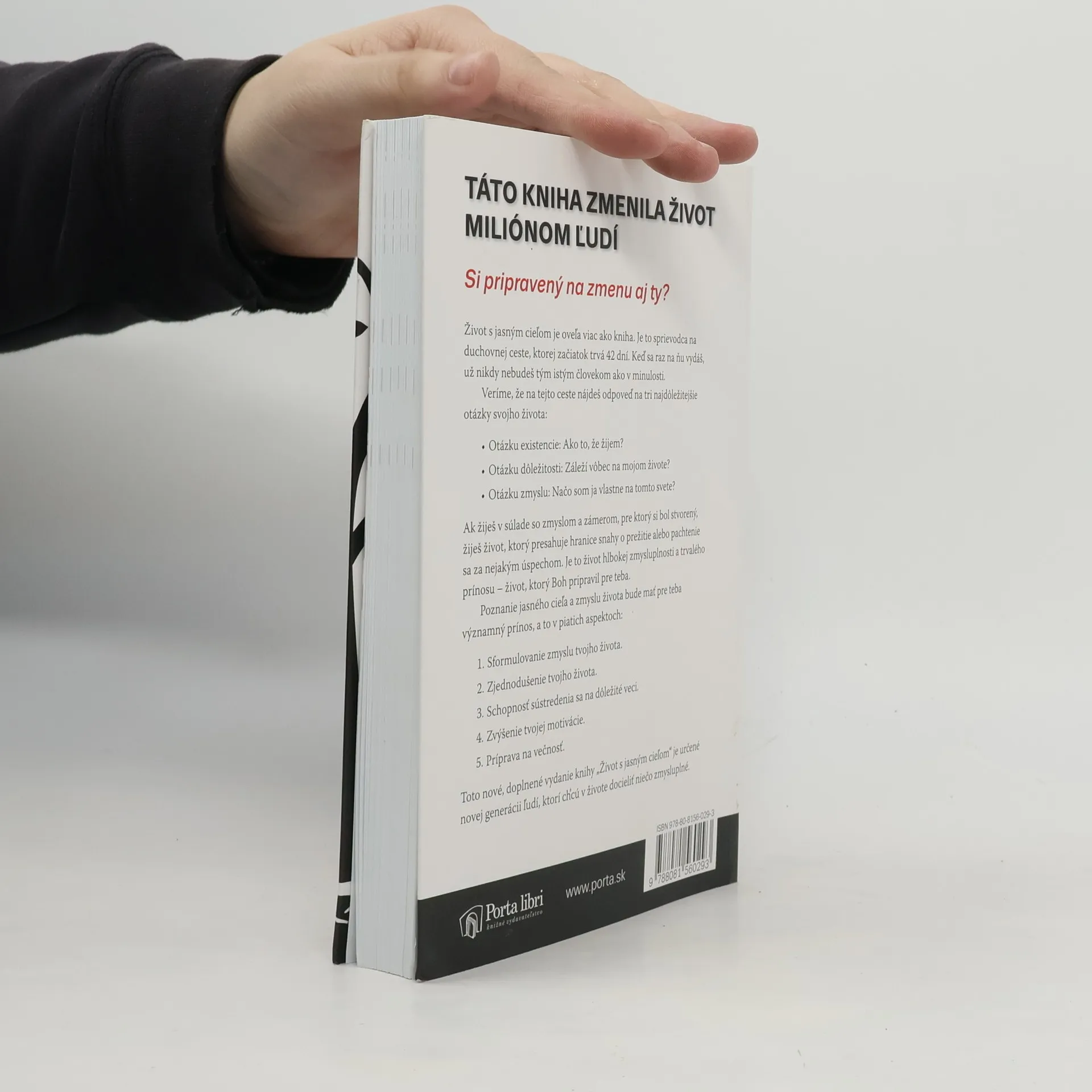 Táto kniha zmenila život miliónom ľudí. Si pripravený na zmenu aj ty? Život s jasným cieľom je oveľa viac ako kniha. Je to sprievodca na duchovnej ceste, ktorej začiatok trvá 42 dní. Keď sa raz na ňu vydáš, už nikdy nebudeš tým istým človekom ako v minulosti. VERÍME, ŽE NA TEJTO CESTE NÁJDEŠ ODPOVEĎ NA TRI NAJDÔLEŽITEJŠIE OTÁZKY SVOJHO ŽIVOTA: Otázku existencie: Ako to, že žijem? Otázku dôležitosti: Záleží vôbec na mojom živote Otázku zmyslu: Načo som ja vlastne na tomto svete? Ak žiješ v súlade so zmyslom a zámerom, pre ktorý si bol stvorený, žiješ život, ktorý presahuje hranice snahy o prežitie alebo pachtenie sa za nejakým úspechom. Je to život hlbokej zmysluplnosti a trvalého prínosu – život, ktorý Boh pripravil pre teba. POZNANIE JASNÉHO CIEĽA A ZMYSLU ŽIVOTA BUDE MAŤ PRE TEBA VÝZNAMNÝ PRÍNOS, A TO V PIATICH ASPEKTOCH: Sformulovanie zmyslu tvojho života. Zjednodušenie tvojho života. Schopnosť sústredenia sa na dôležité veci. Zvýšenie tvojej motivácie. Príprava na večnosť. Toto nové, doplnené vydanie knihy Život s jasným cieľom je určené novej generácii ľudí, ktorí chcú v živote docieliť niečo zmysluplné.