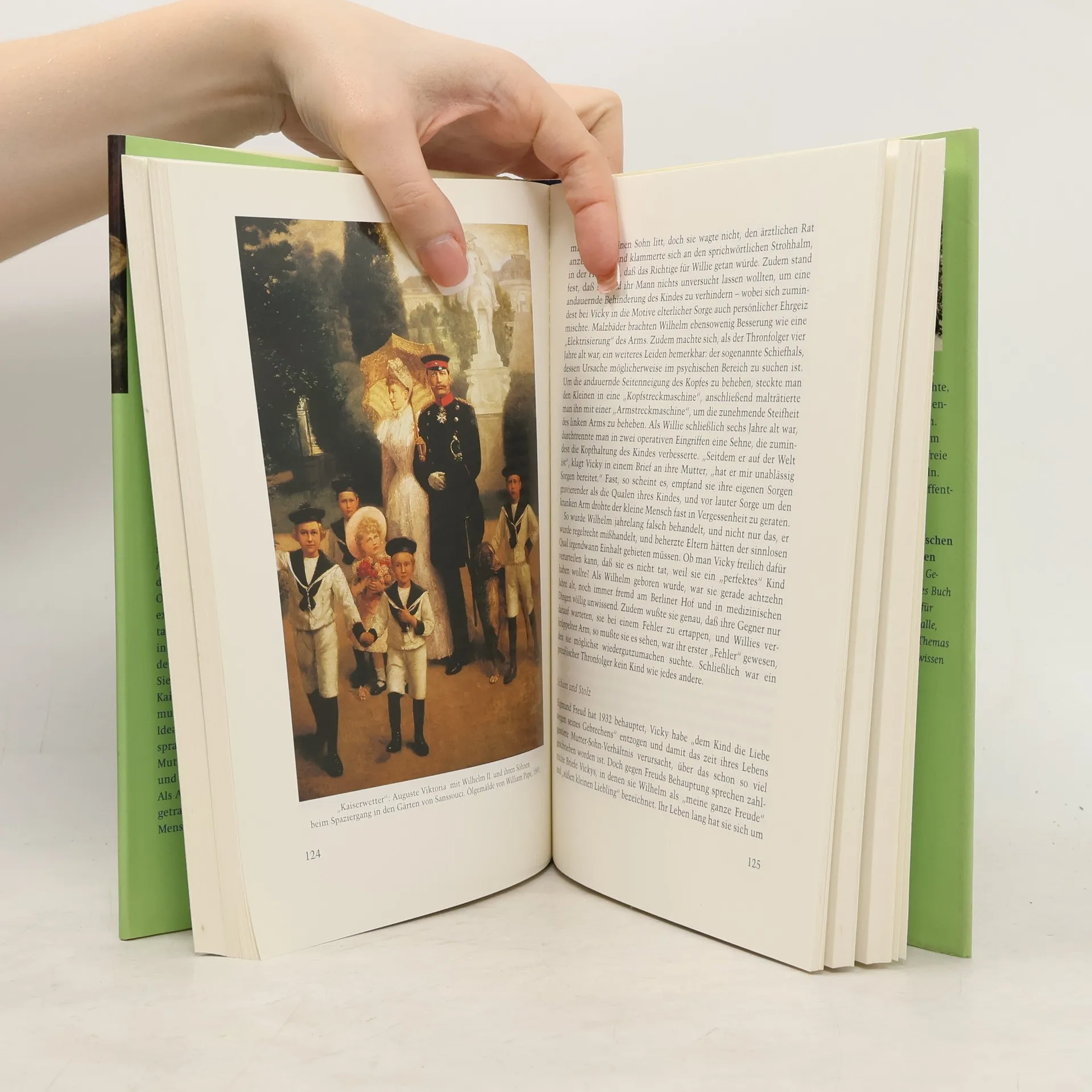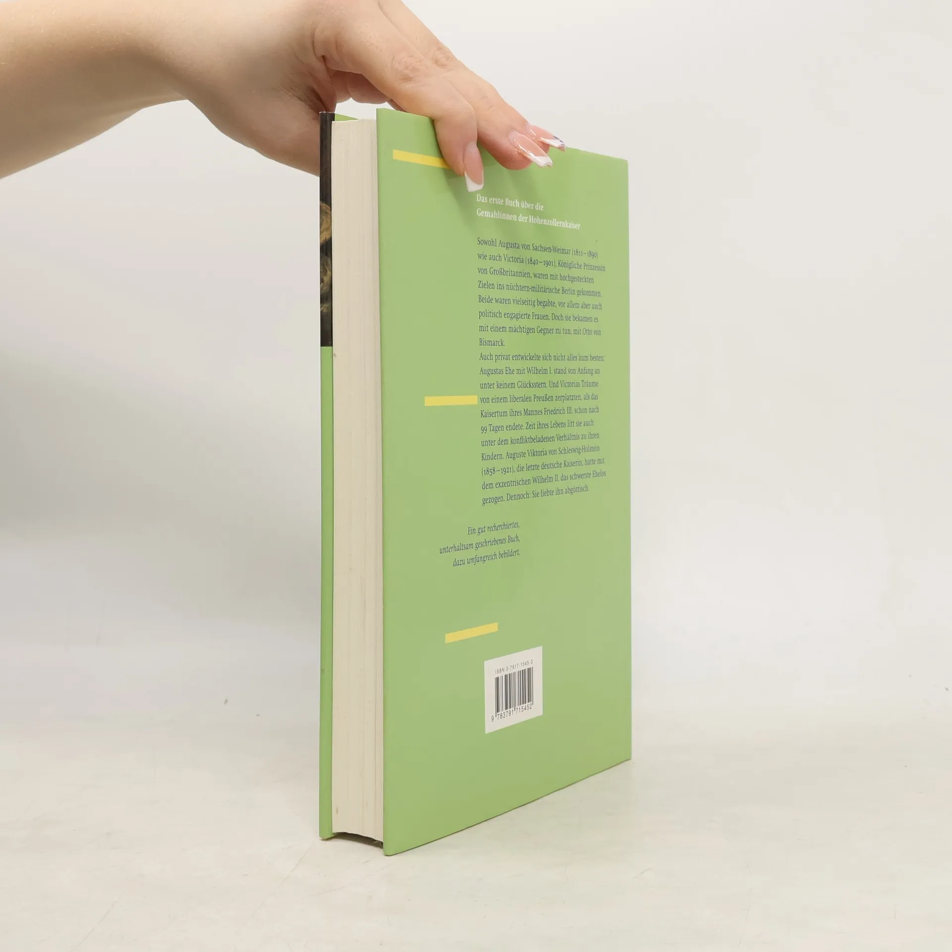 Sowohl Augusta von Sachsen-Weimar (1811 bis 1890) wie auch Victoria (1840 bis 1901), Königliche Prinzessin von Großbritannien, waren mit hochgesteckten Zielen ins nüchtern-militärische Berlin gekommen. Beide waren vielseitig begabte, vor allem aber auch politisch engagierte Frauen. Doch sie bekamen es mit einem mächtigen Gegner zu tun, mit Otto von Bismarck. Auch privat entwickelte sich nicht alles zum Besten: Augustas Ehe mit Wilhelm I. stand von Anfang an unter keinem Glücksstern. Und Victorias Träume von einem liberalen Preußen zerplatzten, als das Kaisertum ihres Mannes Friedrich II. schon nach 99 Tagen endete. Zeit ihres Lebens litt sie auch unter dem konfliktbeladenen Verhältnis zu ihren Kindern. Auguste Victoria von Schleswig-Holstein (1858 bis 1921), die letzte deutsche Kaiserin, hatte mit dem exzentrischen Wilhelm II. das schwerste Ehelos gezogen: Dennoch: Sie liebte ihn abgöttisch.