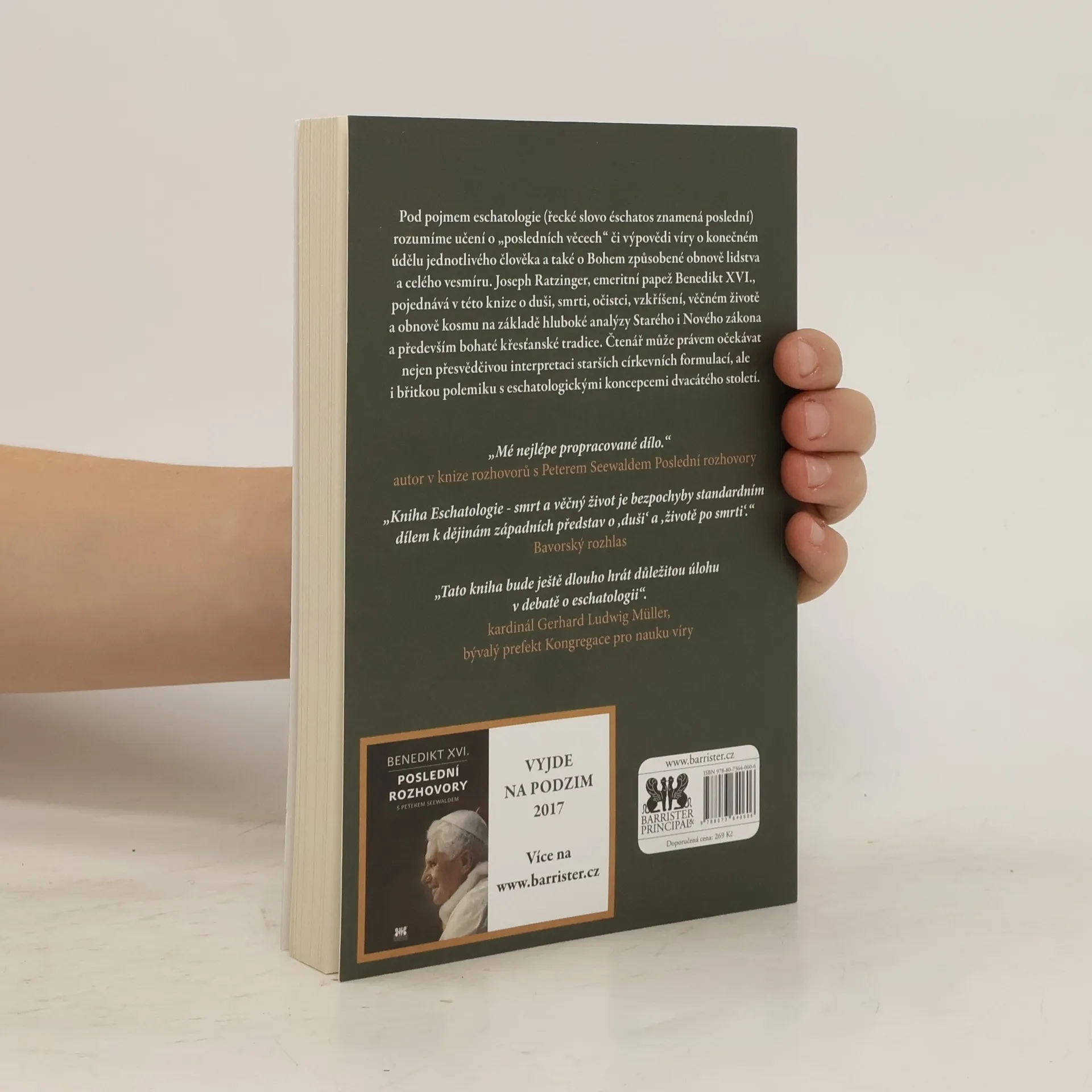 Pod pojmem eschatologie (řecké slovo éschatos znamená poslední) rozumíme učení o „posledních věcech“ či výpovědi víry o konečném údělu jednotlivého člověka a také o Bohem způsobené obnově lidstva a celého vesmíru. Joseph Ratzinger, emeritní papež Benedikt XVI., pojednává v této knize o duši, smrti, očistci, vzkříšení, věčném životě a obnově kosmu na základě hluboké analýzy Starého i Nového zákona a především bohaté křesťanské tradice. Čtenář může právem očekávat nejen přesvědčivou interpretaci starších církevních formulací, ale i břitkou polemiku s eschatologickými koncepcemi dvacátého století. Autor zde důkladně rozvedl intuice svého učitele Hanse Urs von Balthasara, který prohlásil: „Eschatologie je větrná korouhvička v teologii naší doby. Od ní vystupují ony bouře, které plodně ohrožují velkou oblast teologie: mohou utlouci kroupami, nebo občerstvit.“
