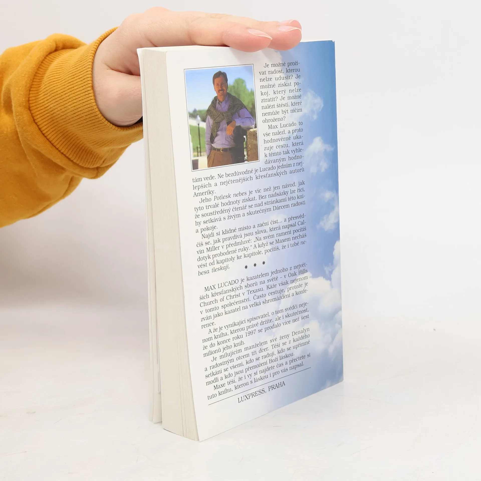 Je možné prožívat radost, kterou nelze udusit? Je možné získat pokoj, který nelze ztratit? Je možné nalézt štěstí, které nemůže být ničím ohroženo? Max Lucado to vše nalezl, a proto hodnověrně ukazuje cestu, která k těmto tak vyhledávaným hodnotám vede. Ne bezdůvodně je Lucado jedním z nejlepších a nejčtenějších autorů Ameriky. Jeho Potlesk nebes je víc než jen návod, jak tyto trvalé hodnoty získat. Bez nadsázky lze říci, že soustředěný čtenář se nad stránkami této knihy setkává s živým a skutečným Dárcem radosti a pokoje.