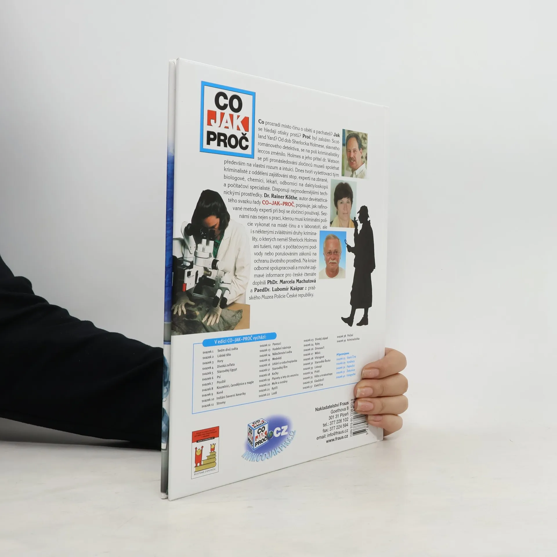 Populárně-naučná publikace pro děti seznamuje s kriminalistikou, oborem zabývajícím se zločinem a odhalováním pachatelů. Další kniha z edice "Co - Jak - Proč" přináší informace o historii kriminalistiky, dále využití nejmodernějších technologií jak z oboru genetiky a soudního lékařství, tak i z oblasti techniky a mnohé další zajímavosti, které se vážou k dané tematice.
