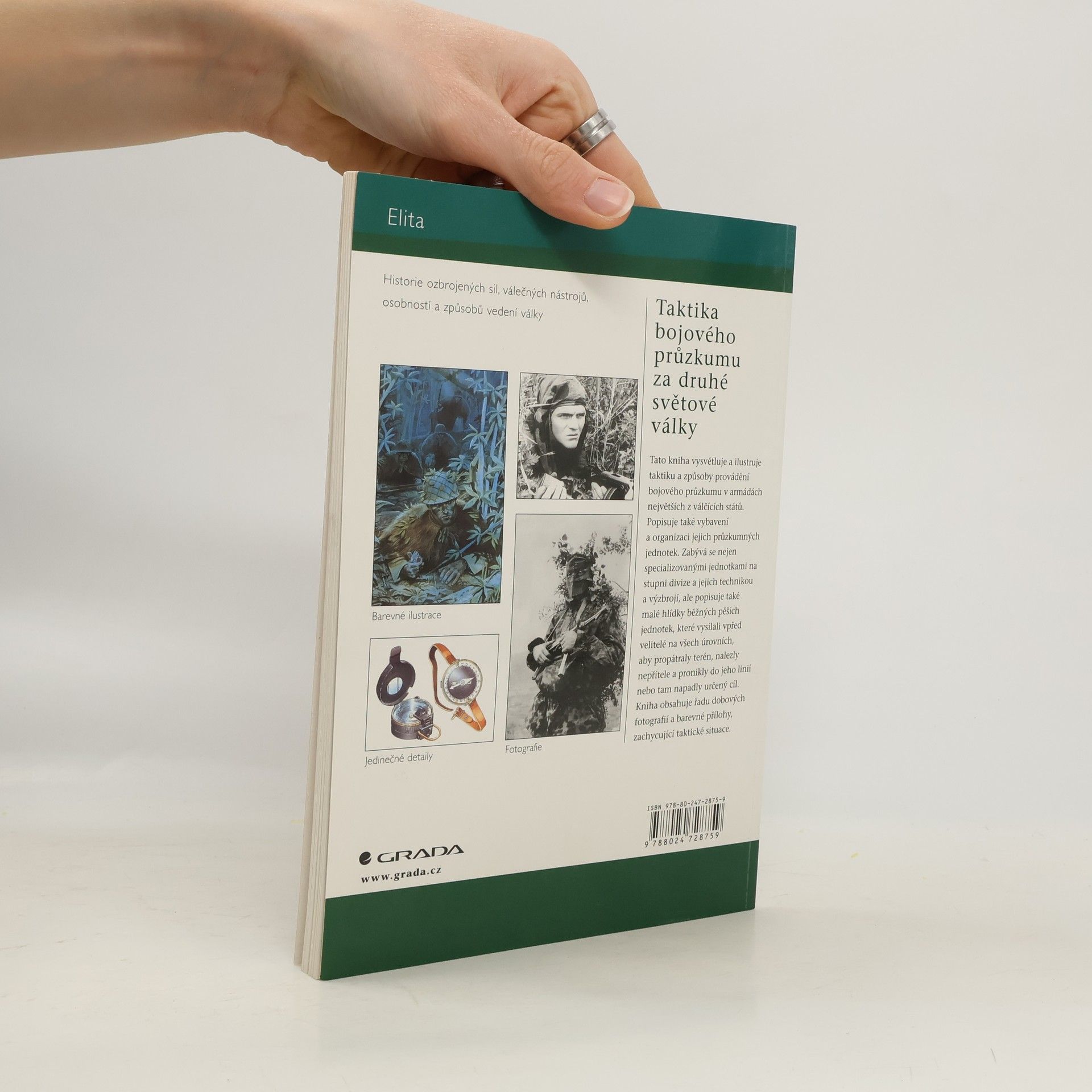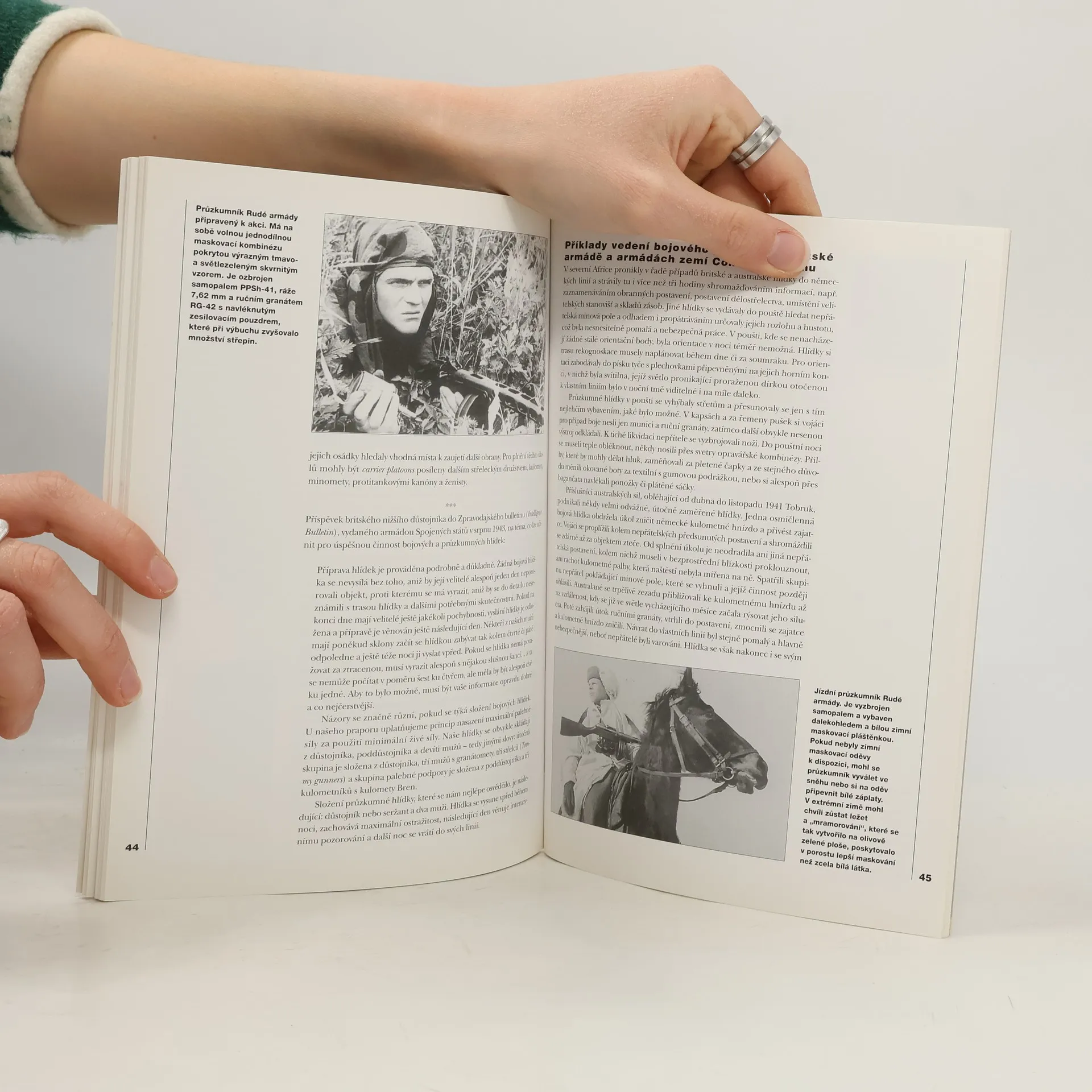 Čtenáři se v této knížce podrobně seznámí s taktikou a způsobem provádění bojového průzkumu v armádách největších válčících států, USA, Velké Británie, Sovětského svazu, Německa a Japonska. Autor popisuje vybavení, výzbroj a organizaci jejich průzkumných jednotek, a to nejen na úrovni divize, ale pozornost věnuje také malým hlídkám běžných pěších jednotek, které byly vysílány vpřed, aby propátraly terén, nalezly nepřítele a pronikly do jeho linií. Objasněny jsou úkoly hlídek, cíle a prostředky průzkumu, používání map a fotografií, speciální výbavy, jako byly buzoly a dalekohledy, způsoby pohybu hlídek, typy a hodnocení výhod a nevýhod používaných dopravních prostředků, typy maskování, spojovací technika atd. Fakty nabitá kniha obsahuje řadu dobových fotografií a barevné přílohy zachycující taktické situace.