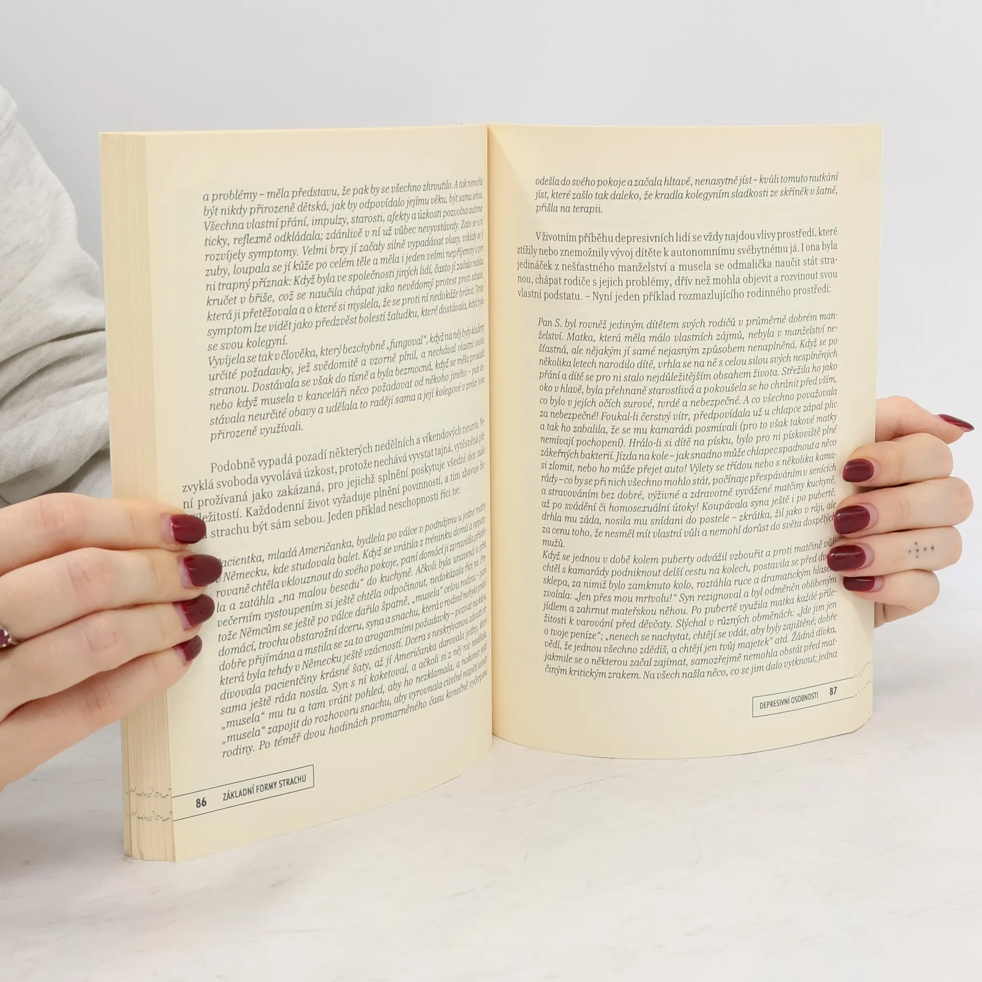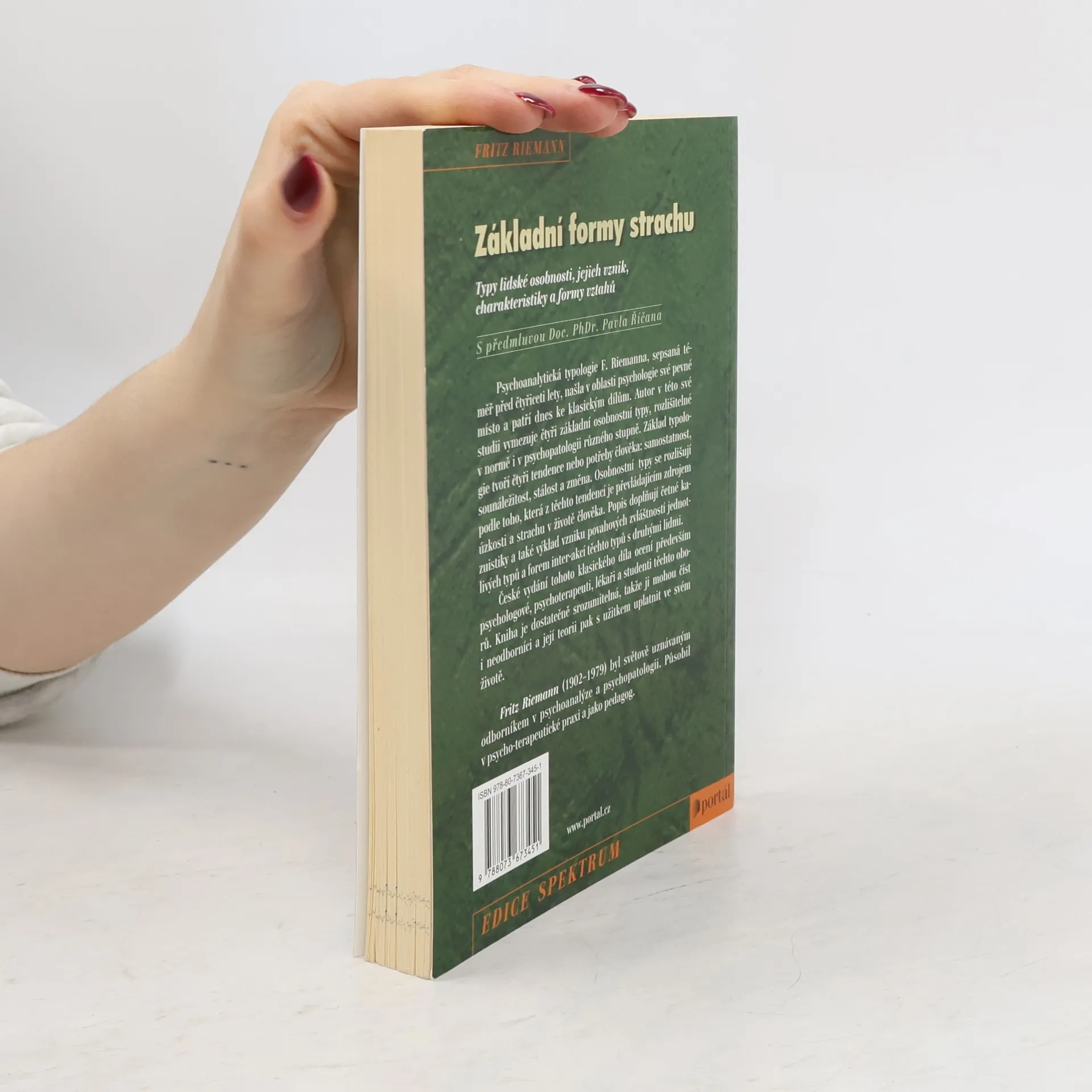 Typy lidské osobnosti, jejich vznik, charakteristiky a formy vztahů. Opětovné vydání psychoanalytické typologie F. Riemanna, jež byla sepsána téměř před čtyřiceti lety, dnes patří ke klasickým dílům, jež si našla v oblasti psychologie své pevné místo. Studie podává vymezení čtyř základních osobnostních typů, rozlišitelných v normě i v psychopatologii různého stupně. Základ typologie tvoří čtyři potřeby či tendence člověka - potřeba samostatnosti, sounáležitosti, stálosti a změny. Osobnostní typy se pak liší tím, která z těchto tendencí je převládajícím zdrojem úzkosti a strachu v životě člověka. Popis doplňují četné kasuistiky, výklad vzniku a povahové zvláštnosti typů či formy interakcí jednotlivých typů s druhými lidmi.
