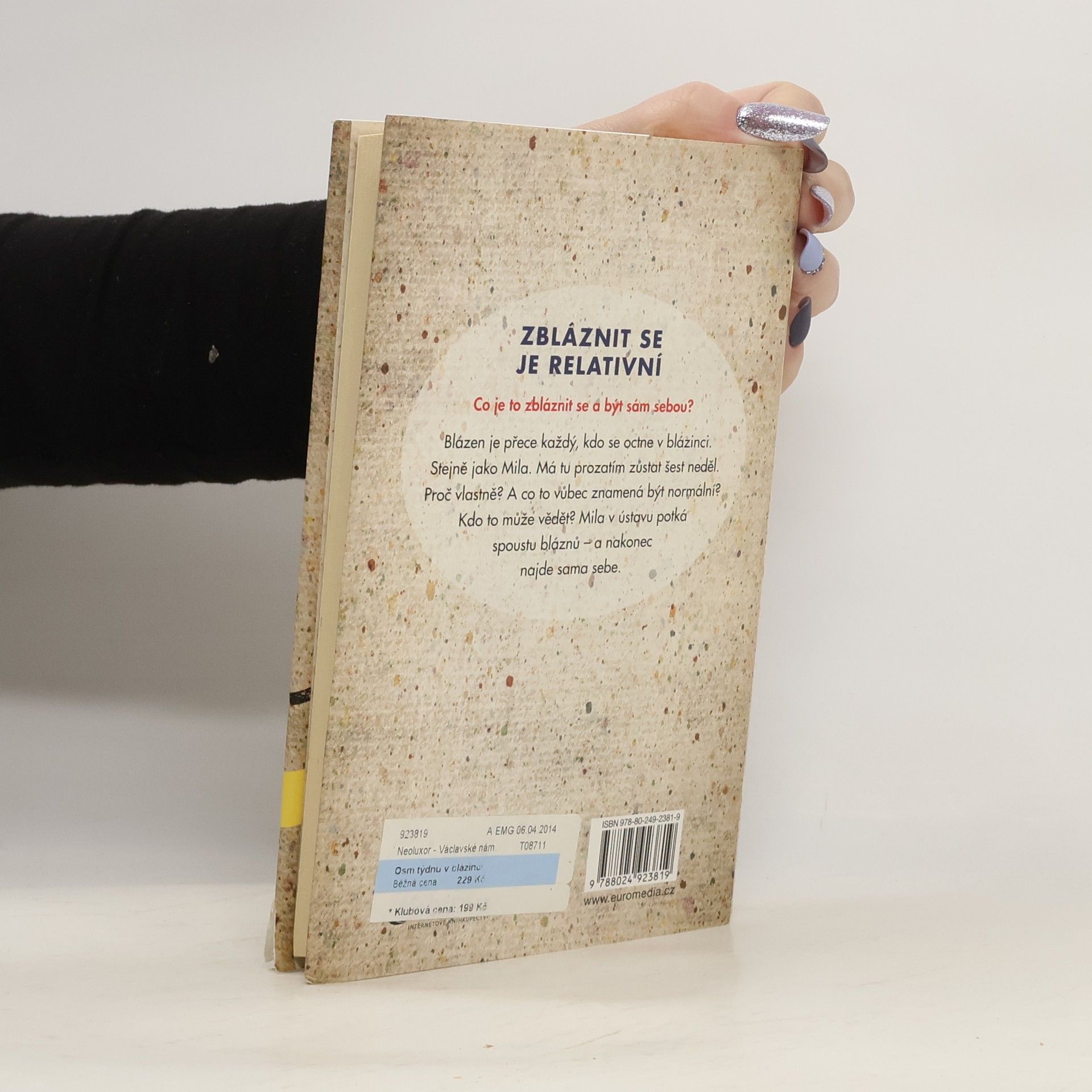 Osm týdnů v bláznici je autentický, působivý román o šílenství v časech normálnosti. Třicetiletá Mila se s diagnózou deprese octne na psychosomatické klinice. Její ambiciózní rodiče jsou z toho šokovaní a nejen u nich, ale i u Milina přítele vyvolá tento fakt jisté obavy a úzkost. Nikdo z těch, kdo se v takovém zařízení octnou, přece nemůže být normální, že? Ale nakolik je vlastně Mila blázen?