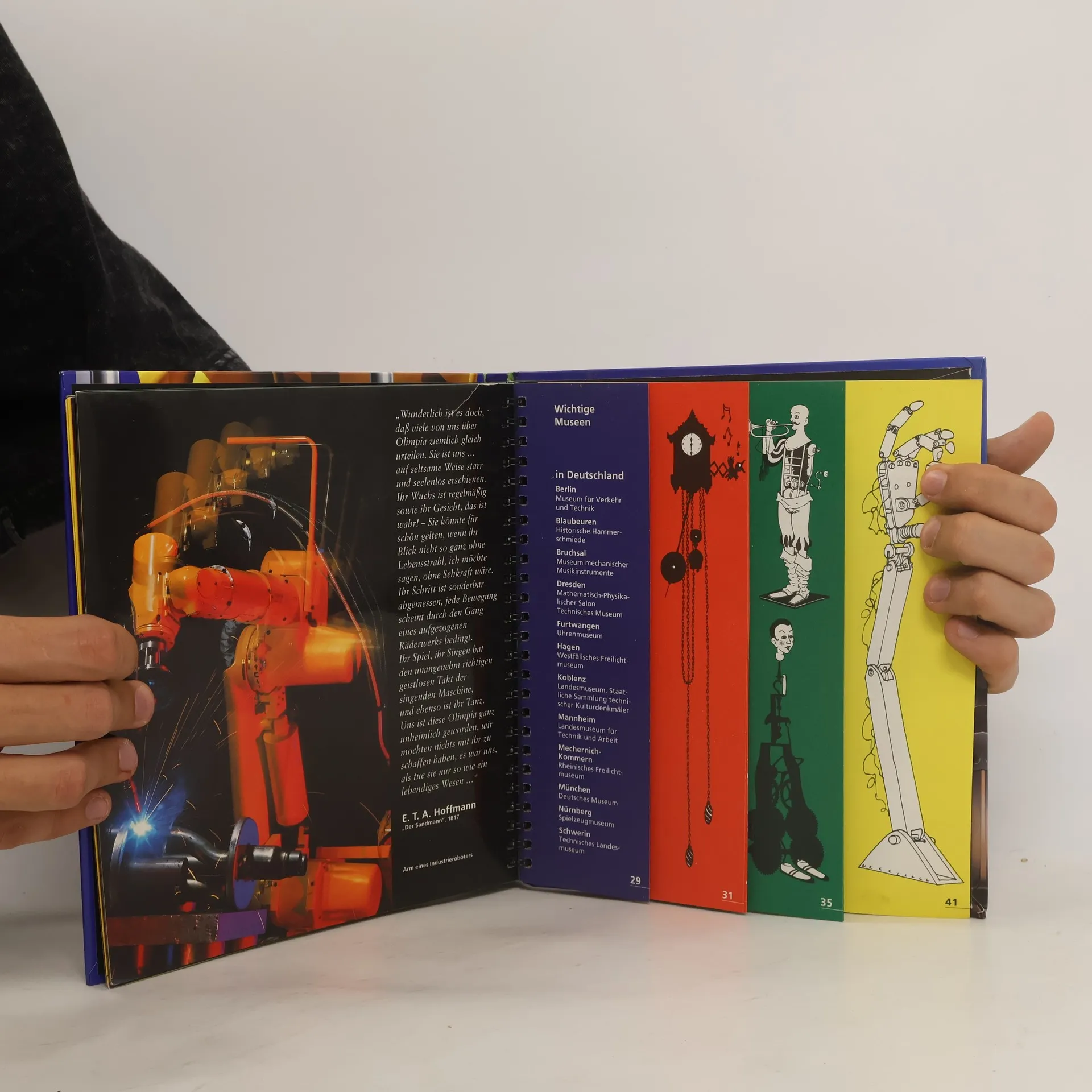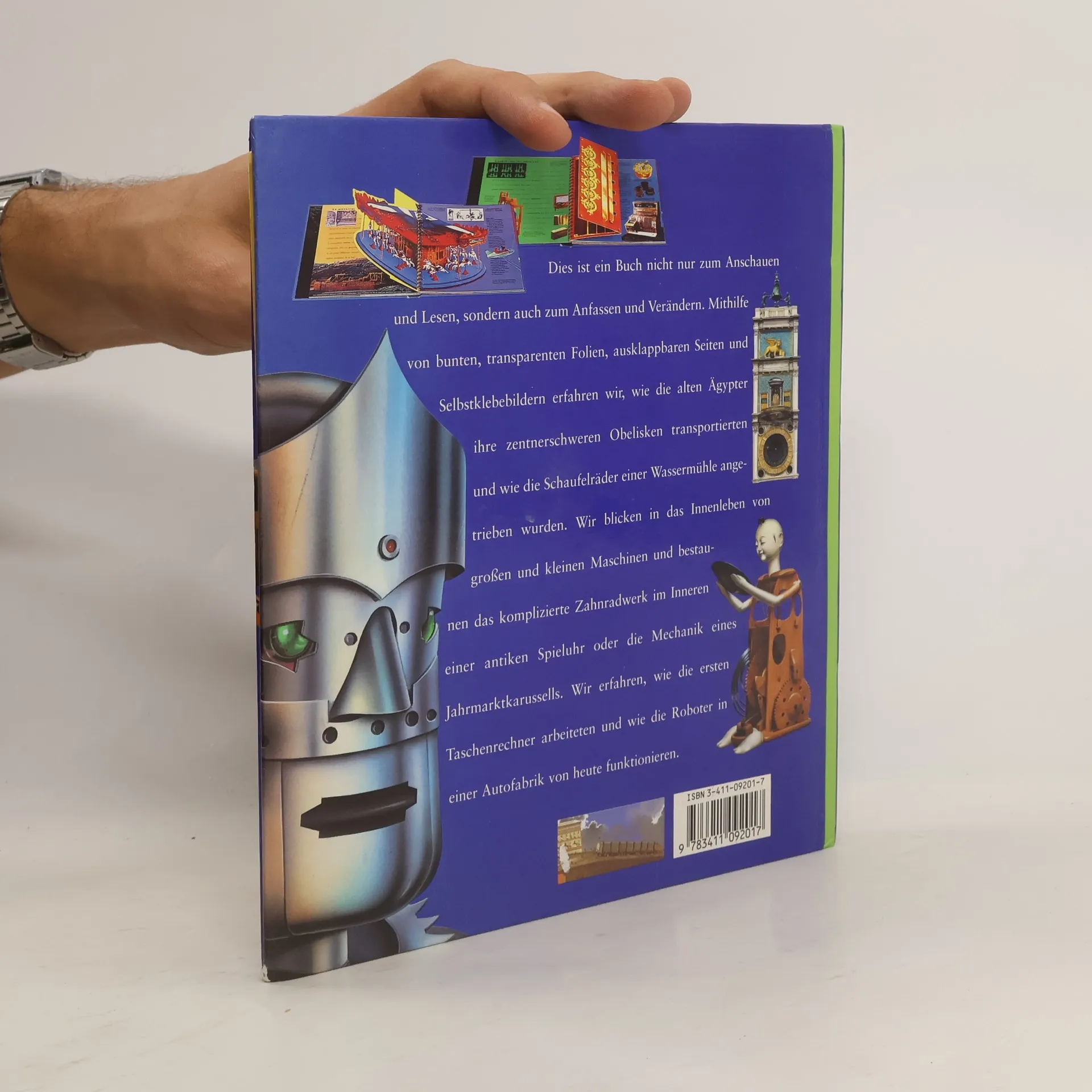 Dies ist ein Buch nicht nur zum Anschauen und Lesen, sondern auch zum Anfassen und Verändern. Mit Hilfe von bunten, transparenten Folien, ausklappbaren Seiten und Sekbstklebebildern erfahren wir, wie die alten Ägypter ihre zentnerschweren Obelisken transportierten und wie die Schaufelräder einer Wassermühle angetrieben wurden. Wir blicken in das Innenleben von großen und kleinen Maschinen und bestaunen das komplizierte Zahnwerk im Innern einer antiken Spieluhr oder die Mechanik eines Jahrmarktkarusells. Wir erfahren, wie die Roboter in einer Autofabrik von heute funktionieren.