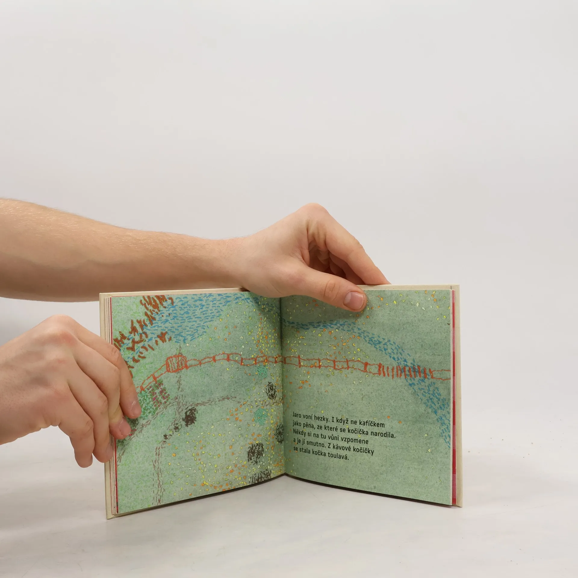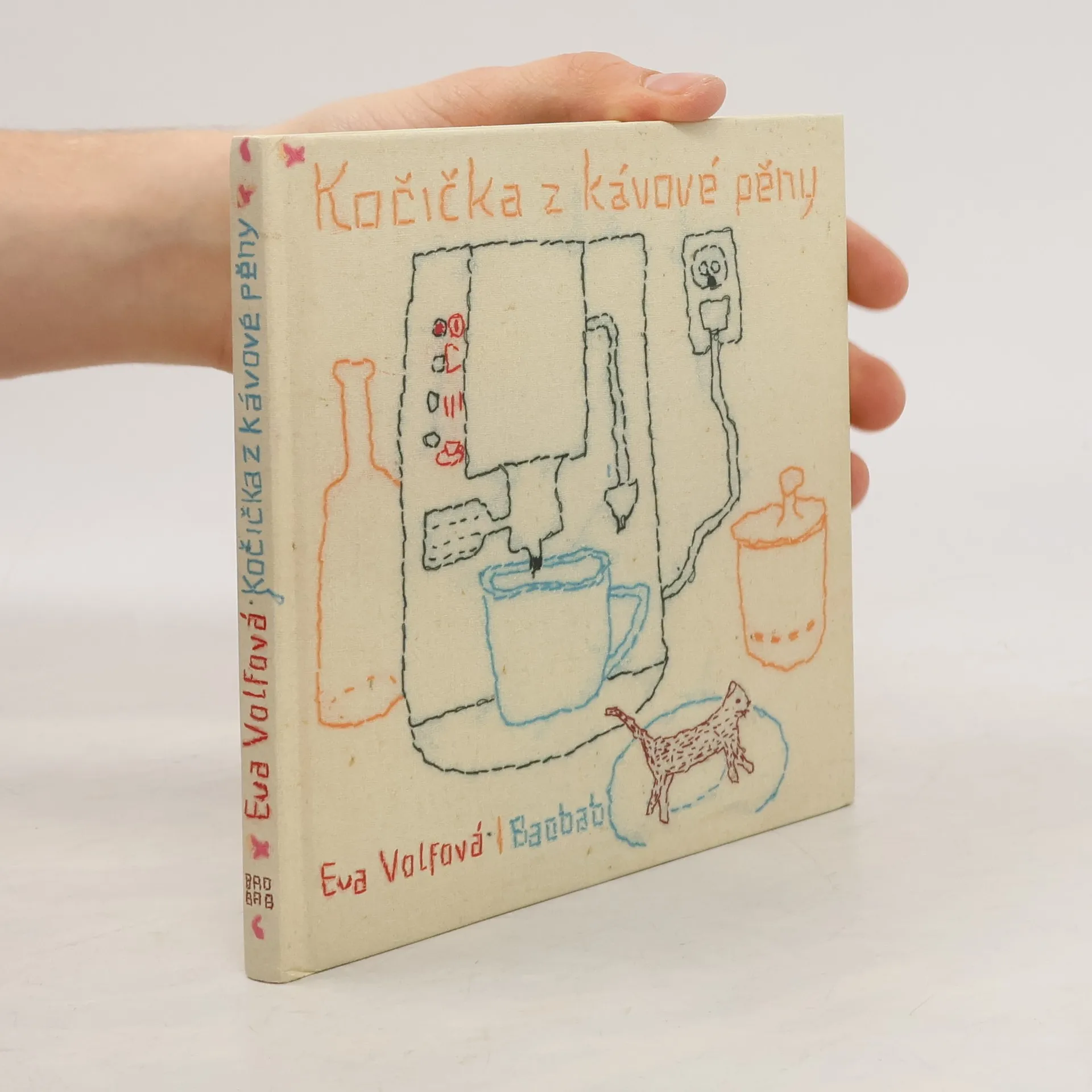 Kočička z kávové pěny se toulá předměstskou krajinou - zimou, jarem i létem a hledá známé vůně domova. Eva Volfová proměnila látky, hadry, prachovky a utěrky v čisté obrazy a křehký příběh pro nejmenší čtenáře. Ilustrace textem doprovodila Tereza Horváthová. Tato obrazová pohádka vypráví o kočičce zrozené z teplé kávy a nadýchané pěny, kterou její nevědomí stvořitelé vyhnali z domu... Jednotlivé obrazy jsou vyšity barevnými nitěmi na starých látkách. V tomto svérázném fiktivním obrazovém prostředí ve stylu arte povera je pak zasazen jednoduchý a krátký doprovodný text. Barevnost jednotlivých použitých materiálů podtrhuje gradaci děje s jeho klidnějšími i dynamičtějšími částmi, nepřesné "tahy" nití vykreslujících scénu a její subjekty jsou zkratkovité a naivitou simulují dětskou ruku.