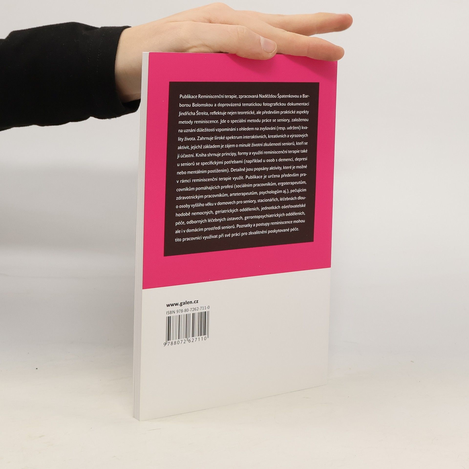 Publikace, zpracovaná Naděždou Špatenkovou a Barborou Bolomskou a doprovázená tematickou fotografickou dokumentací Jindřicha Štreita, reflektuje nejen teoretické, ale především praktické aspekty metody reminiscence. Jde o speciální metodu práce se seniory, založenou na uznání důležitosti vzpomínání s ohledem na zvyšování (resp. udržení) kvality života. Zahrnuje široké spektrum interaktivních, kreativních a výrazových aktivit, jejichž základem je zájem o minulé životní zkušenosti seniorů, kteří se jí účastní. Kniha shrnuje principy, formy a využití reminiscenční terapie také u seniorů se specifickými potřebami (např. u osob s demencí, depresí nebo mentálním postižením). Detailně jsou popsány aktivity, které je možné v rámci reminiscenční terapie využít. Publikace je určena především pracovníkům pomáhajících profesí (sociálním pracovníkům, ergoterapeutům, zdravotnickým pracovníkům, arteterapeutům, psychologům aj.), pečujícím o osoby vyššího věku v domovech pro seniory, stacionářích, léčebnách dlouhodobě nemocných, geriatrických odděleních, jednotkách ošetřovatelské péče, odborných léčebných ústavech, gerontopsychiatrických odděleních, ale i v domácím prostředí seniorů. Poznatky a postupy reminiscence mohou tito pracovníci využívat při své práci pro zkvalitnění poskytované péče.