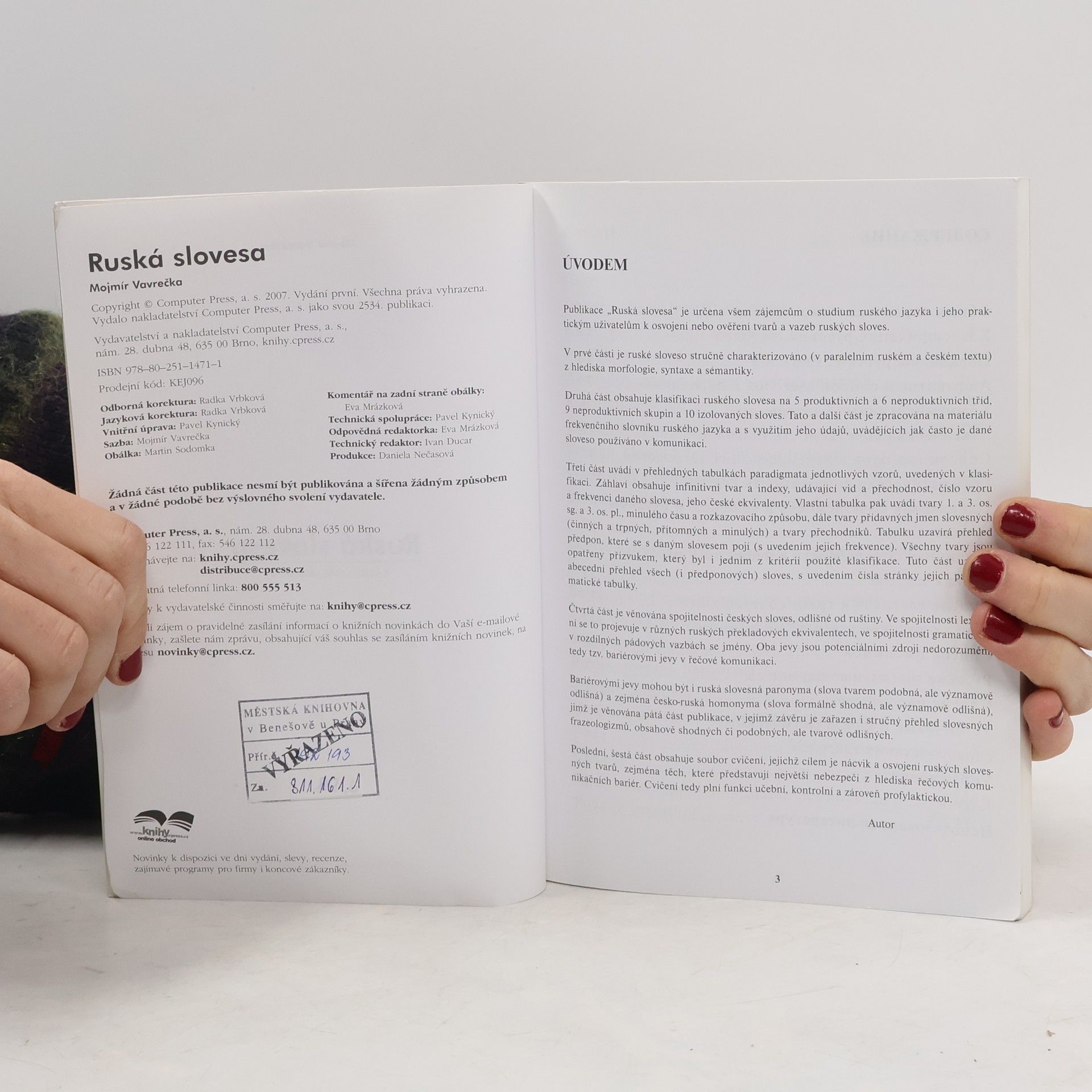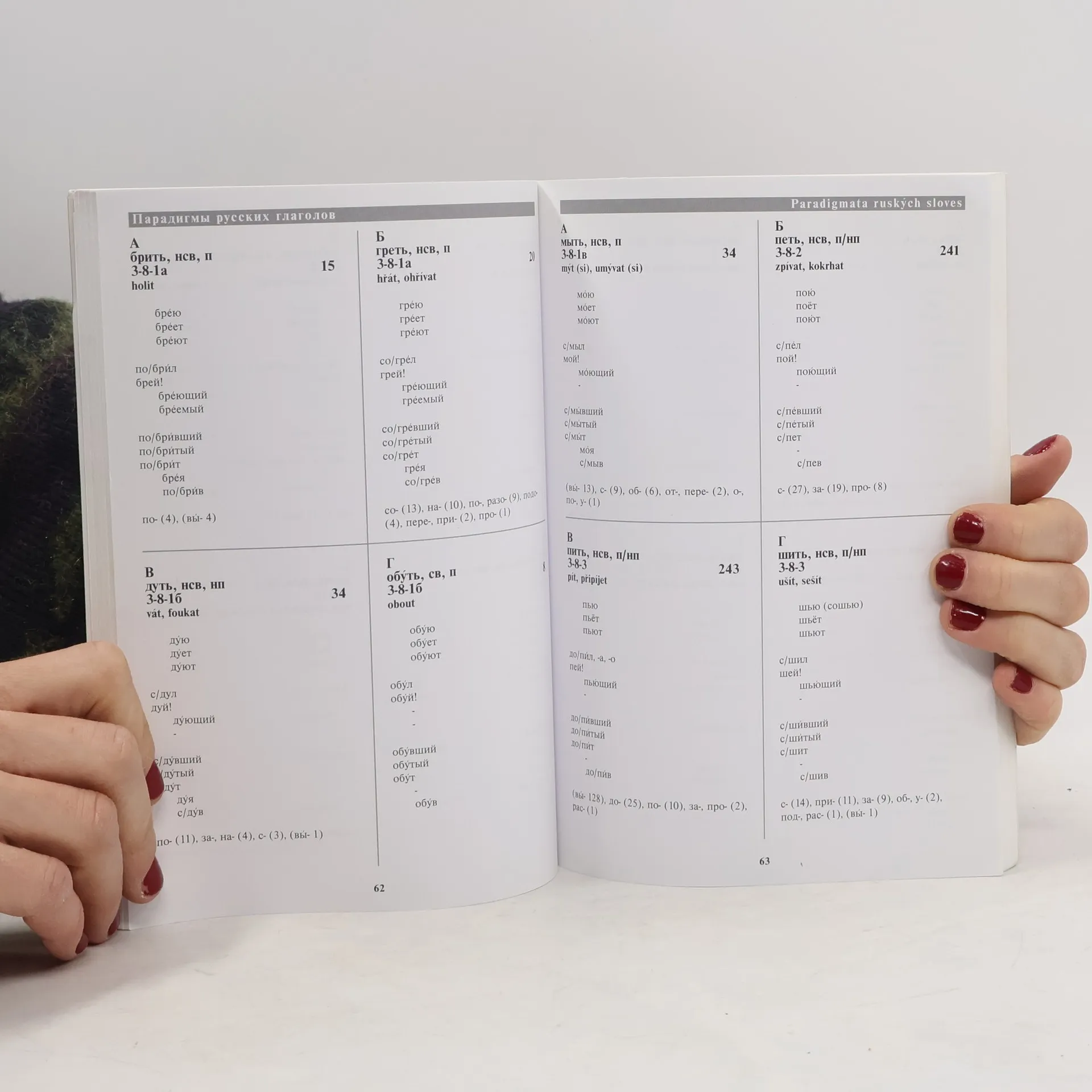 Publikace je určena všem zájemcům o studium ruského jazyka k osvojení nebo ověření tvarů a vazeb ruských sloves, využijí ji tedy učitelé a studenti ruského jazyka, prospěšná bude i překladatelům. Kniha obsahuje klasifikaci sloves do jednotlivých tříd, skloňování podle vzorů, přechodnost sloves, tvary přídavných jmen slovesných, tvary přechodníků. V závěrečné části jsou cvičení sloužící k upevnění probírané látky.