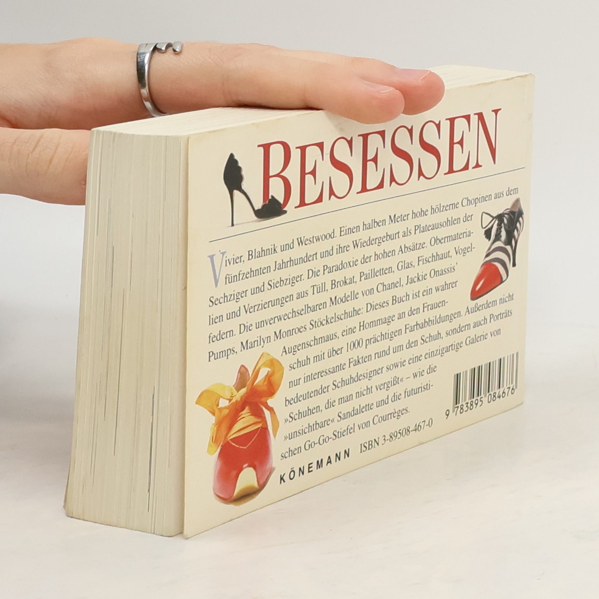 Besessen - Vivier, Blahnik und Westwood. Einen halben Meter hohe hölzerne Chopinen aus dem fünfzehnten Jahrhundert und ihre Wiedergeburt als Plateausohlen der Sechziger und Siebziger. Die Paradoxie der hohen Absätze. Obermaterialien und Verzierungen aus Tüll, Brokat, Pailletten, Glas, Fischhaut, Vogelfedern. Die unverwechselbaren Modelle von Chanel, Jackie Onassis' Pumps, Marilyn Monroes Stöckelschuhe: Dieses Buch ist ein wahrer Augenschmaus, eine Hommage an den Frauenschuh mit über 1000 prächtigen Farbabbildungen. Außerdem nicht nur interessante Fakten rund um den Schuh, sondern auch Porträts bedeutender Schuhdesigner sowie eine einzigartige Galerie von "Schuhen, die man nicht vergißt" - wie die "unsichtbare" Sandalette und die futuristischen Go-Go-Stiefel von Courrèges.