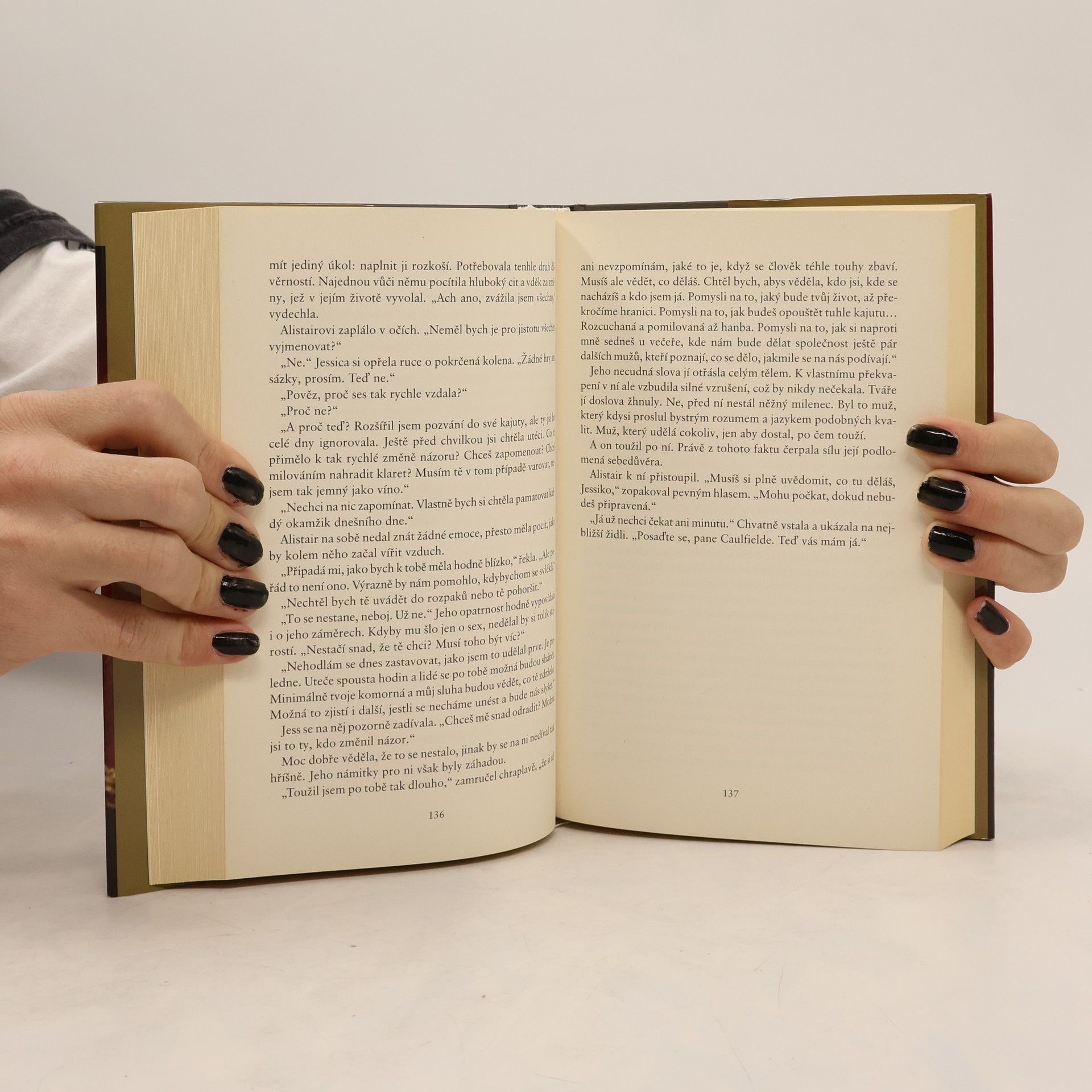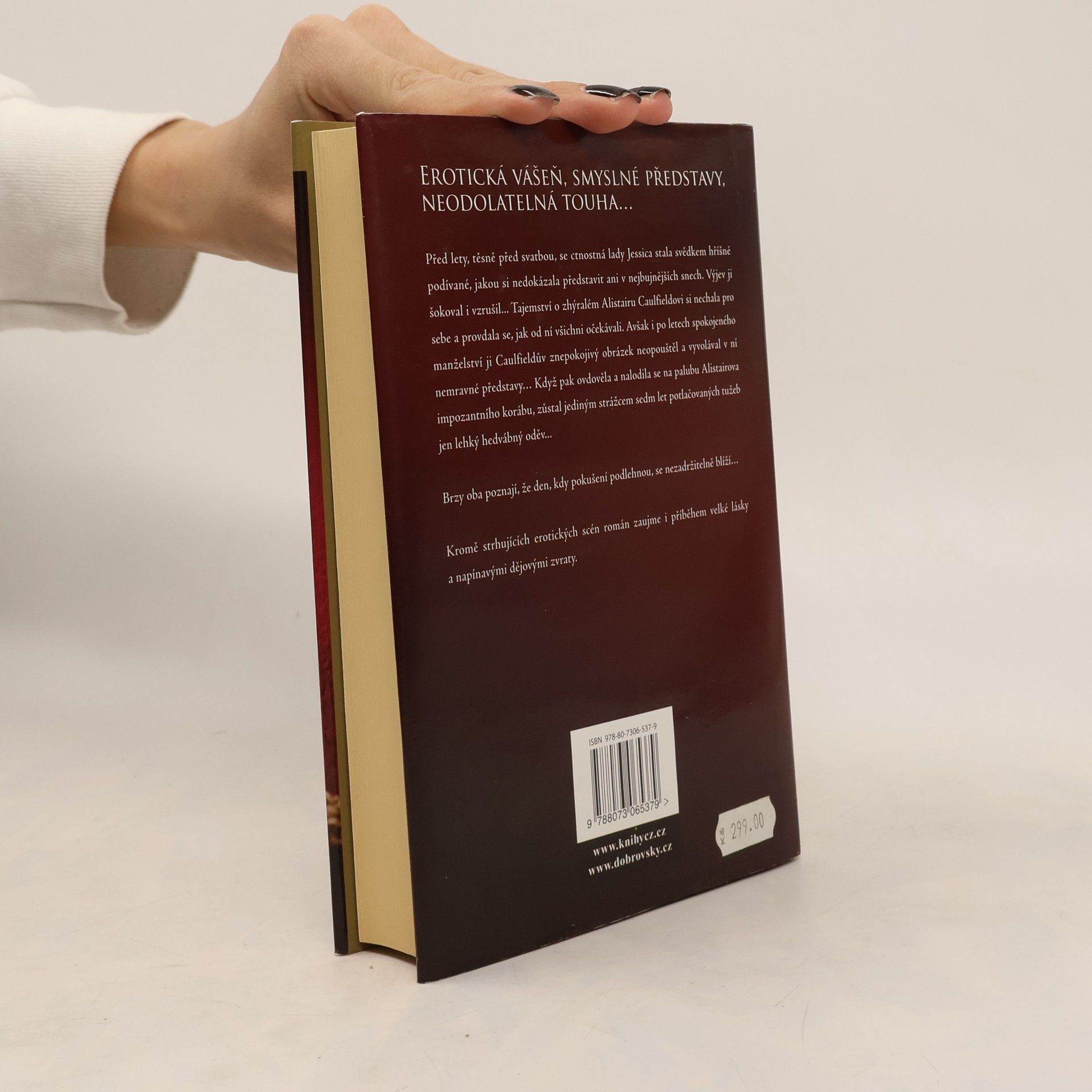 Před sedmi lety, v předvečer své vlastní svatby, se ctnostná a spořádaná lady Jessica Sheffieldová stala svědkem hříšné podívané, jakou si taková nevinná mladá dáma nikdy nedokázala představit. Tento výjev ji šokoval a podivně vzrušil zároveň. Tajemství o zhýralém Alistairu Caulfieldovi si nechala pro sebe a provdala se, jak od ní všichni očekávali. Avšak i po dlouhých letech poklidného a šťastného manželství ji Caulfieldův obrázek neopouštěl a vyvolával v ní nemravné představy… …o to sladší pak byla odměna. Alistair utekl od představy nádherné lady Jessiky s vášnivým pohledem v očích až do Západní Indie. Coby úspěšný obchodník měl už jen málo společného s chlípníkem, jakého kdysi znala. Když se čerstvě ovdovělá Jessica nalodila na palubu jeho impozantního korábu na cestu přes oceán, zůstane jediným strážcem sedm let potlačovaných tužeb jen pár vrstev jemného hedvábí. Brzy oba poznají, že den, kdy pokušení podlehnou, se nezadržitelně blíží…