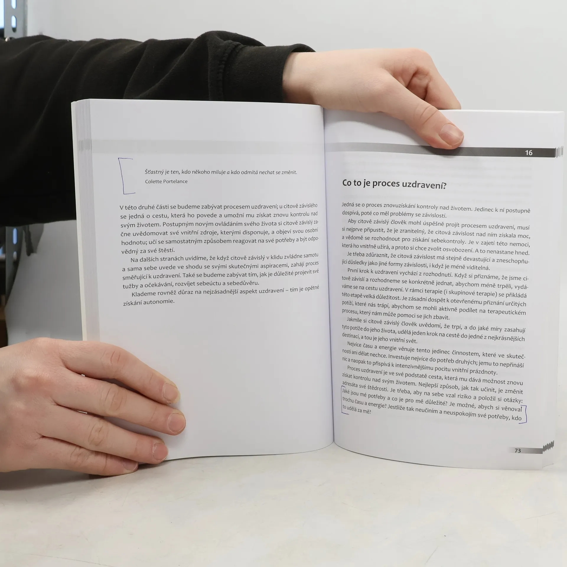 Jak se z ní vymanit. Citová závislost je velkým handicapem. Znamená, že člověk se přestane respektovat, věřit si, mít důvěru ve vztahy a žije jen pohledem toho druhého. A navíc s neodpovídající odezvou ze strany toho druhého, případně se ztrátou vztahu dotyčný citově závislý prožívá duševní utrpení. Tato závislost se projevuje nezdravě v citovém životě nejen v milostných vztazích (s důsledky násilí a nezdravé žárlivosti), ale její projevy lze nalézt někdy v přátelských, rodinných vztazích a u některých jedinců i v rámci pracovních vztahů a terapie. Kdo je citově závislý, jak to zjišťovat, co je zdrojem trápení a hlavně, jak se takový člověk může z citové závislosti vymanit, o tom pojednává tato kniha. Autorka nabízí řadu prostředků, které pomohou dotyčným osobám zbavit se utrpení.