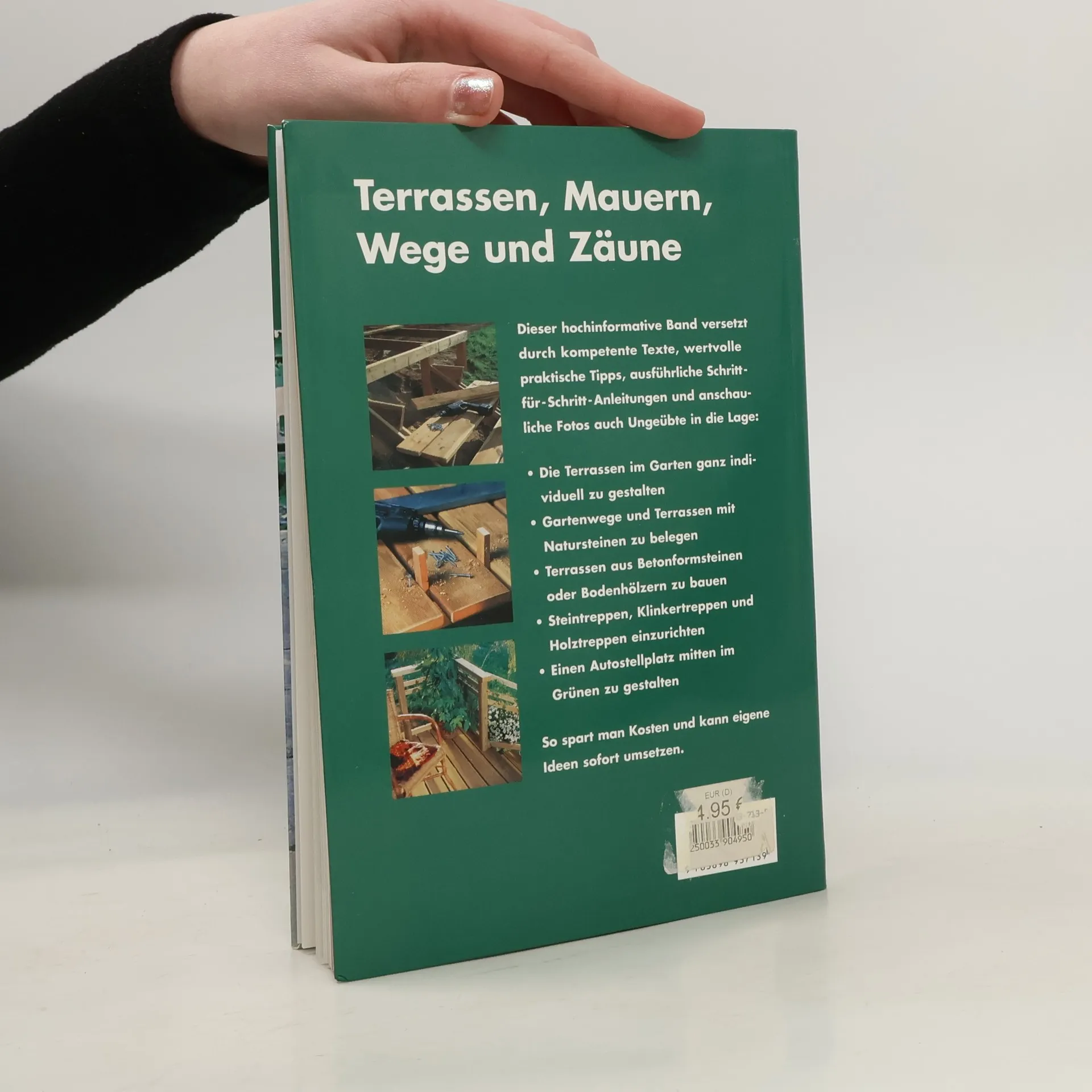 Abgesehen vom Cover völlig unveränderte Lizenzausgabe eines ursprünglich im RowohltVerlag veröffentlichten Titels (BA 10/97), jetzt zum halben Preis. Der praktische Ratgeber erklärt Heimwerkern, wie Terrassen im Garten gestaltet, Gartenwege und Terrassen mit Natursteinen belegt, Terrassen aus Betonformsteinen oder Bodenhölzern gebaut, Steintreppen, Klinkertreppen und Holztreppen eingerichtet oder ein Autoabstellplatz mitten im Grünen installiert werden können u.v.m. Gut verständliche Textinformationen und zahlreiche Expertentipps, unterstützt durch ausführliche SchrittfürSchrittAnleitungen und anschauliche Fotos sorgen dafür, dass auch der Laie, Voraussetzung ist allerdings doch einiges handwerkliche Geschick, die gezeigten Projekte umsetzen kann. In Münster ist die Originalausgabe ein absoluter Ausleihrenner und steht quasi nie im Regal. Das hervorragende PreisLeistungsVerhältnis sollte viele Bibliotheken zur Erst und Neuanschaffung animieren. (2