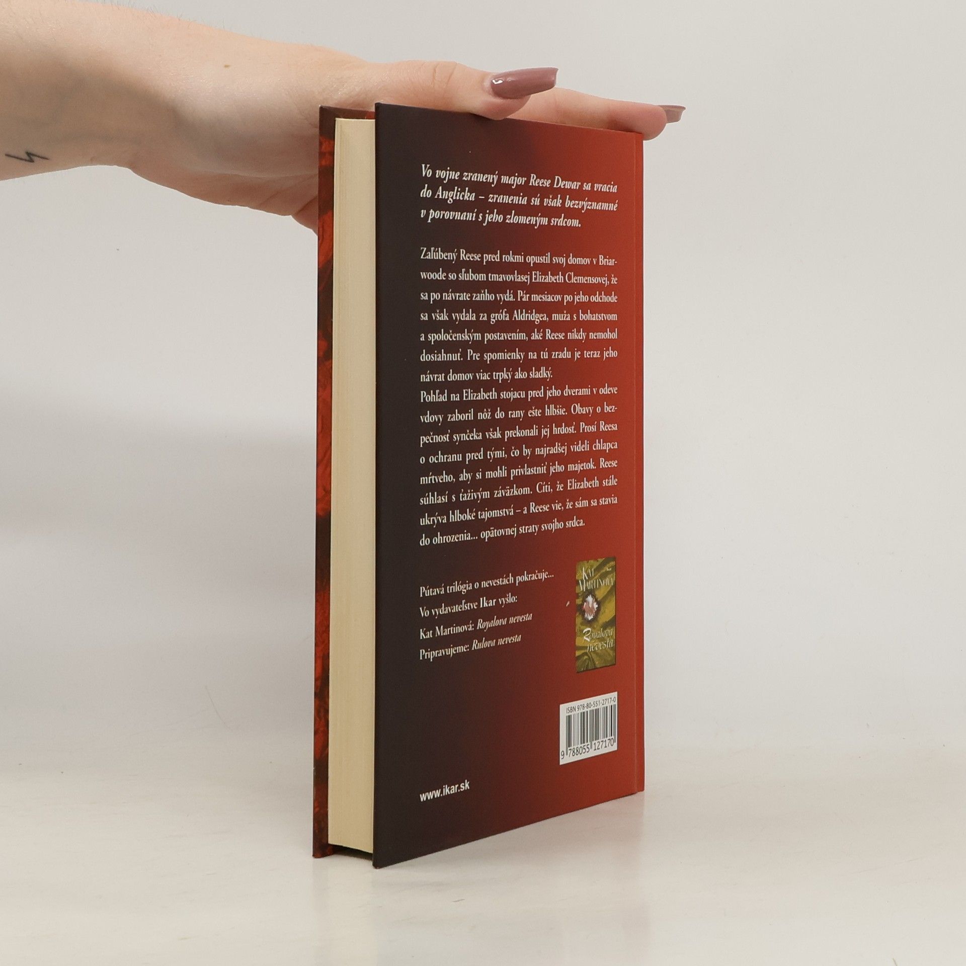 Po románe Royalova nevesta pútavá trilógia o nevestách pokračuje... Zaľúbený Reese pred rokmi opustil svoj domov v Briarwoode so sľubom tmavovlasej Elizabeth Clemensovej, že sa po návrate zaňho vydá. Pár mesiacov po jeho odchode sa však vydala za grófa Aldridgea, muža s bohatstvom a spoločenským postavením, aké Reese nikdy nemohol dosiahnuť. Pre spomienky na tú zradu je teraz jeho návrat domov viac trpký ako sladký. Pohľad na Elizabeth stojacu pred jeho dverami v odeve vdovy zaboril nôž do rany ešte hlbšie. Obavy o bezpečnosť synčeka však prekonali jej hrdosť. Prosí Reesa o ochranu pred tými, čo by najradšej videli chlapca mŕtveho, aby si mohli privlastniť jeho majetok. Reese súhlasí s ťaživým záväzkom. Cíti, že Elizabeth stále ukrýva hlboké tajomstvá – a Reese vie, že sa sám stavia do ohrozenia... opätovnej straty svojho srdca.