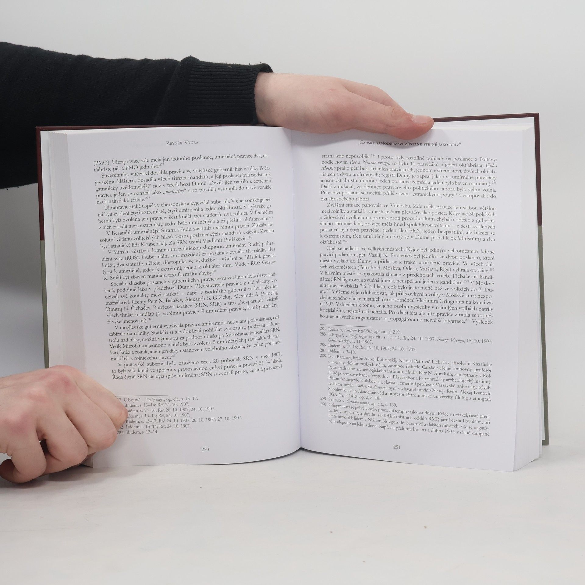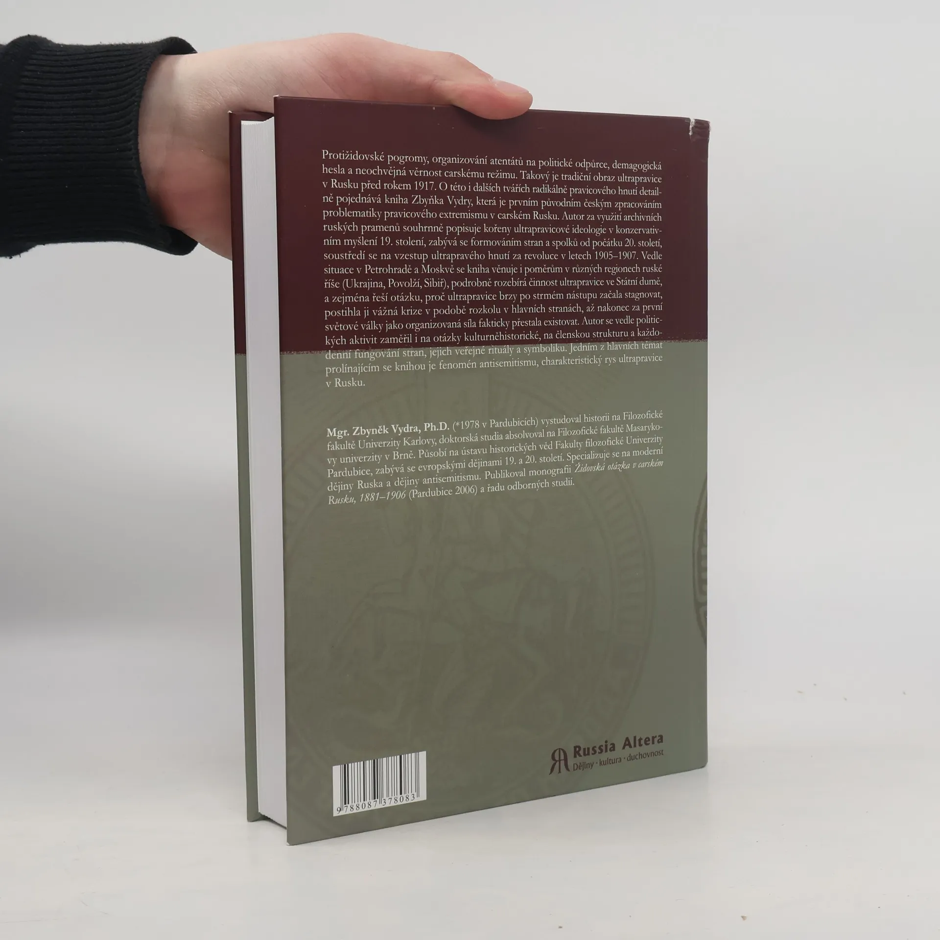 Protižidovské pogromy, organizování atentátů na politické odpůrce, demagogická hesla a neochvějná věrnost carskému režimu. Takový je tradiční obraz ultrapravice v Rusku před rokem 1917. O této i dalších tvářích radikálně pravicového hnutí detailně pojednává kniha Zbyňka Vydry, která je prvním původním českým zpracováním problematiky pravicového extremismu v carském Rusku. Autor za využití archivních ruských pramenů souhrnně popisuje kořeny ultrapravicové ideologie v konzervativním myšlení 19. stolení, zabývá se formováním stran a spolků od počátku 20. století, soustředí se na vzestup ultrapravého hnutí za revoluce v letech 1905-1907. Vedle situace v Petrohradě a Moskvě se kniha věnuje i poměrům v různých regionech ruské říše (Ukrajina, Povolží, Sibiř), podrobně rozebírá činnost ultrapravice ve Státní dumě, a zejména řeší otázku, proč ultrapravice brzy po strmém nástupu začala stagnovat, postihla ji vážná krize v podobě rozkolu v hlavních stranách, až nakonec za první světové války jako organizovaná síla fakticky přestala existovat. Autor se vedle politických aktivit zaměřil i na otázky kulturněhistorické, na členskou strukturu a každodenní fungování stran, jejich veřejné rituály a symboliku. Jedním z hlavních témat prolínajícím se knihou je fenomén antisemitismu, charakteristický rys ultrapravice v Rusku.