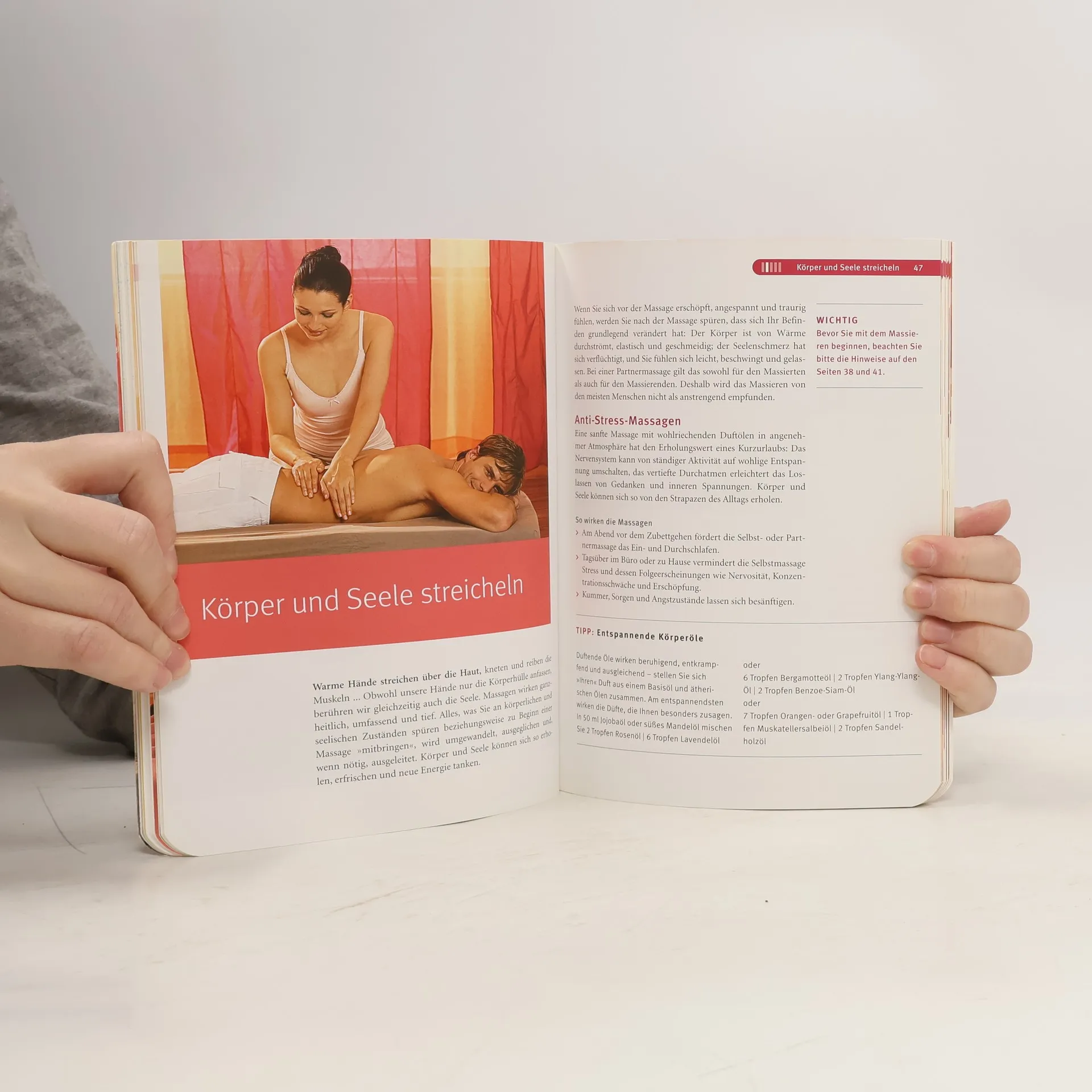 Massagen sind eine Wohltat für Körper und Seele: Millionen von Sinneszellen melden die sanften Berührungen an unser Gehirn, das faszinierende Reaktionen in unserem Körper auslöst. Ängste, Stress und Verspannungen werden abgebaut, typische Alltagsbeschwerden und Schmerzen gelindert, das Immunsystem gestärkt. Massagen sind ein großartiges Mittel zur Selbsthilfe - wohltuend und frei von Nebenwirkungen. Von Akupressur bis Thai-Massage - die Autorin gibt zu den aktuellen Methoden einen guten Überblick. Anhand einfacher, genauer Anleitungen können auch Ungeübte die wohltuenden Selbst- und Partnermassagen problemlos durchführen. Auch für Babys werden sanfte, beruhigende Massagen vorgestellt. Das Buch enthält außerdem einen heraustrennbaren Folder für die Partnermassage am Rücken und die Selbstmassage von Kopf und Gesicht.