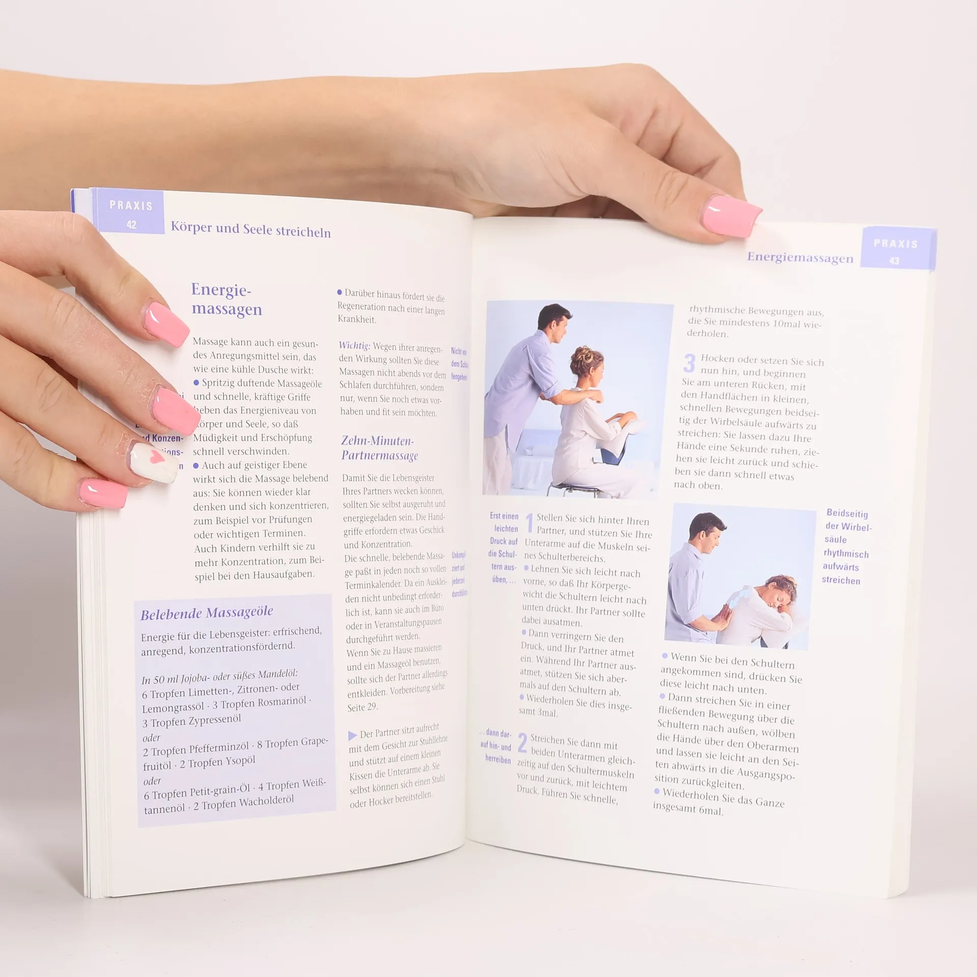 Massagen sind eine Wohltat für Körper und Seele: Millionen von Sinneszellen melden die sanften Berührungen an unser Gehirn, das faszinierende Reaktionen in unserem Körper auslöst. Ängste, Stress und Verspannungen werden abgebaut, typische Alltagsbeschwerden und Schmerzen gelindert, das Immunsystem gestärkt. Massagen sind ein großartiges Mittel zur Selbsthilfe - wohltuend und frei von Nebenwirkungen. Von Akupressur bis Thai-Massage - die Autorin gibt zu den aktuellen Methoden einen guten Überblick. Anhand einfacher, genauer Anleitungen können auch Ungeübte die wohltuenden Selbst- und Partnermassagen problemlos durchführen. Auch für Babys werden sanfte, beruhigende Massagen vorgestellt. Das Buch enthält außerdem einen heraustrennbaren Folder für die Partnermassage am Rücken und die Selbstmassage von Kopf und Gesicht.