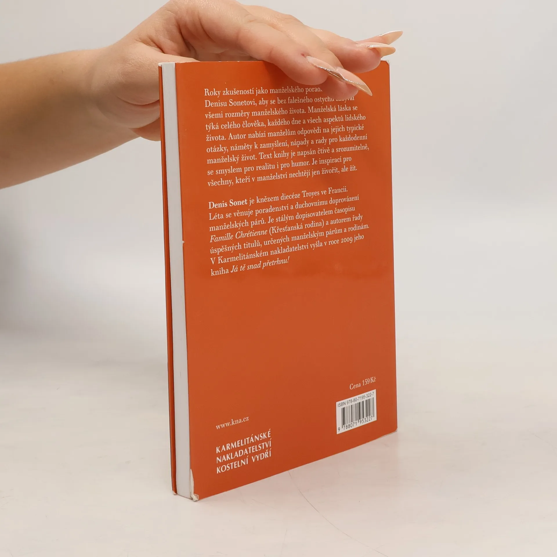 Manželská láska se týká celého člověka a každého dne. Proto je třeba uvažovat o všech aspektech života. Například o komunikaci jako zdroji informací z denního života, o fantazii jako zdroji podnětů pro potřebné změny, ke kterým v průběhu času dochází. Autor využívá své mnohaleté zkušenosti, které získal jako pracovník manželské poradny a nabízí čtenářům odpovědi na jejich otázky, náměty k zamyšlení, nápady a rady pro každodenní manželský život: Oživovat plamen lásky každý den, překonávat krize malé i velké. Komunikovat, abychom měli potřebné informace, a snít, abychom uměli udělat potřebné změny. Chtěl Bůh, abychom spolu žili právě my dva? Co bude, až budeme staří? Text je napsán stručně, srozumitelně, se smyslem pro realitu, ale i s humorem. Denis Sonet je knězem diecéze Troyes ve Francii. Léta se věnuje poradenství a duchovnímu doprovázení manželských párů a pro své zkušenosti a komunikační schopnosti se stal rovněž vyhledávaným řečníkem pro různé konference. Je stálým dopisovatelem časopisu Famille Chrétienne (Křesťanská rodina) a autorem řady úspěšných titulů, určených manželským párům a rodinám.
