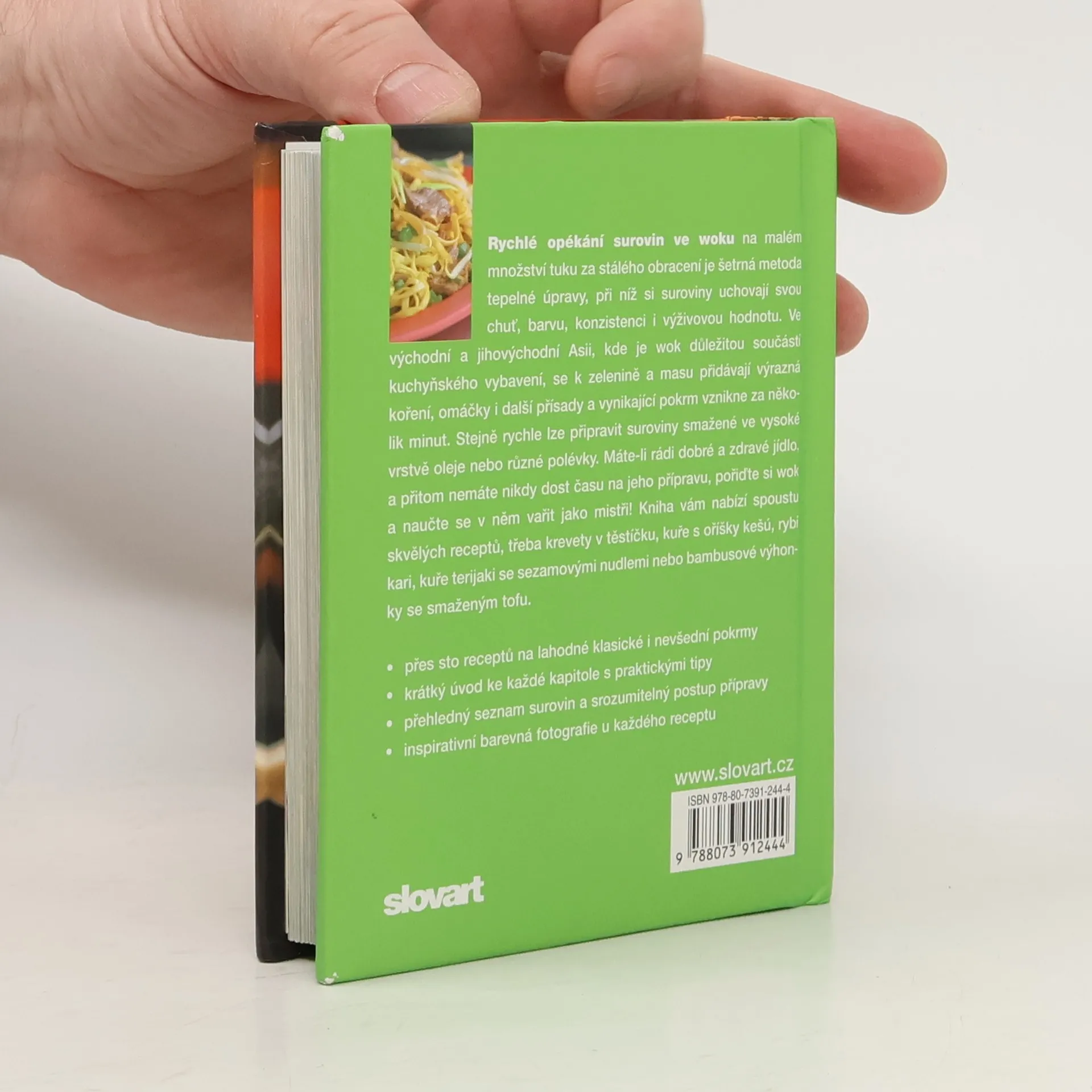 Rychlé opékání surovin ve woku na malém množství tuku za stálého obracení je šetrná metoda tepelné úpravy, při níž si suroviny uchovají svou chuť, barvu, konzistenci i výživovou hodnotu. Ve východní a jihovýchodní Asii, kde je wok důležitou součástí kuchyňského vybavení, se k zelenině a masu přidávají výrazná koření, omáčky i další přísady a vynikající pokrm vznikne za několik minut. Máte-li rádi dobré a zdravé jídlo, a přitom nemáte nikdy dost času na jeho přípravu, pořiďte si wok a naučte se v něm vařit jako mistři! Kniha vám nabízí spoustu skvělých receptů, třeba krevety v těstíčku, kuře s oříšky kešú, rybí kari, kuře terijaki se sezamovými nudlemi nebo bambusové výhonky se smaženým tofu.