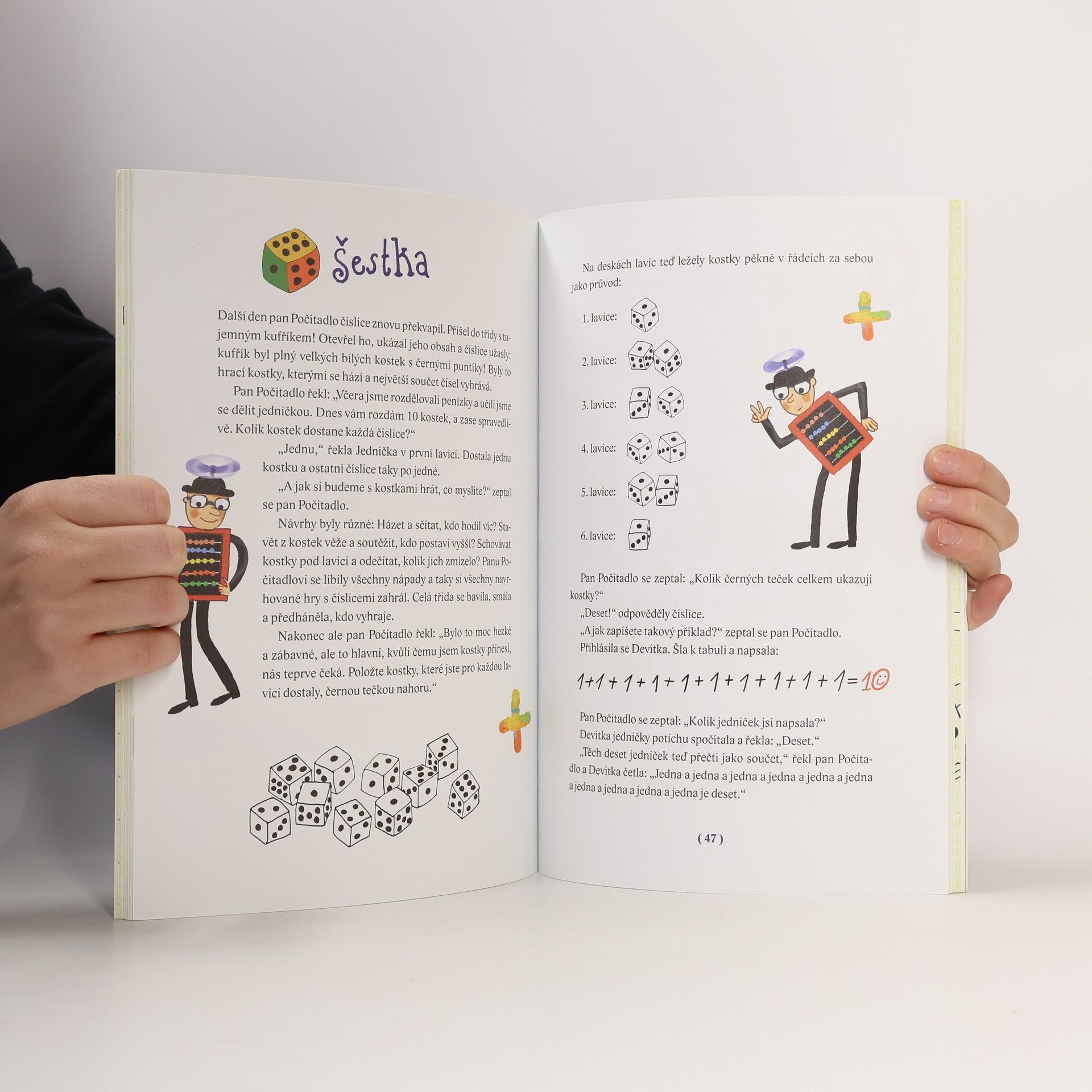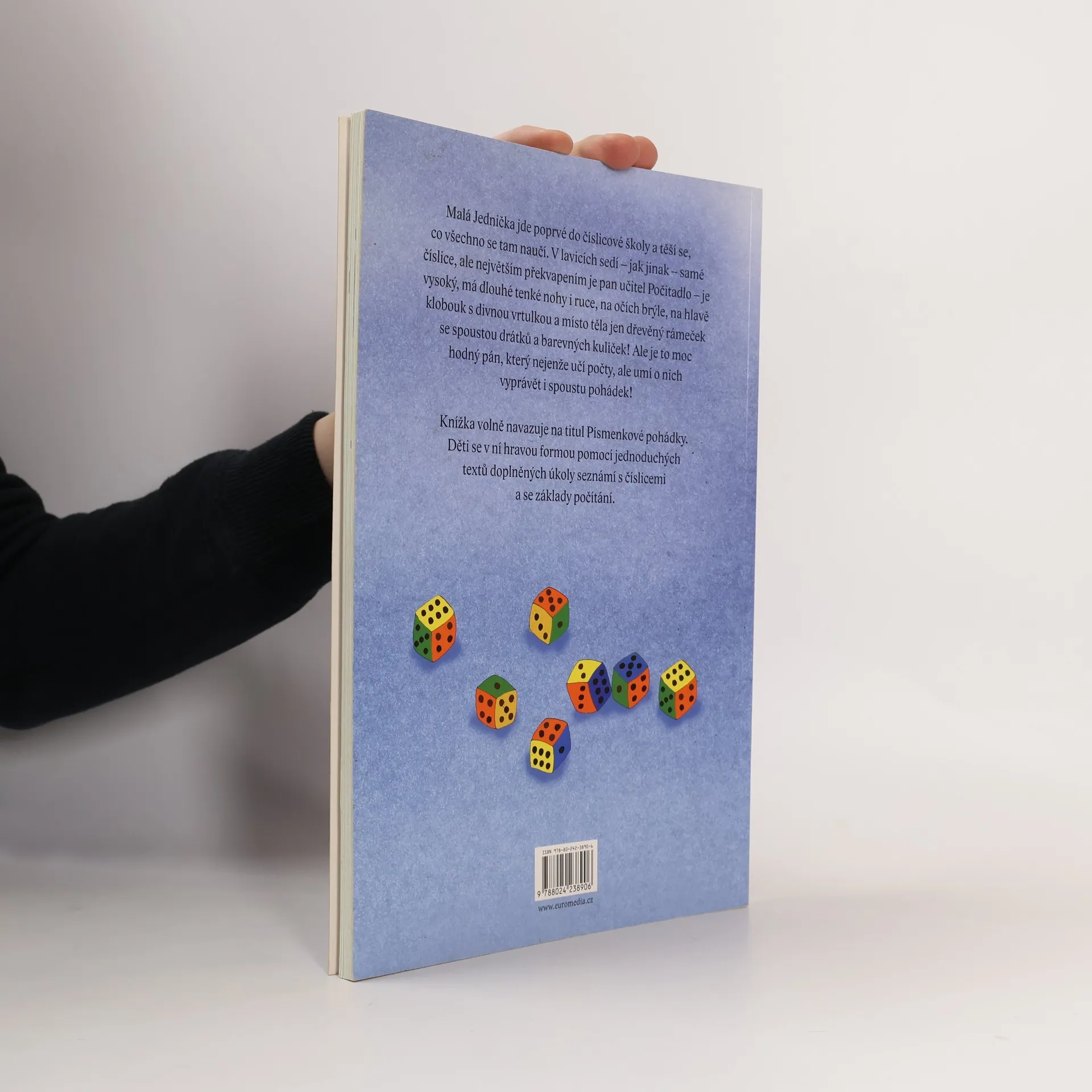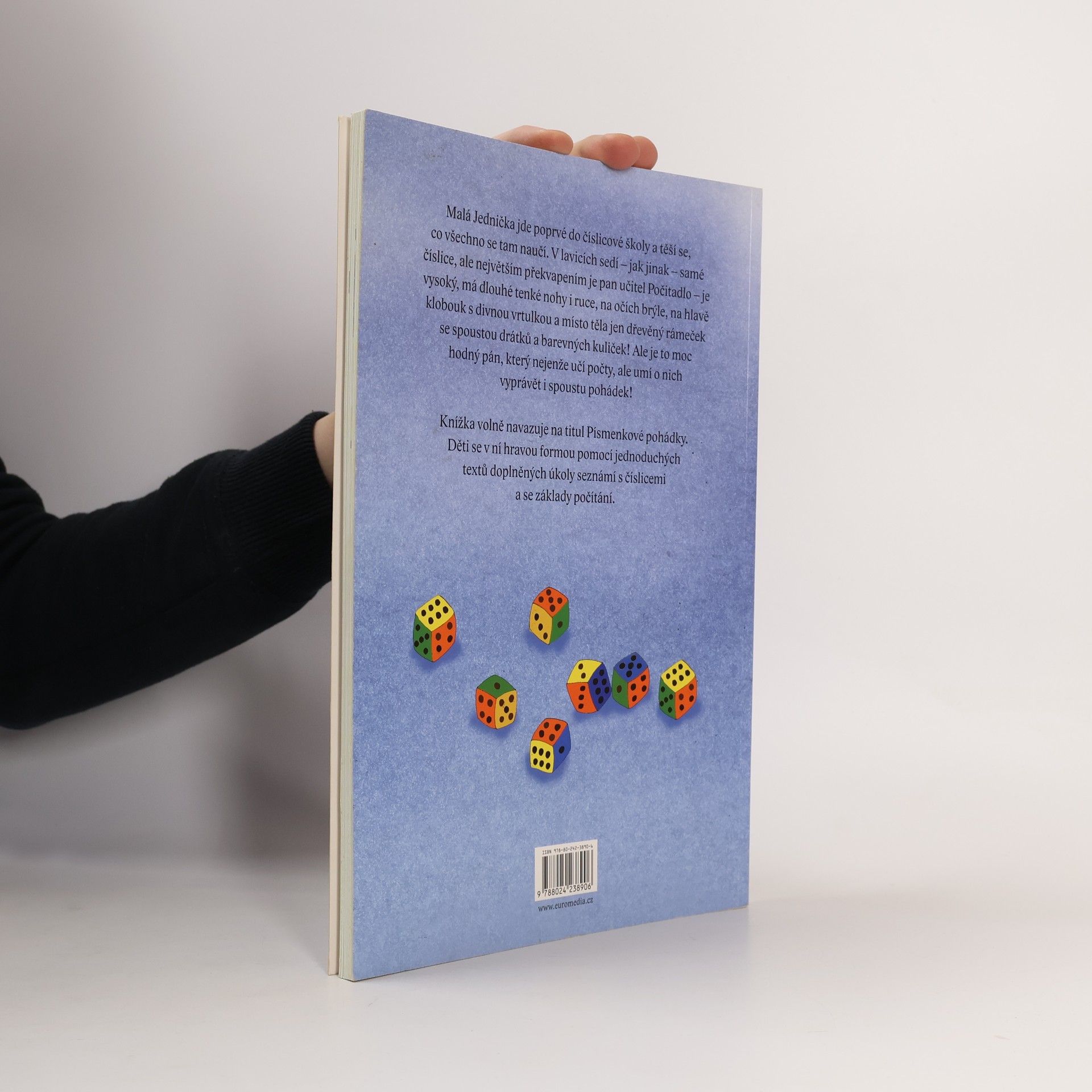 Malá Jednička jde poprvé do číslicové školy a těší se, co všechno se tam naučí. V lavicích sedí samé číslice, ale největším překvapením je pan učitel Počítadlo – je vysoký, má dlouhé tenké nohy i ruce, na očích brýle, na hlavě klobouk s divnou vrtulkou a místo těla jen dřevěný rámeček se spoustou drátků a barevných kuliček! Ale je to moc hodný pán, který nejenže učí počty, ale umí o nich vyprávět i spoustu pohádek! Bohatě ilustrovaná kniha volně navazuje na úspěšný titul Písmenkové pohádky. Děti se v ní hravou formou pomocí jednoduchých textů propojených s úkoly seznámí s číslicemi od jedné do dvaceti.
