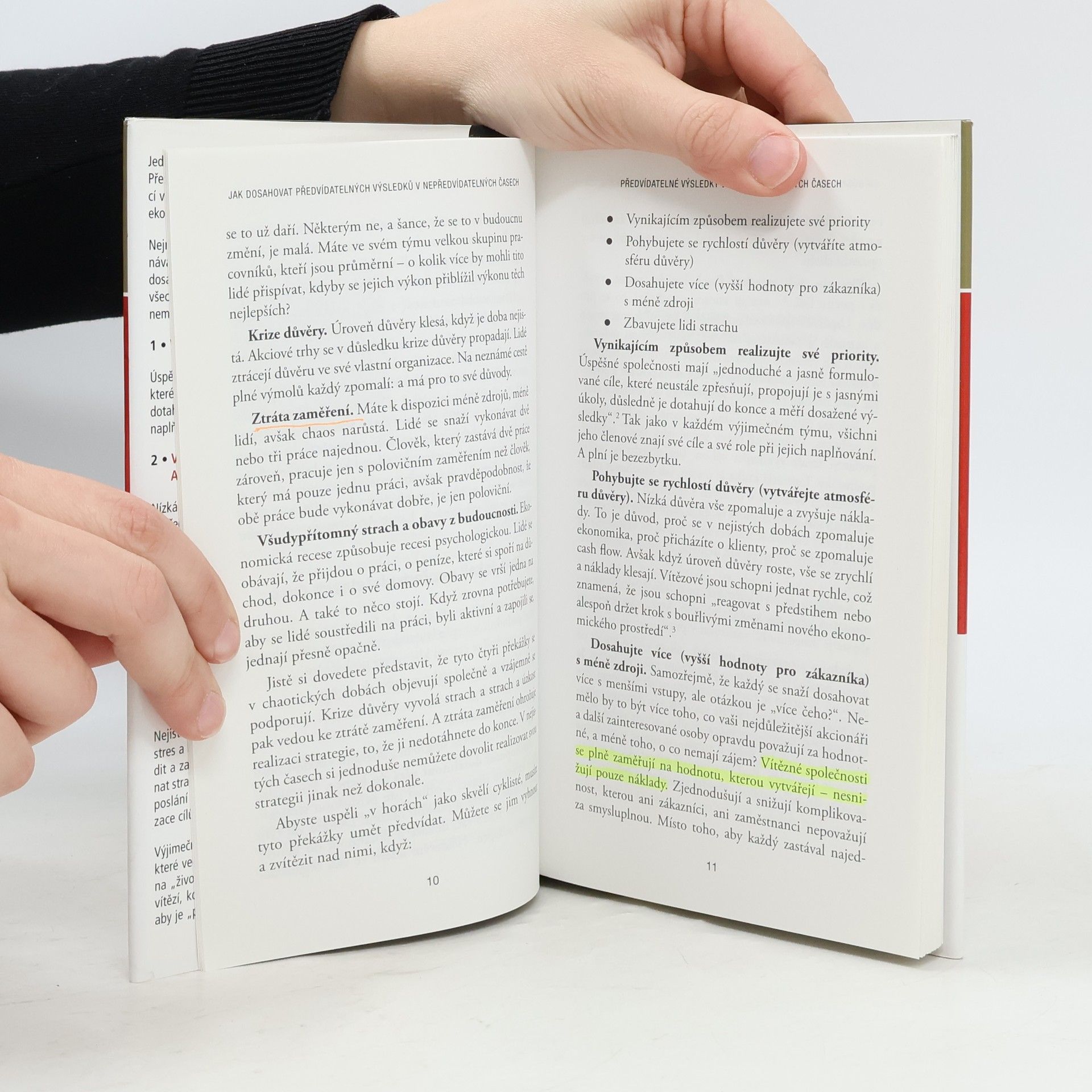 Jedinou věcí, kterou si můžeme v byznysu být jisti, je nejistota. S. R. Covey ve své nejnovější knize ukazuje, že přesto existují organizace, které – bez ohledu na nejisté ekonomické podmínky – dosahují předvídatelných (a skvělých!) výsledků tím, že se za všech okolností řídí čtyřmi klíčovými principy, které jsou trvalé a neměnné (dotahují věci do konce a vynikajícím způsobem realizují své priority, vytvářejí atmosféru důvěry, dosahují vyšší hodnoty s méně zdroji, nešíří strach).