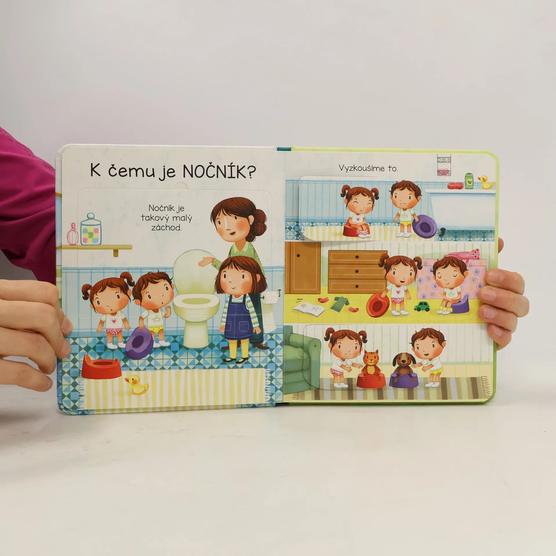 K čemu je nočník, proč ho potřebujeme a jak se používá? Velkou změnu v podobě přechodu na nočník můžete svému dítěti vysvětlit různě, například pomocí jednoduché knížky. Toto obrázkové leporelo s odklápěcími okénky je ideálním pomocníkem pro všechny malé děti, které se učí chodit na nočník. Půvabné ilustrace jsou doprovázeny jednoduchým textem, který něžně povzbuzuje dítě k přechodu z plen na nočník a posléze i na záchod. České vydání publikace nakladatelství Usborne.