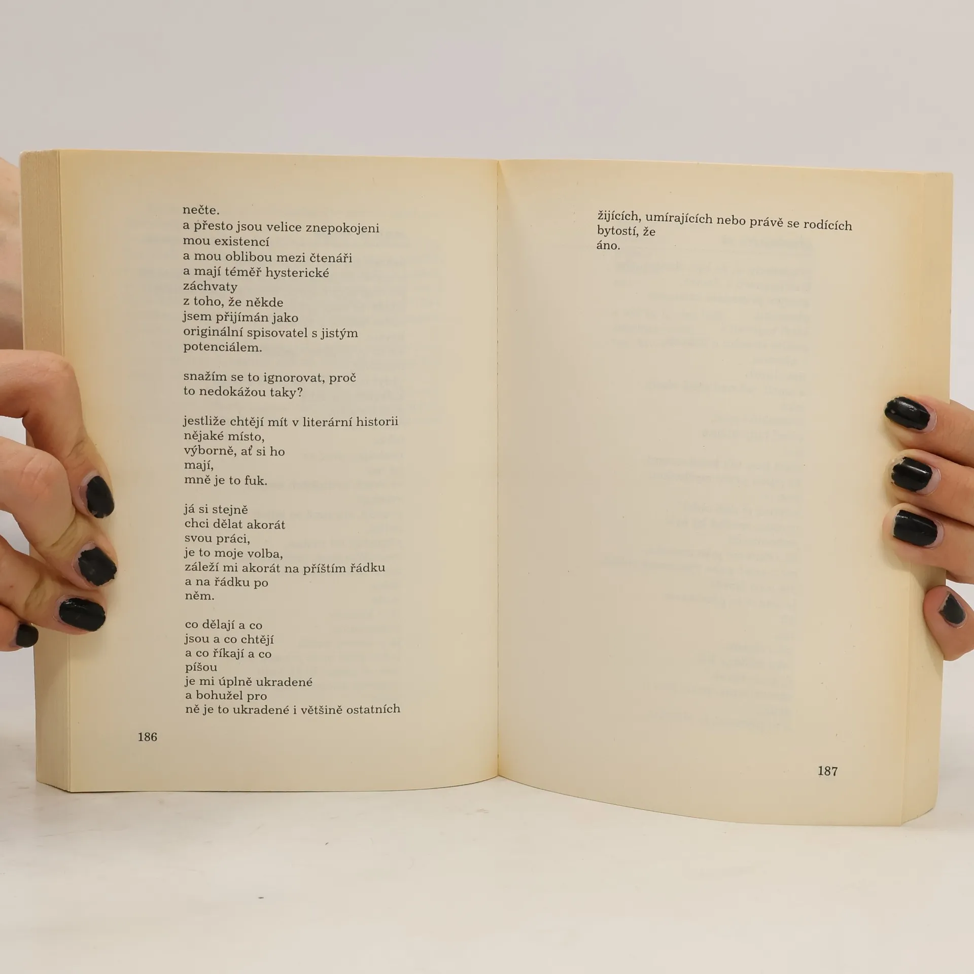 Tato posmrtně vydaná sbírka básní a povídek kultovního amerického spisovatele Charlese Bukowského patří k jeho bezkonkurenčně nejlepším a nejreprezentativnějším souborům. Více než stovka básní a půltucet povídek mapuje jeho vývoj od surreálně laděné poezie po sevřené epické útvary, básně-historky s nezbytně vtipnou či provokativní pointou. Svou otevřeností mohou Bukowského práce šokovat, na druhé straně jsou však nepochybně i určitou kritickou sondou vyslanou do života americké společnosti. Autor nemoralizuje ani se nepokouší podat hlubší výklad o tom, jakým zůsobem existují a žijí vrstvy, navyklé na životní stereotyp, v němž hraje hlavní roli sex, drogy a alkohol. Přesto i v tomto jeho pohledu se objevuje i charakteristická poetika, která Bukowskému zajistila mnohem větší počet příznivců než odpůrců.