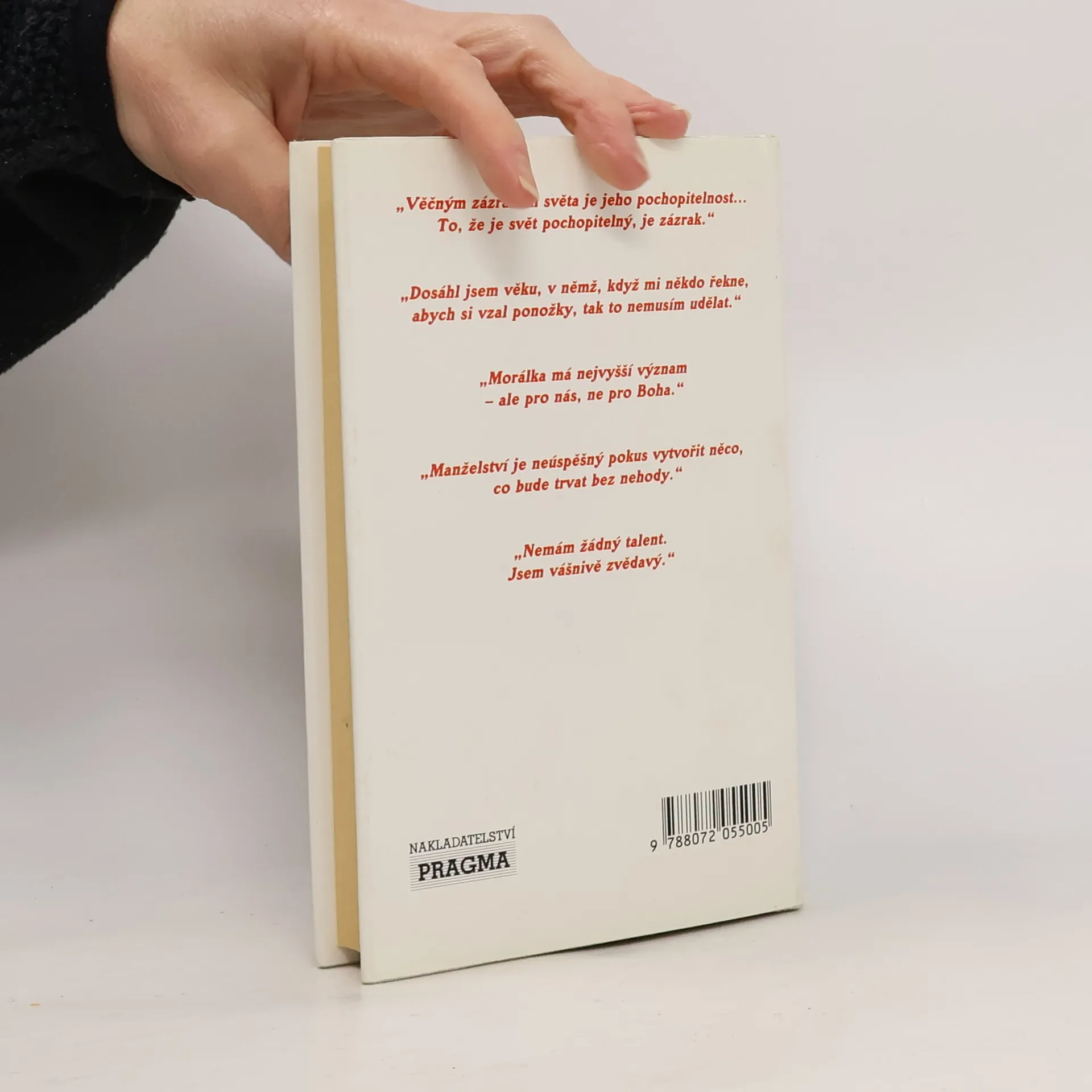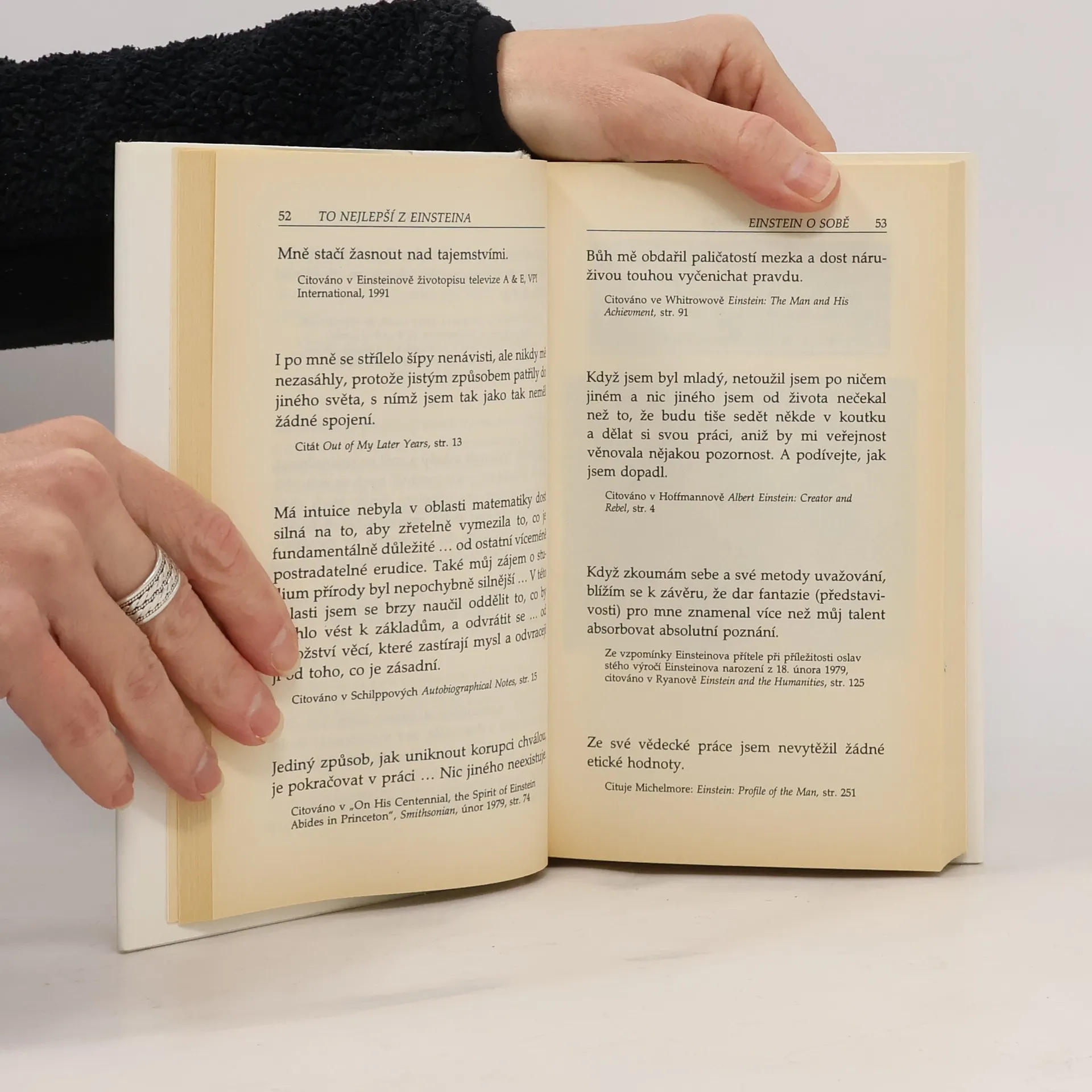 Tato sbírka přináší asi 550 citátů pronesených Einsteinem i týkajících se jeho osoby, které jsou poprvé shromážděny tématicky. Můžeme zde nalézt Einsteinovy myšlenky o Americčanech a Americe, o Němcích a o Německu, o Židech a sionismu, o válce a o míru, politice, víře, vědě i o osobnějších otázkách, jako jsou potraty, mládí a stáří, láska a manželství, hudba, domácí zvířata. Pro každého je zde něco, co ho potěší - i něco, co se ho dotkne. Čtenář objeví kapitoly věnované tomu, co Einstein řekl o jiných lidech, co řekli druzí o něm, dále obsahují biografické údaje a současný rodokmen, kde se objevují už i Einsteinova pravnoučata, odpovědi na nečastější otázky o Einsteinovi a vybranou bibliografii. Kniha je opatřena zasvěceným úvodním slovem princetonského fyzika Freemana Dysona. Sbírka uvádí dokumentaci - odkazuje především k hlavním pramenům jako Einsteinův archiv a Sebrané spisy Alberta Einsteina. Sbírka představuje Einsteina čtenářům z mhoha stránek - jednou popudivého, jindy laskavého, vřele vtipného i chladně odmítavého. Člověka, který byl zpočátku zmatený se slávy, kterou na něj svět naložil a který pak začal nenávidět lesk publicity. Vidíme také, jaké porodělal Einstein vývoj od prvího výroku sedmnáctiletého chlapce až k jeho posledním slovům, která pronesl ve svých sedmdesáti šesti letech.