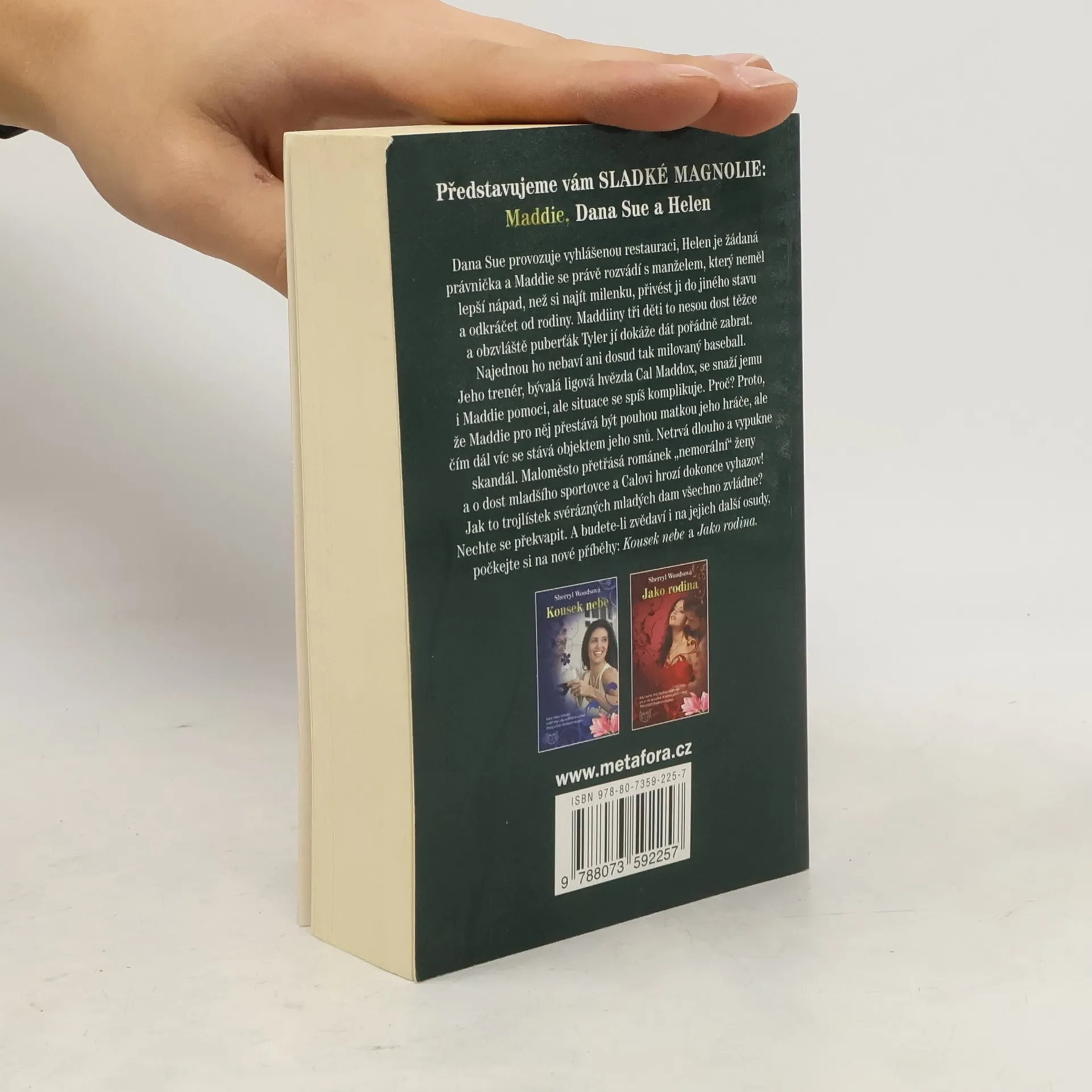 Série Sladké magnolie - 1. díl. Rozvodem všechno končí, nebo začíná? První příběh Sladkých magnolií… Víte, kdo jsou to Sladké magnolie? Tři kamarádky z malého města Serenity, kolem nichž to pořádně jiskří. Dana Sue provozuje vyhlášenou restauraci, Helen je žádaná právnička a Maddie se právě rozvádí se svým mužem, který neměl lepší nápad, než si najít milenku a odkráčet od rodiny. Místní trenér baseballu, bývalá ligová hvězda Cal Maddox, se snaží Maddie pomoci s jejím pubertálním synem, ale situaci jim trochu zkomplikuje láska. Maloměsto přetřásá skandál „nemorální ženy“ a Calovi hrozí dokonce vyhazov. Jak to všechno dopadne? Přece tak, jak má. A pokud budete zvědaví i na další osudy hrdinů, počkejte si na jejich nové příběhy…