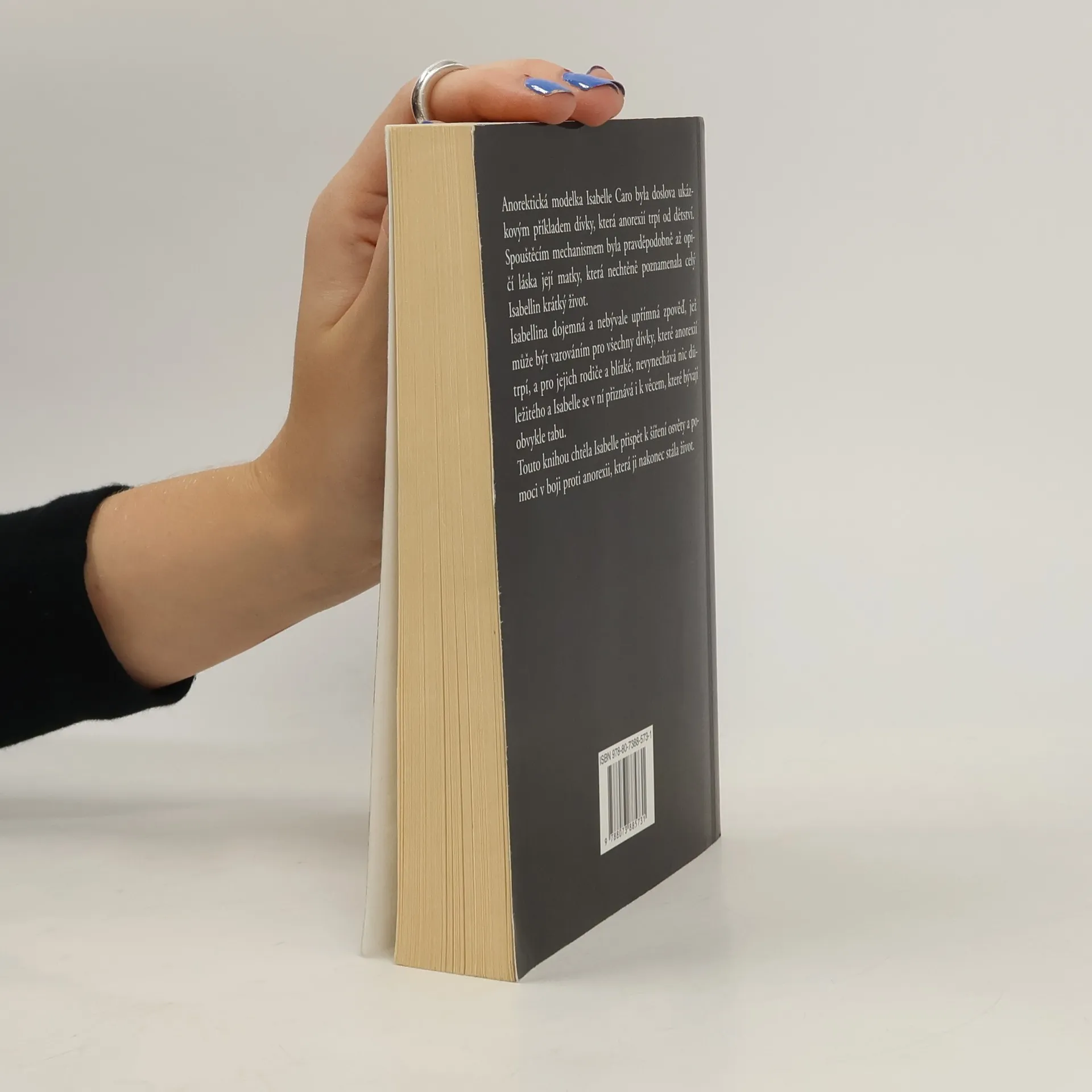 Její fotky obletěly celý svět, aby pomohly v boji s mentální anorexií. Isabelle Caro - modelka trpící touto nemocí pózovala na šokujících fotografiích Oliviera Toscaniho. Rozhodla se světu ukázat své tělo. Vyhublé až na kost, nahé… Její odvaha odhalit se rozdělila svět. Někteří ji i celou kampaň proti poruše příjmu potravy ocenili, jiní fotografie šmahem odsoudili a kampaň označili za příliš krutou. Nakonec se rozhodla svůj příběh sepsat. Příběh, kam až tato nemoc může zajít. Dva roky po jejím vydání modelka Isabelle Caro svůj boj prohrála. Zemřela ve věku 28 let.