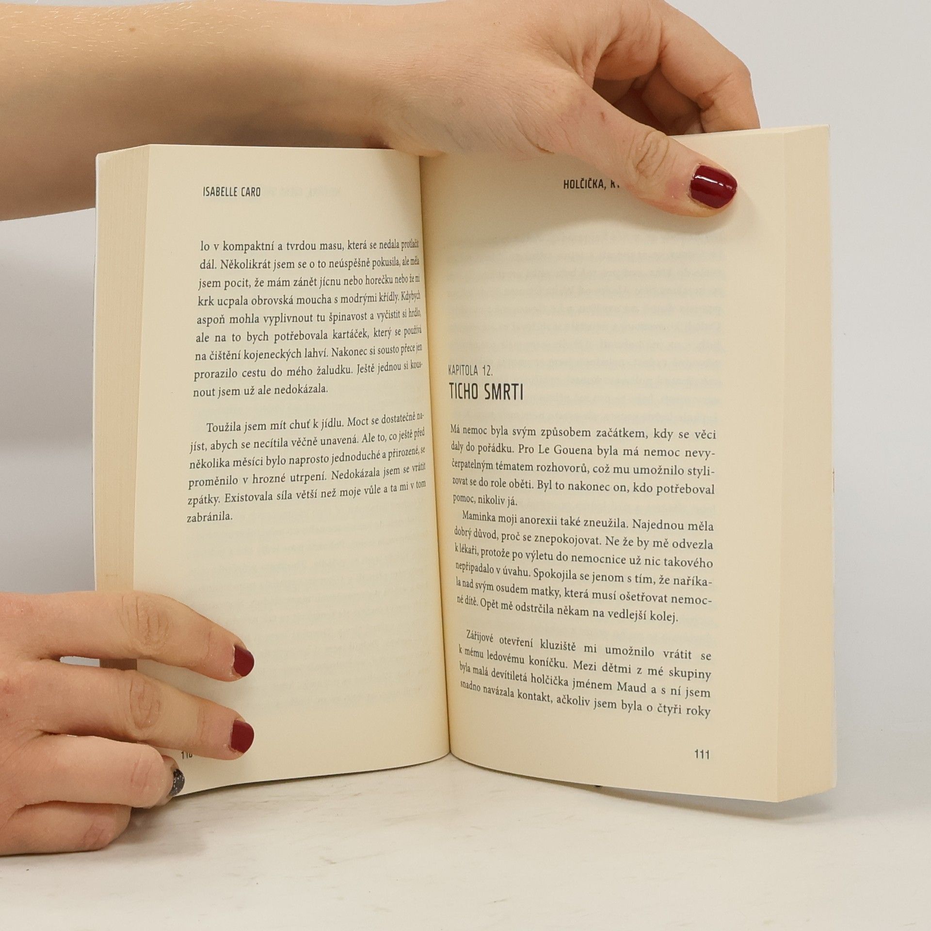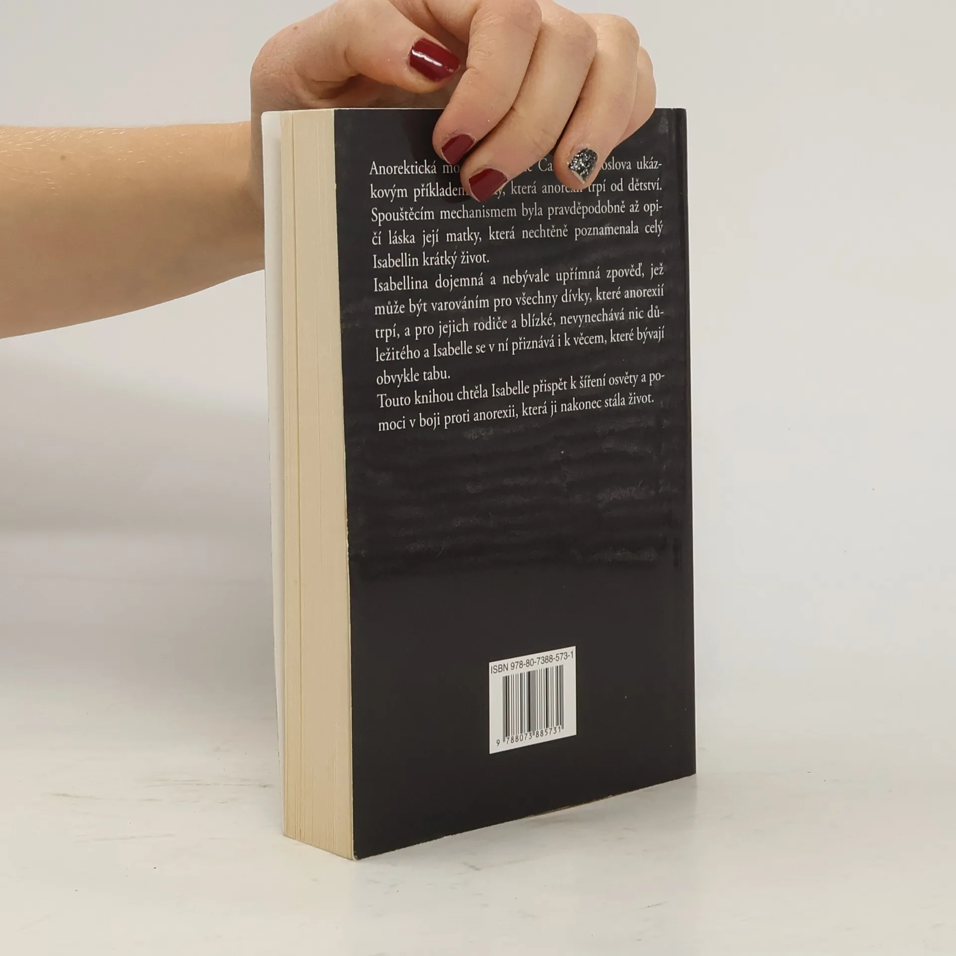 Její fotky obletěly celý svět, aby pomohly v boji s mentální anorexií. Isabelle Caro - modelka trpící touto nemocí pózovala na šokujících fotografiích Oliviera Toscaniho. Rozhodla se světu ukázat své tělo. Vyhublé až na kost, nahé… Její odvaha odhalit se rozdělila svět. Někteří ji i celou kampaň proti poruše příjmu potravy ocenili, jiní fotografie šmahem odsoudili a kampaň označili za příliš krutou. Nakonec se rozhodla svůj příběh sepsat. Příběh, kam až tato nemoc může zajít. Dva roky po jejím vydání modelka Isabelle Caro svůj boj prohrála. Zemřela ve věku 28 let.